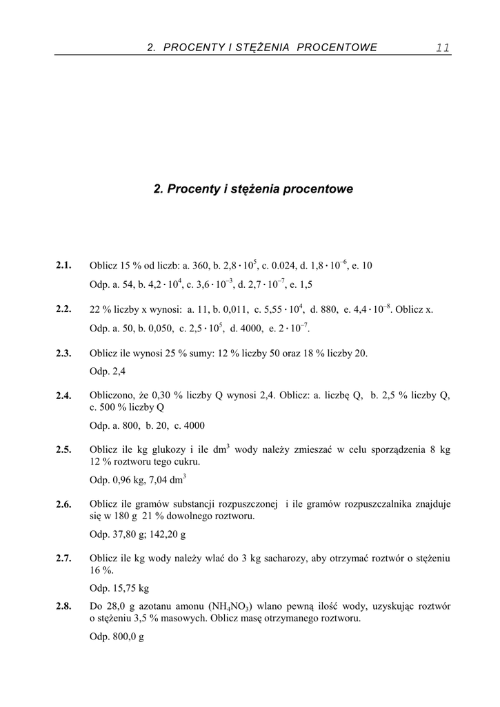 2. PROCENTY I STĘŻENIA PROCENTOWE 11 2. Procenty i stężenia procentowe 2.1. Oblicz 15 % od liczb: a. 360, b. 2,8·105, c. 0.024, d. 1,8·10–6, e. 10 Odp. a. 54, b. 4,2·104, c. 3,6·10–3, d. 2,7·10–7, e. 1,5 2.2. 22 % liczby x wynosi: a. 11, b. 0,011, c. 5,55·104, d. 880, e. 4,4·10–8. Oblicz x. Odp. a. 50, b. 0,050, c. 2,5·105, d. 4000, e. 2·10–7. 2.3. Oblicz ile wynosi 25 % sumy: 12 % liczby 50 oraz 18 % liczby 20. Odp. 2,4 2.4. Obliczono, że 0,30 % liczby Q wynosi 2,4. Oblicz: a. liczbę Q, b. 2,5 % liczby Q, c. 500 % liczby Q Odp. a. 800, b. 20, c. 4000 2.5. Oblicz ile kg glukozy i ile dm3 wody należy zmieszać w celu sporządzenia 8 kg 12 % roztworu tego cukru. Odp. 0,96 kg, 7,04 dm3 2.6. Oblicz ile gramów substancji rozpuszczonej i ile gramów rozpuszczalnika znajduje się w 180 g 21 % dowolnego roztworu. Odp. 37,80 g; 142,20 g 2.7. Oblicz ile kg wody należy wlać do 3 kg sacharozy, aby otrzymać roztwór o stężeniu 16 %. Odp. 15,75 kg 2.8. Do 28,0 g azotanu amonu (NH4NO3) wlano pewną ilość wody, uzyskując roztwór o stężeniu 3,5 % masowych. Oblicz masę otrzymanego roztworu. Odp. 800,0 g 12 2.9. Z AD A NI A Z C HE MI I W 450 gramach wody rozpuszczono 50 g CuSO4·5 H2O. Oblicz stężenie procentowe otrzymanego roztworu w stosunku do soli bezwodnej. Odp. 6,4 % 2.10. Oblicz ile gramów MgSO4·7H2O trzeba odważyć celem przygotowania 100 g roztworu 10 % w stosunku do soli bezwodnej. Odp. 20,48 g 2.11. Ile gramów Na2CrO4·10 H2O należy dodać do 200 g wody, aby sporządzony roztwór zawierał 5 % soli bezwodnej ? Odp. 21,12 g 2.12. Zmieszano 50 g roztworu zawierającego 20 % KCl ze 150 g 12 % roztworu tej soli. Jakie jest stężenie procentowe otrzymanego roztworu ? Odp. 14,0 % 2.13. W 2 kg wody rozpuszczono 250 g uwodnionego siarczanu sodu (Na 2SO4·10 H2O). Oblicz stężenie procentowe otrzymanego roztworu w stosunku do soli bezwodnej. Odp. 4,90 % 2.14. Zmieszano 150 g 12 % roztworu pewnej soli z 350 g 20 % roztworu tej soli. Oblicz stężenie procentowe tak przygotowanego roztworu. Odp. 17,60 g 2.15. Oblicz masę KOH zawartą w 250 cm3 roztworu o gęstości 1,15 g·cm 3, jeżeli jego stężenie procentowe wynosi 16,0 %. Odp. 46,0 g 2.16. Oblicz w jakiej objętości 30,0 % roztworu HNO3 o gęstości 1,18 g·cm 3 zawarte jest 6,0 g czystego składnika. Odp. 16,95 cm3 2.17. W jakiej objętości ługu sodowego (wodnego roztworu NaOH) o gęstości 1,37 g·cm 3 i stężeniu 37,7 % rozpuszczone jest 15,0 g wodorotlenku sodu ? Odp. 29,04 cm3 2.18. 150 cm3 32 % roztworu zawiera 56,8 g substancji rozpuszczonej. Jaka jest gęstość tego roztworu ? Odp. 1,18 g·cm 3 2. PROCENTY I STĘŻENIA PROCENTOWE 2.19. 13 Do 50 cm3 roztworu NaOH o gęstości 1,44 g·cm 3 i cp = 40,0 % wlano 200 cm3 roztworu 20,0 %, którego gęstość wynosiła 1,22 g·cm 3. Oblicz stężenie procentowe końcowego roztworu. Odp. 24,56 % 2.20. Oblicz ile kg technicznej sody żrącej (zawierającej 4,0 % zanieczyszczeń) należy odważyć celem przygotowania 50 dm3 roztworu NaOH o gęstości 1,111 g·cm 3 i stężeniu procentowym 10,0 %. Odp. 5,79 kg 2.21. Ile dm3 siarkowodoru (warunki normalne) należy rozpuścić w wodzie aby otrzymać 200 g 2,50 % kwasu ? Odp. 3,29 dm3 2.22. 75,0 g pewnej substancji organicznej rozpuszczono w 450 cm 3 eteru etylowego, którego gęstość wynosiła 0,72 g·cm 3. Oblicz stężenie procentowe otrzymanego roztworu. Odp. 18,80 % 2.23. 10 cm3 bromu Br2 o gęstości 3,12 g·cm 3 rozpuszczono w 200 cm3 czterochlorku węgla CCl4 (d=1,60 g·cm 3). Oblicz stężenie procentowe bromu w tak uzyskanym roztworze. Odp. 8,88 % 2.24. Ile dm3 wody należy odparować ze 100 kg 5,0 % roztworu pewnej soli, aby otrzymać roztwór o czterokrotnie wyższym stężeniu procentowym ? Odp. 75 dm3 2.25. Oblicz ile gramów wody należy odparować z 250 g roztworu glukozy o stężeniu 25 %, aby otrzymać 30 % roztwór tego cukru. Odp. 41,67 g 2.26. 100 cm3 roztworu NaOH o gęstości 1,33 g·cm 3 zawierającego 30,0 % NaOH rozcieńczono wodą uzyskując roztwór o stężeniu 4,8 %. Oblicz masę otrzymanego roztworu. Odp. 831,25 g 2.27. Oblicz ile cm3 20,0 % roztworu HNO3 o gęstości 1,115 g·cm 3 i ile dm3 wody należy zmieszać, aby otrzymać 10 kg 1,0 % roztworu tego kwasu. Odp. 448,4 cm3, 9,55 dm3 14 2.28. Z AD A NI A Z C HE MI I 50 cm3 96 % roztworu H2SO4 o gęstości 1,84 g·cm 3 wlano do pewnej objętości wody uzyskując roztwór o stężeniu 4,0 %. Oblicz objętość zużytej wody. Odp. 2,12 dm3 2.29. Ile gramów wody destylowanej należy dodać do 200 cm3 kwasu solnego o gęstości 1,05 g·cm 3 i stężeniu 10,0 %, aby otrzymać kwas o stężeniu 1,50 % ? Odp. 1190 g 2.30. Ile gramów jodku potasu należy dodać do 180 g jego 8 % roztworu, aby otrzymać roztwór o stężeniu 12 % ? Odp. 8,18 g 2.31. Oblicz ile gramów 30 % roztworu NaCl należy wlać do 300 g 5 % roztworu tej soli, aby uzyskać roztwór o stężeniu 10 % ? Odp. 75,0 g 2.32. Oblicz do ilu dm3 wody należy wlać 50 cm3 90 % roztworu kwasu siarkowego o gęstości 1,80 g·cm 3, aby uzyskać roztwór o stężeniu 5,0 %. Odp. 1,53 dm3 2.33. Ile dm3 wody należy dodać do 200 g pewnego środka ochrony roślin, aby uzyskać jego 0,25 % roztwór ? Odp. 79,8 dm3 2.34. Ile gramów 36 % roztworu pewnej substancji należy dodać do 300 gramów jej 10 % roztworu, aby otrzymać roztwór o stężeniu 12 % ? Odp. 25 g 2.35. Oblicz w jakim stosunku wagowym (masowym) należy zmieszać 96 % roztwór H 2SO4 z wodą destylowaną, aby uzyskany roztwór miał stężenie 10 %. Odp. 5 : 43 2.36. W jakim stosunku masowym należy zmieszać 48 % roztwór sacharozy z roztworem 12 %, aby otrzymany roztwór miał stężenie 28 % ? Odp. 4 : 5 2.37. Oblicz w jakim stosunku masowym należy zmieszać wodę z 50 % roztworem fruktozy, aby roztwór końcowy miał stężenie 16 %. Odp. 17 : 8 2. PROCENTY I STĘŻENIA PROCENTOWE 2.38. 15 W jakim stosunku masowym należy zmieszać dwa roztwory: 40 % i 12 %, aby końcowy roztwór miał stężenie 18 % ?