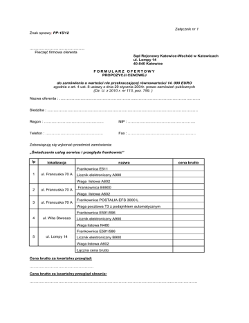 Załącznik nr 1 Znak sprawy: PP-15/12 …………………………………….. Pieczęć firmowa oferenta Sąd Rejonowy Katowice-Wschód w Katowicach ul. Lompy 14 40-040 Katowice FORMULARZ OFERTOWY PROPOZYCJI CENOWEJ do zamówienia o wartości nie przekraczającej równowartości 14. 000 EURO zgodnie z art. 4 ust. 8 ustawy z dnia 29 stycznia 2004r. prawo zamówień publicznych (Dz. U. z 2010 r. nr 113, poz. 759. ) Nazwa oferenta : ……………………..……………………………..……………………………………………. Siedziba : ………………………………………………………………………………………………………… Regon : ………………………………….…….. NIP : ……………….…………………………….. Telefon : ………………………………………. Fax : ……………………………………………… Zobowiązuję się wykonać przedmiot zamówienia: „Świadczenie usług serwisu i przeglądu frankownic” lp lokalizacja nazwa cena brutto Frankownica E511 1 ul. Francuska 70 A Licznik elektroniczny A900 Waga listowa A602 2 ul. Francuska 70 A Frankownica E6900 Waga listowa A602 3 ul. Francuska 70 A Frankownica POSTALIA EFS 3000 L Waga pocztowa T3 z podajnikiem automatycznym Frankownica E591/596 4 ul. Wita Stwosza Licznik elektroniczny A900 Waga listowa N480 Frankownica E581/586 5 ul. Lompy 14 Licznik elektroniczny B900 Waga listowa A602 Łączna cena brutto Cena brutto za kwartalny przegląd: …………………………………………… Cena brutto za kwartalny przegląd słownie: …………………………………………………………………………………………………..………………… Oświadczamy, że podana wyżej cena ofertowa zawiera w sobie wszelkie koszty związane z realizacją przedmiotu zamówienia, określone w zaproszeniu do składania ofert. 1. Deklarujemy następujące warunki realizacji zamówienia: • • • Akceptujemy warunki wskazane w zaproszeniu i we wzorze umowy. Oświadczamy, że uważamy się za związanych niniejszą ofertą przez okres 30 dni od daty złożenia oferty, Oświadczamy, że przyjmujemy do wiadomości fakt, iż Zamawiający zastrzega możliwość nie podpisania umowy z wykonawcą, który zaproponował najkorzystniejszą ofertą z uwagi na brak pozyskania środków finansowych na realizację zadania. ……………………….., dnia ……….….. 2012 r. ………………………………………………………………….. Miejscowość Podpis osoby (osób) upoważnionej do występowania w imieniu Wykonawcy ( Pożądany czytelny podpis albo podpis i pieczątka z imieniem i nazwiskiem ).