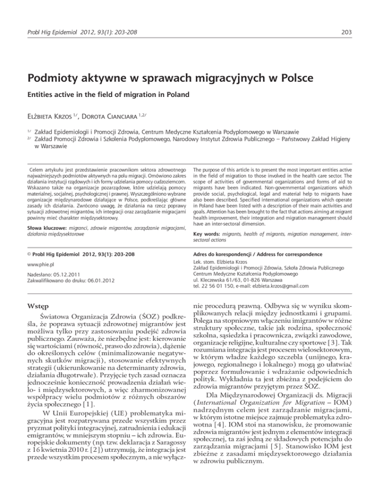 Krzos Hig Probl E, Cianciara Epidemiol D. 2012, Podmioty 93(1): aktywne 203-208 w sprawach migracyjnych w Polsce 203 Podmioty aktywne w sprawach migracyjnych w Polsce Entities active in the field of migration in Poland Elżbieta Krzos 1/, Dorota Cianciara 1,2/ Zakład Epidemiologii i Promocji Zdrowia, Centrum Medyczne Kształcenia Podyplomowego w Warszawie Zakład Promocji Zdrowia i Szkolenia Podyplomowego, Narodowy Instytut Zdrowia Publicznego – Państwowy Zakład Higieny w Warszawie 1/ 2/ Celem artykułu jest przedstawienie pracownikom sektora zdrowotnego najważniejszych podmiotów aktywnych na polu migracji. Omówiono zakres działania instytucji rządowych i ich formy udzielania pomocy cudzoziemcom. Wskazano także na organizacje pozarządowe, które udzielają pomocy materialnej, socjalnej, psychologicznej i prawnej. Wyszczególniono wybrane organizacje międzynarodowe działające w Polsce, podkreślając główne zasady ich działania. Zwrócono uwagę, że działania na rzecz poprawy sytuacji zdrowotnej migrantów, ich integracji oraz zarządzanie migracjami powinny mieć charakter międzysektorowy. Słowa kluczowe: migranci, zdrowie migrantów, zarządzanie migracjami, działania międzysektorowe © Probl Hig Epidemiol 2012, 93(1): 203-208 www.phie.pl Nadesłano: 05.12.2011 Zakwalifikowano do druku: 06.01.2012 Wstęp Światowa Organizacja Zdrowia (ŚOZ) podkreśla, że poprawa sytuacji zdrowotnej migrantów jest możliwa tylko przy zastosowaniu podejść zdrowia publicznego. Zauważa, że niezbędne jest: kierowanie się wartościami (równość, prawo do zdrowia), dążenie do określonych celów (minimalizowanie negatywnych skutków migracji), stosowanie efektywnych strategii (ukierunkowanie na determinanty zdrowia, działania długotrwałe). Przyjęcie tych zasad oznacza jednocześnie konieczność prowadzenia działań wielo- i międzysektorowych, a więc zharmonizowanej współpracy wielu podmiotów z różnych obszarów życia społecznego [1]. W Unii Europejskiej (UE) problematyka migracyjna jest rozpatrywana przede wszystkim przez pryzmat polityki integracyjnej, zatrudnienia i edukacji emigrantów, w mniejszym stopniu – ich zdrowia. Europejskie dokumenty (np. tzw. deklaracja z Saragossy z 16 kwietnia 2010 r. [2]) utrzymują, że integracja jest przede wszystkim procesem społecznym, a nie wyłącz- The purpose of this article is to present the most important entities active in the field of migration to those involved in the health care sector. The scope of activities of governmental organizations and forms of aid to migrants have been indicated. Non-governmental organizations which provide social, psychological, legal and material help to migrants have also been described. Specified international organizations which operate in Poland have been listed with a description of their main activities and goals. Attention has been brought to the fact that actions aiming at migrant health improvement, their integration and migration management should have an inter-sectoral dimension. Key words: migrants, health of migrants, migration management, intersectoral actions Adres do korespondencji / Address for correspondence Lek. stom. Elżbieta Krzos Zakład Epidemiologii i Promocji Zdrowia, Szkoła Zdrowia Publicznego Centrum Medyczne Kształcenia Podyplomowego ul. Kleczewska 61/63, 01-826 Warszawa tel. 22 56 01 150, e-mail: [email protected] nie procedurą prawną. Odbywa się w wyniku skomplikowanych relacji między jednostkami i grupami. Polega na stopniowym włączeniu imigrantów w różne struktury społeczne, takie jak rodzina, społeczność szkolna, sąsiedzka i pracownicza, związki zawodowe, organizacje religijne, kulturalne czy sportowe [3]. Tak rozumiana integracja jest procesem wielosektorowym, w którym władze każdego szczebla (unijnego, krajowego, regionalnego i lokalnego) mogą go ułatwiać poprzez formułowanie i wdrażanie odpowiednich polityk. Wykładnia ta jest zbieżna z podejściem do zdrowia migrantów przyjętym przez ŚOZ. Dla Międzynarodowej Organizacji ds. Migracji (International Organization for Migration – IOM) nadrzędnym celem jest zarządzanie migracjami, w którym istotne miejsce zajmuje problematyka zdrowotna [4]. IOM stoi na stanowisku, że promowanie zdrowia migrantów jest jednym z elementów integracji społecznej, ta zaś jedną ze składowych potencjału do zarządzania migracjami [5]. Stanowisko IOM jest zbieżne z zasadami międzysektorowego działania w zdrowiu publicznym. 204 Probl Hig Epidemiol 2012, 93(1): 203-208 W Polsce w kwietniu 2011 r. przekazano do konsultacji społecznych dokument na temat nowej polityki migracyjnej. Opracowanie liczy 132 strony i zawiera 11 rozdziałów. Słowo „zdrowie” wymienione jest tylko raz: „Również kompetencje w obszarze migracji, odnoszące się do zagadnień takich, jak: edukacja, zdrowie publiczne, bezpieczeństwo państwa, finanse i gospodarka powinny zostać zachowane przez poszczególne resorty właściwe w ww. sprawach”. Słowo „zdrowia” występuje 9 razy, przy czym najważniejsze jest sformułowanie: „Generalnie celem integracji powinno być umożliwienie imigrantom samodzielnej egzystencji pozwalającej na korzystanie z rynku pracy, systemów edukacji i służby zdrowia…” [6]. Problematyką ściśle migracyjną zajmują się w Polsce instytucje i agendy rządowe, organizacje pozarządowe, a także międzynarodowe. Można oczekiwać, że w debacie eksperckiej na temat polityki migracyjnej weźmie udział wiele podmiotów i przedstawiciele wszystkich sektorów społecznych, zgodnie z duchem współpracy międzysektorowej. Prawdopodobny jest udział sektora zdrowotnego, zwłaszcza instytucji i pracowników zdrowia publicznego. Celem artykułu jest przedstawienie pracownikom sektora zdrowotnego najważniejszych podmiotów aktywnych na polu migracji w Polsce oraz zakresu ich kompetencji i działania. Instytucje rządowe Departament Polityki Migracyjnej w MSWiA (DPM w MS