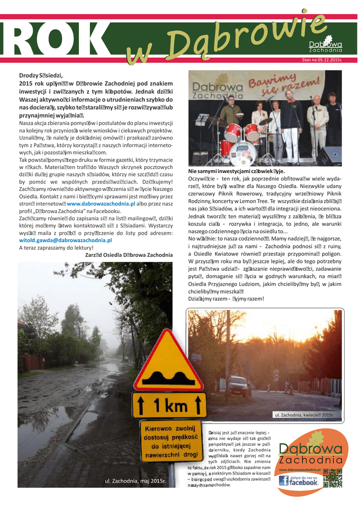 Stan na 05.12.2015r. Drodzy Sąsiedzi, 2015 rok upłynął w Dąbrowie Zachodniej pod znakiem inwestycji i związanych z tym kłopotów. Jednak dzięki Waszej aktywności informacje o utrudnieniach szybko do nas docierały, szybko też staraliśmy się je rozwiązywać lub przynajmniej wyjaśniać. Nasza akcja zbierania pomysłów i postulatów do planu inwestycji na kolejny rok przyniosła wiele wniosków i ciekawych projektów. Uznaliśmy, że należy je dokładniej omówić i przekazać zarówno tym z Państwa, którzy korzystają z naszych informacji internetowych, jak i pozostałym mieszkańcom. Tak powstał pomysł tego druku w formie gazetki, który trzymacie w rękach. Materiał ten trafił do Waszych skrzynek pocztowych dzięki dużej grupie naszych sąsiadów, którzy nie szczędzą czasu by pomóc we wspólnych przedsięwzięciach. Dziękujemy! Zachęcamy również do aktywnego włączenia się w życie Naszego Osiedla. Kontakt z nami i bieżącymi sprawami jest możliwy przez stronę internetową www.dabrowazachodnia.pl albo przez nasz profil „Dąbrowa Zachodnia” na Facebooku. Zachęcamy również do zapisania się na listę mailingową, dzięki której możemy łatwo kontaktować się z Sąsiadami. Wystarczy wysłać maila z prośbą o przyłączenie do listy pod adresem: [email protected] A teraz zapraszamy do lektury! Zarząd Osiedla Dąbrowa Zachodnia Nie samymi inwestycjami człowiek żyje. Oczywiście - ten rok, jak poprzednie obfitował w wiele wydarzeń, które były ważne dla Naszego Osiedla. Niezwykle udany czerwcowy Piknik Rowerowy, tradycyjny wrześniowy Piknik Rodzinny, koncerty w Lemon Tree. Te wszystkie działania zbliżają nas jako Sąsiadów, a ich wartość dla integracji jest nieoceniona. Jednak tworząc ten materiał, wyszliśmy z założenia, że bliższa koszula ciału - rozrywka i integracja, to jedno, ale warunki naszego codziennego życia na osiedlu to... No właśnie: to nasza codzienność. Mamy nadzieję, że najgorsze, i najtrudniejsze już za nami - Zachodnia podnosi się z ruiny, a Osiedle Kwiatowe również przestaje przypominać poligon. W przyszłym roku ma być jeszcze lepiej, ale do tego potrzebny jest Państwa udział - zgłaszanie nieprawidłowości, zadawanie pytań, domaganie się życia w godnych warunkach, na miarę Osiedla Przyjaznego Ludziom, jakim chcielibyśmy być, w jakim chcielibyśmy mieszkać! Działajmy razem - żyjmy razem! ul. Zachodnia, kwiecień 2015r. ul. Zachodnia, maj 2015r. Dzisiaj jest już znacznie lepiej zima nie wydaje się tak groźną perspektywą jak jeszcze w październiku, kiedy Zachodnia wyglądała nawet gorzej niż na tych zdjęciach. Nie zmienia to faktu, że rok 2015 głęboko zapadnie nam w pamięć, a niektórym Sąsiadom w kieszeń - biorąc pod uwagę uszkodzenia zawieszeń naszych samochodów.