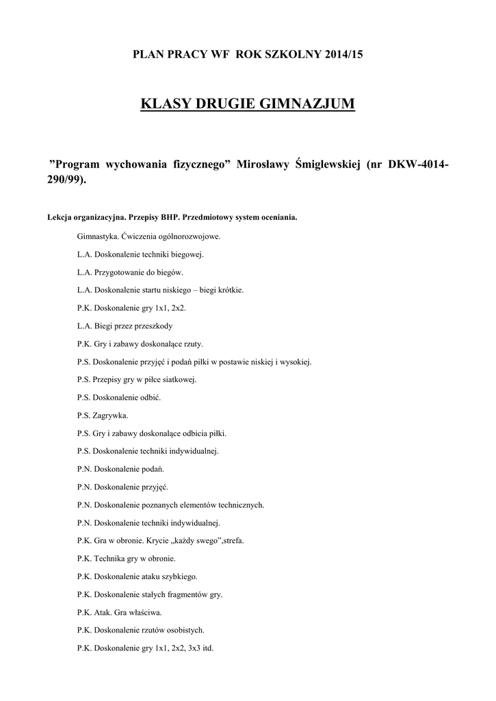PLAN PRACY WF ROK SZKOLNY 2014/15 KLASY DRUGIE GIMNAZJUM ”Program wychowania fizycznego” Mirosławy Śmiglewskiej (nr DKW-4014290/99). Lekcja organizacyjna. Przepisy BHP. Przedmiotowy system oceniania. Gimnastyka. Ćwiczenia ogólnorozwojowe. L.A. Doskonalenie techniki biegowej. L.A. Przygotowanie do biegów. L.A. Doskonalenie startu niskiego – biegi krótkie. P.K. Doskonalenie gry 1x1, 2x2. L.A. Biegi przez przeszkody P.K. Gry i zabawy doskonalące rzuty. P.S. Doskonalenie przyjęć i podań piłki w postawie niskiej i wysokiej. P.S. Przepisy gry w piłce siatkowej. P.S. Doskonalenie odbić. P.S. Zagrywka. P.S. Gry i zabawy doskonalące odbicia piłki. P.S. Doskonalenie techniki indywidualnej. P.N. Doskonalenie podań. P.N. Doskonalenie przyjęć. P.N. Doskonalenie poznanych elementów technicznych. P.N. Doskonalenie techniki indywidualnej. P.K. Gra w obronie. Krycie „każdy swego”,strefa. P.K. Technika gry w obronie. P.K. Doskonalenie ataku szybkiego. P.K. Doskonalenie stałych fragmentów gry. P.K. Atak. Gra właściwa. P.K. Doskonalenie rzutów osobistych. P.K. Doskonalenie gry 1x1, 2x2, 3x3 itd. Korzyści zdrowotne wynikające z uprawiania sportu. P.K. Doskonalenie poznanych elementów technicznych. P.K. Doskonalenie poznanych elementów taktycznych. Gimnastyka. Nauka poprawnego wykonywania podstawowych ćwiczeń gimnastycznych. Gry i zabawy skocznościowe P.S. Doskonalenie poznanych elementów we fragmentach gry P.S. Doskonalenie przyjęcia zagrywki P.S. Gra właściwa P.S. Gry i zabawy doskonalące odbicia piłki P.S. Doskonalenie zagrywki sposobem dolnym i górnym. P.S. Gry i zabawy doskonalące zagrywkę. P.S. Doskonalenie elementów technicznych. P.N. Gra 1x1, 2x2, 3x3 itd. P.N. Doskonalenie prowadzenia piłki. P.N Formy prowadzenia piłki. P.N. Doskonalenie zwodów z piłką. P.N. Przepisy obowiązujące podczas gry w piłkę nożną – spalony, rzut wolny pośredni i rzut wolny bezpośredni. P.N. Uderzenia piłki. P.N. Doskonalenie uderzeń i wrzutów. P.N. Doskonalenie elementów technicznych. P.K. Gry i zabawy doskonalące rzuty. P.K. Gry i zabawy doskonalące chwyty, podania i kozłowanie. P.K. Doskonalenie rzutu z biegu. P.K. Zbieranie piłki z tablicy w polu obrony. P.K. Doskonalenie stałych fragmentów gry. P.K. Zbieranie piłki. P.K. Doskonalenie stałych fragmentów gry. Zabawy i gry rozwijające siłę. Zabawy i gry ruchowe rozwijające zwinność. Próba gibkości Unihokej. Doskonalenie prowadzenia krążka kijem hokejowym. Unihokej. Technika strzału na bramkę. Gimnastyka. Samodzielne prowadzenie ćwiczeń - mięśni brzucha i mięśni grzbietu. P.K. Doskonalenie techniki indywidualnej w formie zabawowej. Gimnastyka. Doskonalenie skoków. P.S. Nauka sędziowania. P.S. Doskonalenie odbić. P.S. Doskonalenie zagrywki. P.S.P.S. Doskonalenie stałych fragmentów gry . P.S. Doskonalenie zbicia piłki. P.N. Doskonalenie poruszania się po boisku. P.N. Nauka wykonywania stałych fragmentów – rzuty wolne, rzuty rożne, rzuty karne. P.N. Doskonalenie gry 1x1. 2X2, 3x3 itd. P.K. Gra uproszczona. P.K. Doskonalenie rzutu z biegu. P.K. Gra właściwa. P.K. Doskonalenie rzutów po podaniu. P.K. Doskonalenie stałych fragmentów gry. P.K. Zbieranie piłki z tablicy. Wypadki i urazy podczas wykonywania ćwiczeń. T.S. Przepisy gry (singiel, debel). T.S. Doskonalenie podstawowych odbić piłeczki – forhand , backhand. T.S. Doskonalenie zagrywki. P.S. Doskonalenie przyjęcia zagrywki. P.S. Doskonalenie zagrywki i jej przyjęcia. P.S. Doskonalenie wystawiania piłki. P.S. Gra właściwa. P.S. Doskonalenie zagrywki i jej przyjęcia. P.N. Doskonalenie prawidłowej rozgrzewki gimnastyczno – biegowej. P.N. Gra bramkarza – formy poruszania się po boisku. P.N. Przepisy obowiązujące podczas gry w piłkę nożną. P.N. Doskonalenie chwytów piłki oburącz. P.N. Doskonalenie poznanych elementów technicznych. P.N. Doskonalenie techniki indywidualnej w grze szkolnej. P.K. Przepisy gry. P.K. Doskonalenie stałych fragmentów gry. P.K. Technika gry w obronie. P.K. Doskonalenie rzutu z biegu. P.K. Doskonalenie chwytów i podań. Jak zapobiegać wypadkom i urazom w czasie lekcji wf. L.A. Skoku wzwyż. P.R. Doskonalenie gry w obronie – blokowanie piłki. L.A. Doskonalenie skoku wzwyż. Gimnastyka. Doskonalenie kucznego przez przeszkody. P.S. Doskonalenie poznanych elementów. P.S. Doskonalenie zagrywki sposobem dolnym i górnym. P.S. Doskonalenie wystawiania i rozgrywania piłki. P.S. Doskonalenie zagrywki sposobem dolnym i górnym. P.S. Doskonalenie techniki indywidualnej. P.S. Doskonalenie przyjęcia piłki. P.N. Doskonalenie techniki piłki nożnej w grach rekreacyjnych P.N. Kształtowanie koordynacji ruchowej w ćwiczeniach z piłką. P.N. Doskonalenie zwodów bez piłki. G P.N. Doskonalenie zwodów z piłką. P.N. Doskonalenie strzału na bramkę. P.N. Doskonalenie techniki piłki nożnej w formie gier i zabaw. P.N. Doskonalenie techniki indywidualnej w formie zabawowej. P.N. Doskonalenie form żonglerki. P.K. Nauka ataku szybkiego. P.K. Doskonalenie ataku szybkiego w formie zabawowej. P.K. Doskonalenie ataku szybkiego. P.K. Doskonalenie stałych fragmentów gry. P.K. Obrona. P.K. Doskonalenie stałych fragmentów gry. P.K. Gra właściwa. Doskonalenie sędziowania. P.R. Doskonalenie podań i chwytów piłki w dwójkach i trójkach . P.R. Doskonalenie zwodów bez piłki i z piłką. Zasada systematyczności w sporcie. P.R. Doskonalenie rzutu piłki po przeskoku. P.K. Doskonalenie techniki indywidualnej. P.K. Doskonalenie ataku szybkiego. P.N. Doskonalenie przyjęć piłki udem ,klatką piersiową i głową – z ziemi i w wyskoku. P.S. Gry i zabawy – zagrywka. P.S Gry i zabawy – doskonalenie odbić P.S. Gry i zabawy – zagrywka. Gimnastyka. Nauka zwisu. Gimnastyka. Ćwiczenia wzmacniające mięśnie. Zasady higieny na co dzień. Zabawy i gry rozwijające siłę. Gry zespołowe wg inwencji ucznia. L.A. Próba skoczności – skok w dal z miejsca obunóż. P.K. D