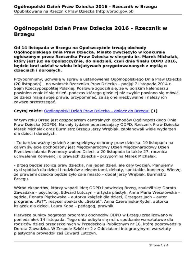 Ogólnopolski Dzień Praw Dziecka 2016 - Rzecznik w Brzegu Opublikowane na Rzecznik Praw Dziecka (http://brpd.gov.pl) Ogólnopolski Dzień Praw Dziecka 2016 - Rzecznik w Brzegu Od 14 listopada w Brzegu na Opolszczyźnie trwają obchody Ogólnopolskiego Dnia Praw Dziecka. Miasto zwyciężyło w konkursie ogłoszonym przez Rzecznika Praw Dziecka w sierpniu br. Marek Michalak, który jest już na Opolszczyźnie, do niedzieli, czyli dnia finału ODPD 2016, będzie brał udział w wielu inicjatywach przygotowananych z myślą o dzieciach i dorosłych. Przypomnijmy, uchwałę w sprawie ustanowienia Ogólnopolskiego Dnia Praw Dziecka (20 listopada) – na wniosek Rzecznika Praw Dziecka – podjął 7 listopada 2014 r. Sejm Rzeczypospolitej Polskiej. Posłowie zgodzili się, że w polskim kalendarzu powinien znaleźć się dzień, podczas którego głośniej niż zwykle powinno się mówić, że dzieci mają swoje prawa, przypominać, że są one niezbywalne i należy ich zawsze przestrzegać. Czytaj także: Ogólnopolski Dzień Praw Dziecka – dołącz do Brzegu! [1] W tym roku Brzeg jest gospodarzem centralnych obchodów Ogólnopolskiego Dnia Praw Dziecka (ODPD). Na cały tydzień poprzedzający ODPD, Rzecznik Praw Dziecka Marek Michalak oraz Burmistrz Brzegu Jerzy Wrębiak, zaplanowali wiele wydarzeń dla dzieci i dorosłych. - To bardzo ważny tydzień z perspektywy ochrony praw dziecka. 19 listopada na całym świecie obchodzony jest Międzynarodowy Dzień Międzynarodowy Dzień Przeciwdziałania Przemocy wobec Dzieci, a 20 listopada to także 27. rocznica uchwalenia Konwencji o prawach dziecka – przypomina Marek Michalak. - Brzeg będzie stolicą praw dziecka, nie jeden dzień, ale cały tydzień. Planujemy cykl spotkań dla dzieci i rodziców z ekspertami, debaty, spektakle, koncerty. Wierzę, że prawami dziecka będzie żyło całe miasto – dodał Jerzy Wrębiak, Burmistrz Brzegu. Wśród ekspertów, którzy wsparli ideę ODPD i odwiedzą Brzeg, znaleźli się: Dorota Zawadzka – psycholog, Edward Lutczyn – artysta plastyk, Anna Maria Wesołowska – sędzia, Renata Piątkowska – autorka książek dla dzieci, Grzegorz Jach – autor programu „PaT”, reżyser spektaklu „Sekret”, Anna Czerwińska-Rydel, autorka książek dla dzieci, Laura Koba – pedagog, prawnik. Pierwsze punkty bogatego programu obchodów ODPD w Brzegu zrealizowano w poniedziałek 14 listopada. Tego dnia odbyło się m.in. spotkanie warsztatowe dla rodziców dzieci przedszkolnych w Przedszkolu Publicznym nr 10, które poprowadziła Dorota Zawadzka. W Zespole Szkół nr 2 z Oddziałami Integracyjnymi warsztaty plastyczne prowadził zaś Edward Lutczyn. Strona 1 z 4 Ogólnopolski Dzień Praw Dziecka 2016 - Rzecznik w Brzegu Opublikowane na Rzecznik Praw Dziecka (http://brpd.gov.pl) Na środę (16 listopada) zaplanowano sesję naukową dla szkół gimnazjalnych, której gościem specjalnym będzie Rzecznik Praw Dziecka Marek Michalak orazsędzia Anna Maria Wesołowska. Tego dnia w Oddziale dla Dzieci Miejskiej Biblioteki Publicznej w Brzegu odbędzie się spotkanie autorskie z Anną Czerwińską-Rydel – autorką książek dla dzieci i młodzieży (start o g. 17:00, wstęp wolny). W czwartek 17 listopada w Oddziale dla Dzieci Miejskiej Biblioteki Publicznej w Brzegu odbędzie się spotkanie warsztatowe dla rodziców dzieci 0-3, które poprowadzi Dorota Zawadzka (start o g. 15:30). W Zespole Szkół nr 1 z Oddziałami Sportowymi odbędzie się tego dnia spotkanie autorskie z Renatą Piątkowską. W czwartkowe popołudnie zaś (o g. 17:00) w Brzeskim Centrum Kultury wystawiony zostanie spektakl „Był taki dom” w wykonaniu dzieci, młodzieży i dorosłych z BCK i Zespołu Szkół nr 2 z Oddziałami Integracyjnymi. Po spektaklu odbędzie się otwarte spotkanie z Rzecznikiem Praw Dziecka Markiem Michalakiem. Spotkanie poprowadzą Grzegorz Jach i Dorota Zawadzka. Dzień później, tj. w piątek 18 listopada o godzinie 10:00, na Placu Polonii Amerykańskiej podjęta zostanie próba pobicia rekordu we wspólnym śpiewaniu piosenki o prawach dziecka oraz wypuszczenie balonów z dziecięcymi marzeniami i życzeniami. Tego dnia, w brzeskim ratuszu, zaplanowano także debatę młodzieży, którą poprowadzi Grzegorz Jach (planowany streaming online w serwisie YouTube). Oprócz tego w Oddziale dla Dzieci Miejskiej Biblioteki Publicznej w Brzegu odbędzie się spotkanie dla nauczycieli, pn. „Książka się nie wstydzi – o książkach dla dzieci na „trudne” tematy”, które poprowadzi Dorota Zawadzka (start o g. 17:00, wstęp wolny). Dniem głównym obchodów ODPD w Brzegu będzie niedziela (20 listopada). Wówczas o godzinie 10:00 z Sali Stropowej brzeskiego Ratusza wystartuje Gra Miejska pn. „Ambasadorowie Praw Dziecka”. Jej finał zaplanowano na godz. 14:00, o której to godzinie w Parku Wolności zostanie odsłonięta również „Ławeczka Korczakowska”. W niedzielę także, o godzinie 12:00 na Dużej Scenie Brzeskiego Centrum Kultury odbędzie się koncert Majki Jeżowskiej (wstęp tylko dla osób z wejściówkami). Po południu zaś odbędzie się Uroczysta Gala podsumowująca obchody Ogólnopolskiego Dnia Praw Dziecka i premiera spektaklu profilaktycznego „Sekret” w wykonaniu młodzieży z Brzegu (wejście za zaproszeniami). Podczas Gali wystąpi m.in. Kasia Stankiewicz. Dodatkowo we wtorek 15.11.16 i piątek 18.11.2016 w małej sali stropowej brzeskiego Ratusza prowadzona będzie także poradnia prawna z zakresu przestrzegania praw dziecka (w godz. 12 – 15). Ponadto w programie przewidziano: spotkania dla młodzieży szkolnej dotyczące praw dziecka z ekspertami z dziedziny pedagogiki i psychologii, spektakle profilaktyczne dla uczniów szkół ponadgimnazjalnych, spotkania autorskie dla dzieci przedszkolnych, warsztaty fotograficzne oraz konkursy dotyczące Konwencji o prawach dziecka. Zapraszamy do śledzenia fanpage'u FB - Ogólnopolski Dzień Praw Dziecka – Brzeg 2016 [2] Strona 