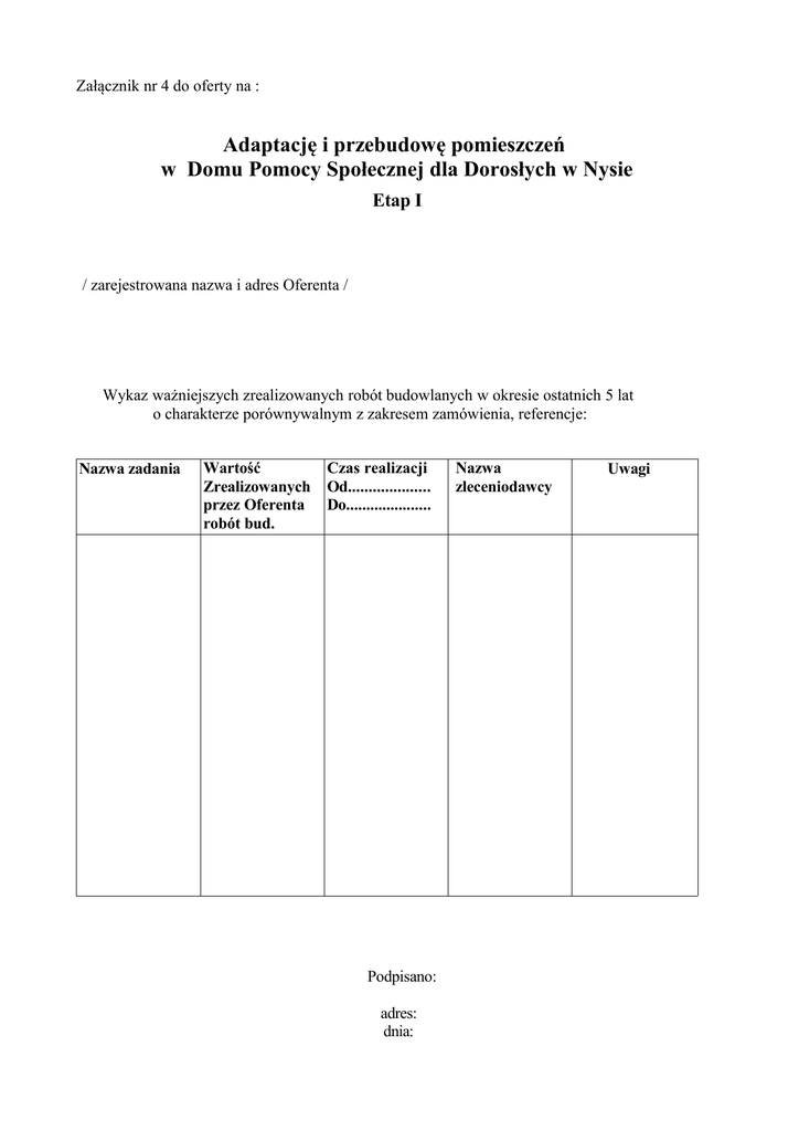 Załącznik nr 4 do oferty na : Adaptację i przebudowę pomieszczeń w Domu Pomocy Społecznej dla Dorosłych w Nysie Etap I / zarejestrowana nazwa i adres Oferenta / Wykaz ważniejszych zrealizowanych robót budowlanych w okresie ostatnich 5 lat o charakterze porównywalnym z zakresem zamówienia, referencje: Nazwa zadania Wartość Zrealizowanych przez Oferenta robót bud. Czas realizacji Od.................... Do..................... Podpisano: adres: dnia: Nazwa zleceniodawcy Uwagi