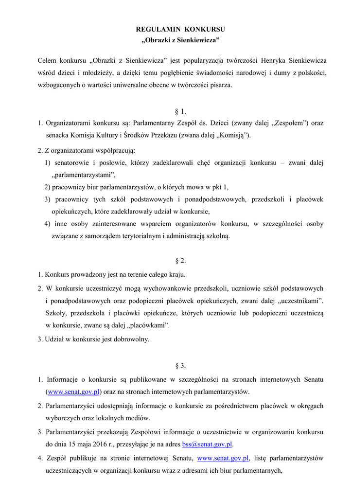 REGULAMIN KONKURSU „Obrazki z Sienkiewicza” Celem konkursu „Obrazki z Sienkiewicza” jest popularyzacja twórczości Henryka Sienkiewicza wśród dzieci i młodzieży, a dzięki temu pogłębienie świadomości narodowej i dumy z polskości, wzbogaconych o wartości uniwersalne obecne w twórczości pisarza. § 1. 1. Organizatorami konkursu są: Parlamentarny Zespół ds. Dzieci (zwany dalej „Zespołem”) oraz senacka Komisja Kultury i Środków Przekazu (zwana dalej „Komisją”). 2. Z organizatorami współpracują: 1) senatorowie i posłowie, którzy zadeklarowali chęć organizacji konkursu – zwani dalej „parlamentarzystami”, 2) pracownicy biur parlamentarzystów, o których mowa w pkt 1, 3) pracownicy tych szkół podstawowych i ponadpodstawowych, przedszkoli i placówek opiekuńczych, które zadeklarowały udział w konkursie, 4) inne osoby zainteresowane wsparciem organizatorów konkursu, w szczególności osoby związane z samorządem terytorialnym i administracją szkolną. § 2. 1. Konkurs prowadzony jest na terenie całego kraju. 2. W konkursie uczestniczyć mogą wychowankowie przedszkoli, uczniowie szkół podstawowych i ponadpodstawowych oraz podopieczni placówek opiekuńczych, zwani dalej „uczestnikami”. Szkoły, przedszkola i placówki opiekuńcze, których uczniowie lub podopieczni uczestniczą w konkursie, zwane są dalej „placówkami”. 3. Udział w konkursie jest dobrowolny. § 3. 1. Informacje o konkursie są publikowane w szczególności na stronach internetowych Senatu (www.senat.gov.pl) oraz na stronach internetowych parlamentarzystów. 2. Parlamentarzyści udostępniają informacje o konkursie za pośrednictwem placówek w okręgach wyborczych oraz lokalnych mediów. 3. Parlamentarzyści przekazują Zespołowi informacje o uczestnictwie w organizowaniu konkursu do dnia 15 maja 2016 r., przesyłając je na adres [email protected]. 4. Zespół publikuje na stronie internetowej Senatu, www.senat.gov.pl, listę parlamentarzystów uczestniczących w organizacji konkursu wraz z adresami ich biur parlamentarnych, § 4. 1. Placówka, zainteresowana udziałem jej uczniów lub podopiecznych w konkursie, przesyła do 15 czerwca 2016 r. do wybranego biura parlamentarzysty zgłoszenie na formularzu stanowiącym załącznik nr 1 do regulaminu. 2. Liczba uczestników konkursu z danej placówki nie jest ograniczona. Niezależnie od liczby uczestników każda placówka może wysłać tylko jedno zgłoszenie, wyłącznie do jednego biura parlamentarzysty. 3. Parlamentarzyści przekazują do dnia 30 czerwca 2016 r. mailową informację o liczbie zgłoszeń, o których mowa w ust.1, na adres [email protected]. § 5. 1. Przedmiotem konkursu są prace literackie, plastyczne i audiowizualne, inspirowane twórczością Henryka Sienkiewicza. 2. Prace konkursowe uczestnicy wykonują indywidualnie i samodzielnie. 3.Praca pisemna, przekazana w formacie .doc (MS Word) na nośniku lub mailem, nie powinna przekraczać objętości 7 000 znaków (ze spacjami włącznie). 4.Praca plastyczna może być wykonana w dowolnej formie; prace dwuwymiarowe np. w technice malarskiej, rysunku, grafiki, kolażu, wyklejanki, a prace przestrzenne – rzeźby, instalacji. Prace dwuwymiarowe nie powinny przekraczać formatu A3 (297 mm x 420 mm). Podstawa pracy trójwymiarowej powinna się mieścić w formacie A3, a wysokość nie przekraczać 30 cm. 5. Prace audiowizualne powinny mieć postać inscenizacji wybranych scen z twórczości pisarza, utrwalonych (sfilmowanych) na nośnikach umożliwiających ich odtworzenie na monitorze komputerowym. Prace należy dostarczyć na pendrive lub płycie CD/DVD lub drogą mailową. Długość filmu nie powinna przekraczać 2 minut. Prace audiowizualne powinny być zapisane w standardowym formacie stosowanym w systemie MS Windows. § 6. 1. Podpisane prace powinny być przesłane do 15 października 2016 r. do biura tego parlamentarzysty, do którego wcześniej skierowane było zgłoszenie, wraz z danymi zawierającymi: imię i nazwisko autora, nazwę placówki oraz jej adres. 2. Kryteriami oceny prac będą: oryginalność, staranność opracowania, czytelność nawiązania do twórczości pisarza, wartość pracy jako narzędzia popularyzacji jego twórczości. 3. Prace oceniane będą w kategoriach wiekowych autorów: I. Przedszkole II. Szkoła podstawowa III. Szkoła ponadpodstawowa § 7. 1. Organizator nie będzie pokrywał kosztów działań mających na celu zwrot nadesłanych prac uczestnikom konkursu; nie będzie podejmował takich działań, nie będzie również przechowywał prac po upływie terminu, o którym mowa w ust. 3. 2. Organizator zastrzega sobie prawo do przekazania prac osobom trzecim oraz do ich częściowej lub całościowej, anonimowej publikacji bez wynagrodzenia. 3. Prace, które nie zostaną przez organizatora przekazane osobom trzecim, mogą być odebrane przez uczestników w ciągu 3 miesięcy od dnia ogłoszenia wyników konkursu. Po upływie tego terminu, prace nieodebrane mogą być komisyjnie zniszczone. 4. Przesłanie pracy konkursowej do biura parlamentarzysty jest traktowane jako deklaracja udziału w konkursie, oznacza też wyrażenie przez uczestnika, a gdy jest to wymagane przez jego opiekuna prawnego, zgody na jej nieodpłatną, anonimową publikację. 5. Uczestnik konkursu, a gdy to jest wymagane jego opiekun prawny, może wyrazić zgodę na publikację pracy konkursowej pod imieniem i nazwiskiem autora. 6. Wraz z pracami do biura parlamentarzysty przekazywane jest oświadczenie uczestnika, a gdy jest to wymagane jego opiekuna prawnego, o zapoznaniu się z regulaminem konkursu i zgodzie na udział w konkursie na zasadach określonych w tym regulaminie, na formularzu stanowiącym załącznik nr 2 do regulaminu. § 8. Konkurs składa się z dwóch etapów: okręgowego i ogólnopolskiego. Etap okręgowy jest rozstrzygany w biurze parlamentarzysty. § 9. 1. Podczas okręgowego etapu konkursu prace będą ocenia