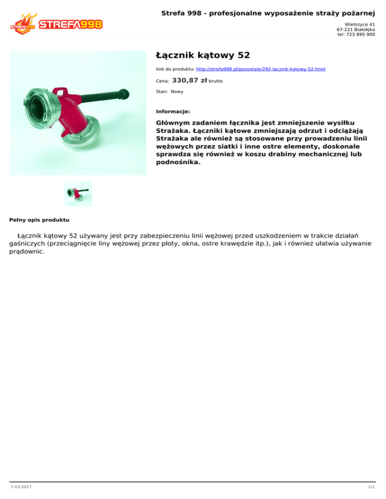 Strefa 998 - profesjonalne wyposażenie straży pożarnej Wietszyce 41 67-221 Białołęka tel: 723 895 900 Łącznik kątowy 52 link do produktu: http://strefa998.pl/pozostale/292-lacznik-katowy-52.html Cena: 330,87 zł brutto Stan: Nowy Informacje: Głównym zadaniem łącznika jest zmniejszenie wysiłku Strażaka. Łączniki kątowe zmniejszają odrzut i odciążają Strażaka ale również są stosowane przy prowadzeniu linii wężowych przez siatki i inne ostre elementy, doskonale sprawdza się również w koszu drabiny mechanicznej lub podnośnika. Pełny opis produktu Łącznik kątowy 52 używany jest przy zabezpieczeniu linii wężowej przed uszkodzeniem w trakcie działań gaśniczych (przeciągnięcie liny wężowej przez płoty, okna, ostre krawędzie itp.), jak i również ułatwia używanie prądownic. 7-03-2017 1/1