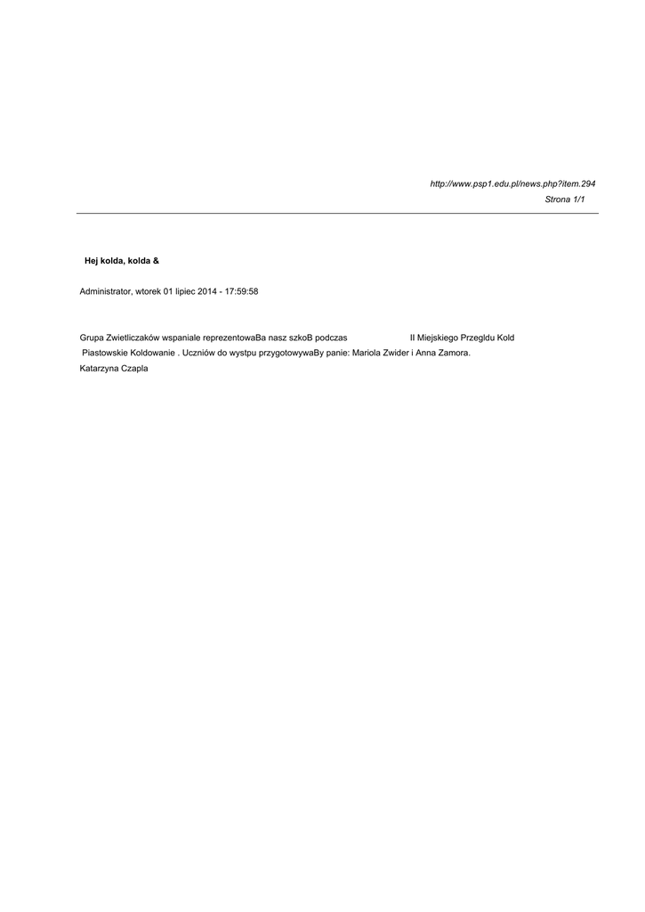 http://www.psp1.edu.pl/news.php?item.294 Strona 1/1 Hej kolda, kolda & Administrator, wtorek 01 lipiec 2014 - 17:59:58 Grupa Zwietliczaków wspaniale reprezentowaBa nasz szkoB podczas II Miejskiego Przegldu Kold Piastowskie Koldowanie . Uczniów do wystpu przygotowywaBy panie: Mariola Zwider i Anna Zamora. Katarzyna Czapla