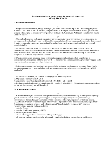 Regulamin konkursu kreatywnego dla uczniów i nauczycieli MOJ@ EDUKACJA I. Postanowienia ogólne §1 1. Organizatorem konkursu „Moj@ edukacja” jest firma Think Global Sp. z o.o., z siedzibą przy ulicy Ciołka 12 lok. 209, 01-402 Warszawa, zarejestrowana w KRS pod numerem 0000295441, prowadząca projekt edukacyjny na zlecenie i we współpracy z iSource S.A. i innymi Partnerami Handlowymi marki Apple w Polsce. §2 1. Celem konkursu jest zachęcenie młodzieży do tworzenia i wykorzystywania w procesie uczenia się nowoczesnych technologii i innowacji (na różnych przedmiotach), zaś nauczycieli/studentów do tworzenia i wykorzystywania w procesie nauczania różnorodnych narzędzi nowoczesnej edukacji (na różnych przedmiotach). 2. Konkurs odbywa się w dwóch kategoriach: Uczniowie i Nauczyciele, przy czym w kategorii Nauczyciele mogą brać udział również studenci specjalności nauczycielskiej, uczęszczający na studia w roku akademickim 2010/2011 lub 2011/2012. Uczniowie i Nauczyciele uczestniczący w konkursie nazywani są w dalszej części także Autorami. 3. Prace zgłoszone do konkursu mogą być rezultatem pracy indywidualnej lub zespołowej, z zastrzeżeniem, że nagroda, o której mowa w § 11, przyznawana jest za zgłoszoną pracę bez względu na to, czy jest to dzieło jednego czy wielu Autorów. 4. Informacje, porady oraz inspiracje dla uczestników konkursu zamieszczono w portalu Edustyle.pl, promującym nowy styl nauczania i uczenia się, stworzonym specjalnie na potrzeby projektu „Moj@ edukacja”. §3 1. Konkurs realizowany jest zgodnie z następującym harmonogramem: a. Ogłoszenie konkursu 16.05.2011 b. Zgłaszanie (nadsyłanie) prac konkursowych 1.06.2011 – 22.11.2011 c. Podsumowanie konkursu i wręczenie nagród – między 9 a 16.12.2011 (dokładna data zostanie podana na stronie internetowej www.Edustyle.pl II. Konkurs dla Uczniów §4 1. Celem konkursu jest stworzenie młodym ludziom szansy wypowiedzenia się, w jaki sposób się uczą i jak chcieliby się uczyć, zwracając uwagę na (niewykorzystany) potencjał nowych technologii informacyjno-komunikacyjnych oraz na potrzebę zmiany edukacyjnych praktyk w polskiej szkole. 2. Zadaniem Uczniów w konkursie jest opracowanie i zaprezentowanie narzędzia edukacyjnego, które będzie odpowiedzią na pytania: „Jak lubię się uczyć? Jak chciał(a)bym się uczyć?“, poprzez wykorzystanie jednej z wybranych form: - materiał filmowy, - materiał dźwiękowy (podcasty/MP3), - prezentacja multimedialna, - własna edukacyjna strona internetowa / blog edukacyjny, - lub poprzez wykorzystanie metody mieszanej – zawierającej różne wymienione wyżej formy. 3. Prace Uczniów mogą przedstawiać wszelkie treści dotyczące procesu zdobywania wiedzy, np. humanistycznej, matematyczno-przyrodniczej lub przedsiębiorczości, jej poszukiwania i przyswajania. Powinny dokumentować indywidualny proces uczenia się (styl), dzięki któremu następuje, z wykorzystaniem różnych technik i technologii edukacyjnych, przyrost wiedzy i umiejętności. §5 1. Każdy Uczeń może mieć swojego nauczyciela opiekuna, którego zgłosi w formularzu jako nauczyciela – koordynatora. Rola nauczyciela-koordynatora w konkursie polega na wspieraniu (merytorycznie i koncepcyjnie) uczniów, którzy przygotowują pracę na konkurs. Nauczyciel-koordynator otrzyma certyfikat za przygotowanie uczniów do konkursu „Moj@ edukacja”. 2. Jeden nauczyciel może być opiekunem więcej niż jednego Autora. III. Konkurs dla Nauczyciela §6 1. Celem konkursu jest zachęcenie nauczycieli do stosowania różnorodnych technik nowoczesnej edukacji w codziennej praktyce dydaktycznej. 2. Zadaniem Nauczycieli w konkursie jest opracowanie i zaprezentowanie narzędzia edukacyjnego, które będzie odpowiedzią na pytania: „Jak można nowocześnie uczyć? Jak chciał(a)bym uczyć?” poprzez wykorzystanie jednej z wybranych form: - materiał filmowy, - materiał dźwiękowy (podcasty/MP3), - prezentacja multimedialna - własna edukacyjna strona internetowa / blog edukacyjny, - lub wykorzystanie metody mieszanej – zawierającej różne wymienione wyżej formy. 3. Prace Nauczycieli powinny zawierać informacje o tym, w jaki sposób wykorzystują oni nowoczesne technologie w nauczaniu szkolnym i jakie rezultaty przynosi korzystanie z TIK. IV. Zgłoszenie do konkursu §7 1. Aby wziąć udział w konkursie, należy przesłać wypełniony i podpisany przez Autora formularz oraz pracę konkursową. Formularze bez podpisu Autora nie będą przyjmowane. 2. Formularz dostępny jest do pobrania na stronie Edustyle.pl. Należy go wypełnić, podpisać, a następnie dostarczyć Organizatorom w jednej z wybranych form: a. elektronicznej (skan) na adres: [email protected] b. faksem na numer: 022 642 22 40 c. lub ewentualnie w formie papierowej na adres: Think Global Sp. z o.o. ul. E. Ciołka 12 lok. 209-212 01-402 Warszawa 3. Plik z pracą konkursową (jeśli dotyczy) należy dostarczyć Organizatorowi poprzez: a. wgranie na serwer poprzez stronę Edustyle.pl lub przesłanie na płycie CD/DVD na adres Organizatora: Think Global Sp. z o.o., ul. E. Ciołka 12 lok. 209-212, 01-402 Warszawa b. Prace konkursowe w postaci bloga lub strony multimedialnej należy dostarczyć przesyłając link do strony/bloga na adres Organizatora: [email protected] wraz z krótkim opisem, zawierającym imię i nazwisko autora, kategorię konkursu oraz nazwę i adres szkoły. 4. Dopuszczalne formaty zapisu plików, to: a. filmy: MOV, WMV, MP4, FLV, AVI b. audio/podkast: MP3, AAC, WAV, M4B c. prezentacje: SWF, PDF, PPT, PPTX, KEY, ODP d. strony www lub blogi: adres URL 5. Prace przygotowane w formie plików tekstowych nie będą akceptowane w konkursie. 6. W konkursie mogą wziąć udział: a. Uczniowie publicznych i niepublicznych gimnazjów oraz szkół ponadgimnazjalnych w Polsce (z wyjątkiem szkół dla dorosłych), uczęszczający do szkoły na terenie Rzeczypospolitej Polskiej w 