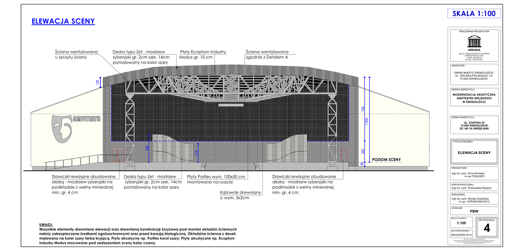 SKALA 1:100 ELEWACJA SCENY PRACOWNIA PROJEKTOWA Deska typu Zet - modrzew syberyjski gr. 2cm szer. 14cm pomalowany na kolor szary Płyty Ecophon Industry Modus gr. 10 cm ARKADA Ściana wentylowana zgodnie z Detalem A mgr inż. ANNA PATRYCJA FLICIŃSKA ul.MICKIEWICZA 127/2, 71-260 SZCZECIN tel./fax ( 091)4314242 INWESTOR: GMINA MIASTO ŚWINOUJŚCIE UL. WOJSKA POLSKIEGO 1/5 72-600 ŚWINOUJŚCIE 125 Ściana wentylowana u szczytu ściany NAZWA INWESTYCJI: 755 MODERNIZACJA AKUSTYCZNA AMFITEATRU MIEJSKIEGO W ŚWINOUJŚCIU 1 005 ADRES INWESTYCJI: UL. CHOPINA 30 72-600 ŚWINOUJŚCIE DZ. NR 18 OBRĘB 0006 250 215 330 TYTUŁ RYSUNKU: ELEWACJA SCENY 50 POZIOM SCENY PROJEKTANT: Drzwiczki rewizyjne obudowane deską - modrzew syberyjski na podkładzie z wełny mineralnej min. gr. 4 cm Deska typu Zet - modrzew syberyjski gr. 2cm szer. 14cm pomalowany na kolor szary Płyty Porfles wym. 100x50 cm montowane na ruszcie Kątownik drewniany o wym. 3x3cm Drzwiczki rewizyjne obudowane deską - modrzew syberyjski na podkładzie z wełny mineralnej min. gr. 4 cm mgr inż. arch. Anna Flicińska nr upr.75/Sz/2001 WSPÓŁPRACOWAŁ: mgr inż. arch. Przemysław Rybacki SPRAWDZIŁ: mgr inż. arch. Monika Grudnicka nr upr. 7/ZPOIA/OKK/2013 STADIUM: PBW SKALA RYSUNKU: UWAGI: Wszystkie elementy drewniane elewacji oraz drewnianą konstrukcję krzyżowa pod montaż okładzin ściennych należy zabezpieczona środkami ognioochronnymi oraz przed korozją biologiczną. Okładzina ścienna z desek malowana na kolor szary farbą kryjącą. Płyty akustycne np. Porfles korol szary. Płyty akustyczne np. Ecophon Industry Modus mocowane pod zadaszeniem sceny kolor czarny. 1:100 DATA OPRACOWANIA: GRUDZIEŃ 2014 NR RYSUNKU: 4 WSZELKIE PRAWA ZASTRZEŻONE Kopiowanie, publikacje oraz wszelkie inne formy wykorzystania projektu bez zgody autora będą naruszeniem przepisów wynikających z Ustawy o Ochronie Praw Autorskich