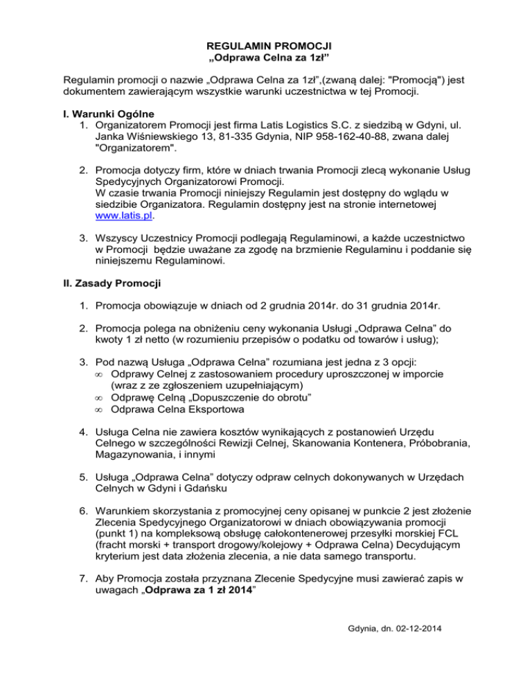 REGULAMIN PROMOCJI „Odprawa Celna za 1zł” Regulamin promocji o nazwie „Odprawa Celna za 1zł”,(zwaną dalej: "Promocją") jest dokumentem zawierającym wszystkie warunki uczestnictwa w tej Promocji. I. Warunki Ogólne 1. Organizatorem Promocji jest firma Latis Logistics S.C. z siedzibą w Gdyni, ul. Janka Wiśniewskiego 13, 81-335 Gdynia, NIP 958-162-40-88, zwana dalej "Organizatorem". 2. Promocja dotyczy firm, które w dniach trwania Promocji zlecą wykonanie Usług Spedycyjnych Organizatorowi Promocji. W czasie trwania Promocji niniejszy Regulamin jest dostępny do wglądu w siedzibie Organizatora. Regulamin dostępny jest na stronie internetowej www.latis.pl. 3. Wszyscy Uczestnicy Promocji podlegają Regulaminowi, a każde uczestnictwo w Promocji będzie uważane za zgodę na brzmienie Regulaminu i poddanie się niniejszemu Regulaminowi. II. Zasady Promocji 1. Promocja obowiązuje w dniach od 2 grudnia 2014r. do 31 grudnia 2014r. 2. Promocja polega na obniżeniu ceny wykonania Usługi „Odprawa Celna” do kwoty 1 zł netto (w rozumieniu przepisów o podatku od towarów i usług); 3. Pod nazwą Usługa „Odprawa Celna” rozumiana jest jedna z 3 opcji: • Odprawy Celnej z zastosowaniem procedury uproszczonej w imporcie (wraz z ze zgłoszeniem uzupełniającym) • Odprawę Celną „Dopuszczenie do obrotu” • Odprawa Celna Eksportowa 4. Usługa Celna nie zawiera kosztów wynikających z postanowień Urzędu Celnego w szczególności Rewizji Celnej, Skanowania Kontenera, Próbobrania, Magazynowania, i innymi 5. Usługa „Odprawa Celna” dotyczy odpraw celnych dokonywanych w Urzędach Celnych w Gdyni i Gdańsku 6. Warunkiem skorzystania z promocyjnej ceny opisanej w punkcie 2 jest złożenie Zlecenia Spedycyjnego Organizatorowi w dniach obowiązywania promocji (punkt 1) na kompleksową obsługę całokontenerowej przesyłki morskiej FCL (fracht morski + transport drogowy/kolejowy + Odprawa Celna) Decydującym kryterium jest data złożenia zlecenia, a nie data samego transportu. 7. Aby Promocja została przyznana Zlecenie Spedycyjne musi zawierać zapis w uwagach „Odprawa za 1 zł 2014” Gdynia, dn. 02-12-2014