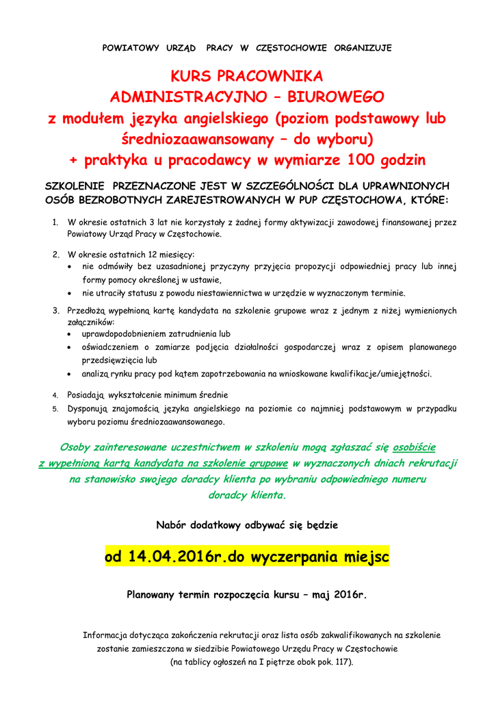 POWIATOWY URZĄD PRACY W CZĘSTOCHOWIE ORGANIZUJE KURS PRACOWNIKA ADMINISTRACYJNO – BIUROWEGO z modułem języka angielskiego (poziom podstawowy lub średniozaawansowany – do wyboru) + praktyka u pracodawcy w wymiarze 100 godzin SZKOLENIE PRZEZNACZONE JEST W SZCZEGÓLNOŚCI DLA UPRAWNIONYCH OSÓB BEZROBOTNYCH ZAREJESTROWANYCH W PUP CZĘSTOCHOWA, KTÓRE: 1. W okresie ostatnich 3 lat nie korzystały z żadnej formy aktywizacji zawodowej finansowanej przez Powiatowy Urząd Pracy w Częstochowie. 2. W okresie ostatnich 12 miesięcy: nie odmówiły bez uzasadnionej przyczyny przyjęcia propozycji odpowiedniej pracy lub innej formy pomocy określonej w ustawie, nie utraciły statusu z powodu niestawiennictwa w urzędzie w wyznaczonym terminie. 3. Przedłożą wypełnioną kartę kandydata na szkolenie grupowe wraz z jednym z niżej wymienionych załączników: uprawdopodobnieniem zatrudnienia lub oświadczeniem o zamiarze podjęcia działalności gospodarczej wraz z opisem planowanego przedsięwzięcia lub analizą rynku pracy pod kątem zapotrzebowania na wnioskowane kwalifikacje/umiejętności. 4. Posiadają wykształcenie minimum średnie 5. Dysponują znajomością języka angielskiego na poziomie co najmniej podstawowym w przypadku wyboru poziomu średniozaawansowanego. Osoby zainteresowane uczestnictwem w szkoleniu mogą zgłaszać się osobiście z wypełnioną kartą kandydata na szkolenie grupowe w wyznaczonych dniach rekrutacji na stanowisko swojego doradcy klienta po wybraniu odpowiedniego numeru doradcy klienta. Nabór dodatkowy odbywać się będzie od 14.04.2016r.do wyczerpania miejsc Planowany termin rozpoczęcia kursu – maj 2016r. Informacja dotycząca zakończenia rekrutacji oraz lista osób zakwalifikowanych na szkolenie zostanie zamieszczona w siedzibie Powiatowego Urzędu Pracy w Częstochowie (na tablicy ogłoszeń na I piętrze obok pok. 117).