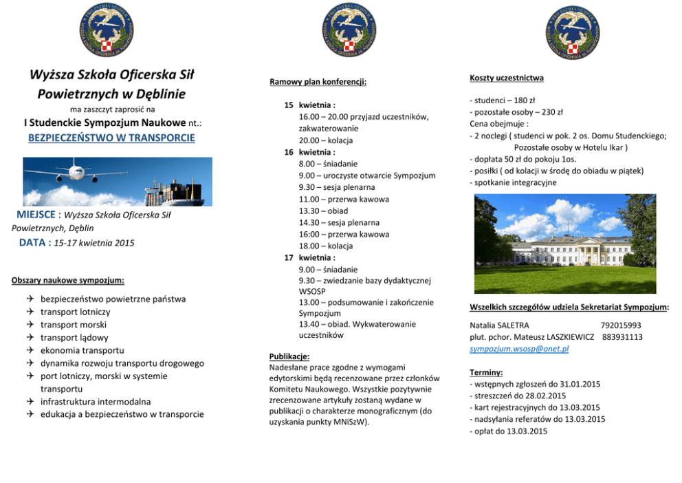 Wyższa Szkoła Oficerska Sił Powietrznych w Dęblinie ma zaszczyt zaprosić na I Studenckie Sympozjum Naukowe nt.: BEZPIECZEŃSTWO W TRANSPORCIE MIEJSCE : Wyższa Szkoła Oficerska Sił Powietrznych, Dęblin DATA : 15-17 kwietnia 2015 Obszary naukowe sympozjum: bezpieczeństwo powietrzne państwa transport lotniczy transport morski transport lądowy ekonomia transportu dynamika rozwoju transportu drogowego port lotniczy, morski w systemie transportu infrastruktura intermodalna edukacja a bezpieczeństwo w transporcie Ramowy plan konferencji: 15 kwietnia : 16.00 – 20.00 przyjazd uczestników, zakwaterowanie 20.00 – kolacja 16 kwietnia : 8.00 – śniadanie 9.00 – uroczyste otwarcie Sympozjum 9.30 – sesja plenarna 11.00 – przerwa kawowa 13.30 – obiad 14.30 – sesja plenarna 16:00 – przerwa kawowa 18.00 – kolacja 17 kwietnia : 9.00 – śniadanie 9.30 – zwiedzanie bazy dydaktycznej WSOSP 13.00 – podsumowanie i zakończenie Sympozjum 13.40 – obiad. Wykwaterowanie uczestników Publikacje: Nadesłane prace zgodne z wymogami edytorskimi będą recenzowane przez członków Komitetu Naukowego. Wszystkie pozytywnie zrecenzowane artykuły zostaną wydane w publikacji o charakterze monograficznym (do uzyskania punkty MNiSzW). Koszty uczestnictwa - studenci – 180 zł - pozostałe osoby – 230 zł Cena obejmuje : - 2 noclegi ( studenci w pok. 2 os. Domu Studenckiego; Pozostałe osoby w Hotelu Ikar ) - dopłata 50 zł do pokoju 1os. - posiłki ( od kolacji w środę do obiadu w piątek) - spotkanie integracyjne Wszelkich szczegółów udziela Sekretariat Sympozjum: Natalia SALETRA 792015993 plut. pchor. Mateusz LASZKIEWICZ 883931113 [email protected] Terminy: - wstępnych zgłoszeń do 31.01.2015 - streszczeń do 28.02.2015 - kart rejestracyjnych do 13.03.2015 - nadsyłania referatów do 13.03.2015 - opłat do 13.03.2015