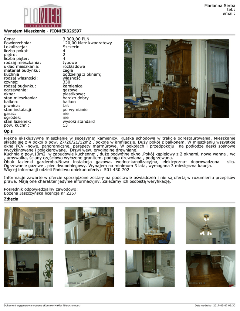 Marianna Serba tel.: email: Wynajem Mieszkanie - PIONIER026597 Cena: Powierzchnia: Lokalizacja: liczba pokoi: piętro: liczba pięter: rodzaj mieszkania: układ mieszkania: materiał budynku: kuchnia: rodzaj własności: czynsz: rodzaj budynku: ogrzewanie: okna: stan mieszkania: balkon: piwnica: stan instalacji: garaż: ogródek: stan łazienek: pow. kuchni: Opis 3 000,00 PLN 120,00 Metr kwadratowy Szczecin 4 2 4 typowe rozkładowe cegła oddzielna;z oknem; własność 330 kamienica gazowe plastikowe; bardzo dobry balkon tak po wymianie nie nie wysoki standard 13 Piękne ekskluzywne mieszkanie w secesyjnej kamienicy. KLatka schodowa w trakcie odrestaurowania. Mieszkanie składa się z 4 pokoi o pow. 27/26/21/12m2 , pokoje w amfiladzie. Duży pokój z balkonem. W mieszkaniu wszystkie okna PCV -nowe, panoramiczne, parapety marmurowe. W pokojach i przedpokoju na podłodze deski sosnowe wycyklinowane i polakierowane. Drzwi wew. oryginalne drewniane. Kuchnia o pow.13m2 w zabudowie kuchennej , duże podwójne okno .Pokój kąpielowy z 2 oknami, nowa wanna , wc , umywalka, ściany częściowo wyłożone granitem, podłoga drewniana , podgrzewana. Obok łazienki garderoba.Nowa instalacja gazowa, wodno-kanalizacyjna, elektryczna- doprowadzona siła. Ogrzewanie gazowe , piec dwuoobiegowy. Wynajem na minimum 3 lata, wymagana 3 miesięczna kaucja. Więcej informacji udzieli Państwu opiekun oferty: 501 430 702 Informacje zawarte w ofercie sporządzone zostały na podstawie oświadczeń i nie są ofertą w rozumieniu przepisów prawa. Mają one charakter jedynie informacyjny. Zalecamy ich osobistą weryfikację. Pośrednik odpowiedzialny zawodowo: Bożena Jaszczyńska licencja nr 2257 Zdjęcia Dokument wygenerowany przez eKomako Makler Nieruchomości Data wydruku: 2017-03-07 09:30