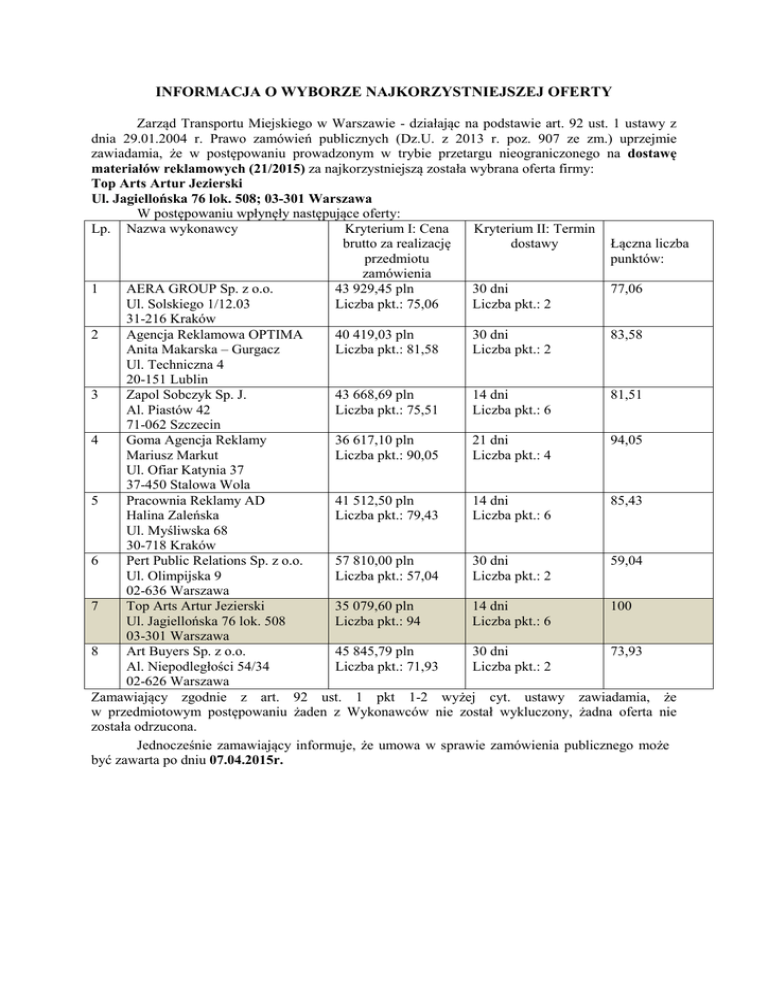 INFORMACJA O WYBORZE NAJKORZYSTNIEJSZEJ OFERTY Zarząd Transportu Miejskiego w Warszawie - działając na podstawie art. 92 ust. 1 ustawy z dnia 29.01.2004 r. Prawo zamówień publicznych (Dz.U. z 2013 r. poz. 907 ze zm.) uprzejmie zawiadamia, że w postępowaniu prowadzonym w trybie przetargu nieograniczonego na dostawę materiałów reklamowych (21/2015) za najkorzystniejszą została wybrana oferta firmy: Top Arts Artur Jezierski Ul. Jagiellońska 76 lok. 508; 03-301 Warszawa W postępowaniu wpłynęły następujące oferty: Lp. Nazwa wykonawcy Kryterium I: Cena Kryterium II: Termin brutto za realizację dostawy Łączna liczba przedmiotu punktów: zamówienia 1 AERA GROUP Sp. z o.o. 43 929,45 pln 30 dni 77,06 Ul. Solskiego 1/12.03 Liczba pkt.: 75,06 Liczba pkt.: 2 31-216 Kraków 2 Agencja Reklamowa OPTIMA 40 419,03 pln 30 dni 83,58 Anita Makarska – Gurgacz Liczba pkt.: 81,58 Liczba pkt.: 2 Ul. Techniczna 4 20-151 Lublin 3 Zapol Sobczyk Sp. J. 43 668,69 pln 14 dni 81,51 Al. Piastów 42 Liczba pkt.: 75,51 Liczba pkt.: 6 71-062 Szczecin 4 Goma Agencja Reklamy 36 617,10 pln 21 dni 94,05 Mariusz Markut Liczba pkt.: 90,05 Liczba pkt.: 4 Ul. Ofiar Katynia 37 37-450 Stalowa Wola 5 Pracownia Reklamy AD 41 512,50 pln 14 dni 85,43 Halina Zaleńska Liczba pkt.: 79,43 Liczba pkt.: 6 Ul. Myśliwska 68 30-718 Kraków 6 Pert Public Relations Sp. z o.o. 57 810,00 pln 30 dni 59,04 Ul. Olimpijska 9 Liczba pkt.: 57,04 Liczba pkt.: 2 02-636 Warszawa 7 Top Arts Artur Jezierski 35 079,60 pln 14 dni 100 Ul. Jagiellońska 76 lok. 508 Liczba pkt.: 94 Liczba pkt.: 6 03-301 Warszawa 8 Art Buyers Sp. z o.o. 45 845,79 pln 30 dni 73,93 Al. Niepodległości 54/34 Liczba pkt.: 71,93 Liczba pkt.: 2 02-626 Warszawa Zamawiający zgodnie z art. 92 ust. 1 pkt 1-2 wyżej cyt. ustawy zawiadamia, że w przedmiotowym postępowaniu żaden z Wykonawców nie został wykluczony, żadna oferta nie została odrzucona. Jednocześnie zamawiający informuje, że umowa w sprawie zamówienia publicznego może być zawarta po dniu 07.04.2015r.