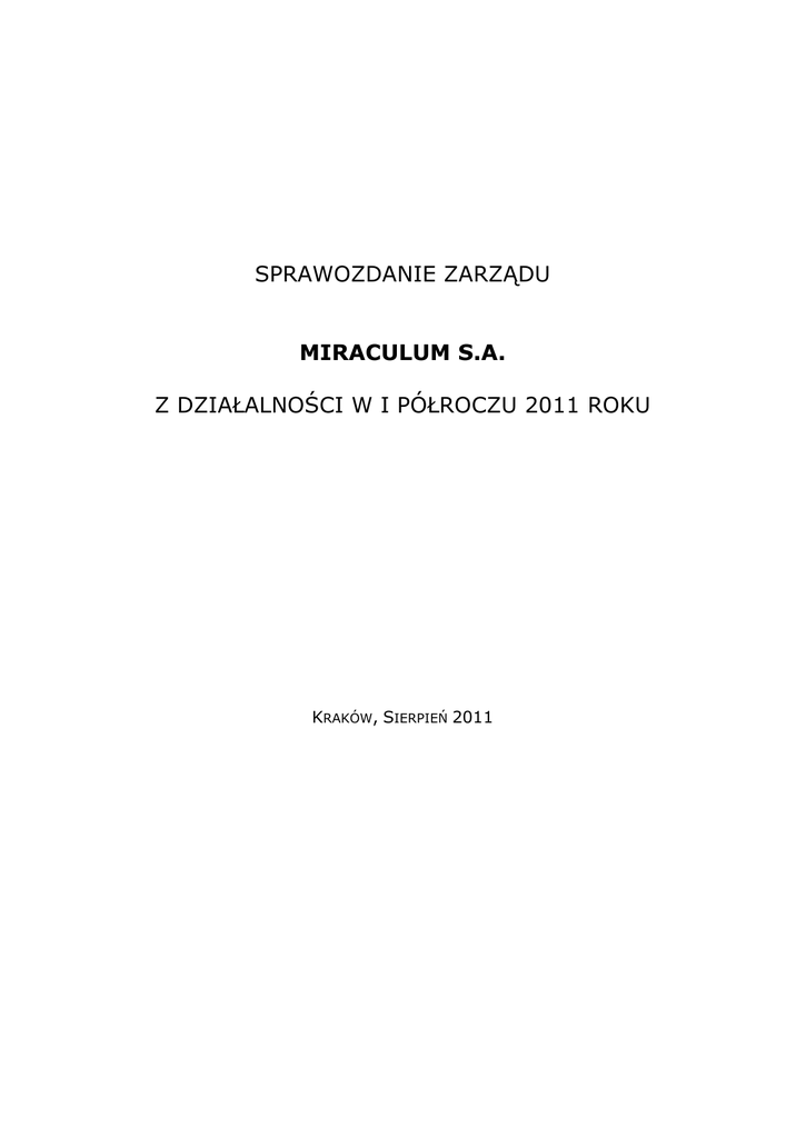 SPRAWOZDANIE ZARZĄDU MIRACULUM S.A. Z DZIAŁALNOŚCI W I PÓŁROCZU 2011 ROKU KRAKÓW, SIERPIEŃ 2011 Spis treści 1. PODSTAWOWE INFORMACJE O SPÓŁCE .......................................................... 4 1.1. 1.2. 1.3. 1.4. 1.5. STRUKTURA ORGANIZACYJNA ..................................................................... 4 ZMIANY W STRUKTURZE JEDNOSTKI GOSPODARCZEJ ................................. 4 DZIAŁALNOŚĆ SPÓŁKI MIRACULUM S.A. ..................................................... 5 AKCJONARIAT, PODMIOTY ZARZĄDZAJĄCE I NADZORUJĄCE....................... 6 ZATRUDNIENIE ............................................................................................ 9 2. DZIAŁALNOŚĆ EMITENTA ............................................................................. 10 2.1 PORTOFIO MAREK ORAZ WDROŻENIA W I PÓŁROCZU 2011 ROKU ............. 10 2.2. STRUKTURA SPRZEDAŻY ............................................................................ 13 2.3. OBJAŚNIENIA DOTYCZĄCE SEZONOWOŚCI LUB CYKLICZNOŚCI DZIAŁALNOŚCI EMITENTA W PREZENTOWANYM OKRESIE ............................... 13 3. SYTUACJA FINANSOWA W I PÓŁROCZU 2011 ROKU ..................................... 14 3.1. WYBRANE DANE FINANSOWE ZAWIERAJĄCE PODSTAWOWE POZYCJE PÓŁROCZNEGO SPRAWOZDANIA FINANSOWEGO ............................................. 14 3.2. ANALIZA FINANSOWA ............................................................................... 14 3.3. TRANSAKCJE Z PODMIOTAMI POWIĄZANYMI ............................................ 17 3.4. ZOBOWIĄZANIA FINANSOWE .................................................................... 17 3.5. RYZYKO FINANSOWE ................................................................................. 18 4. OPIS PODSTAWOWYCH ZAGROŻEŃ I RYZYKA .............................................. 18 5. STANOWISKO ZARZĄDU ODNOŚNIE DO MOŻLIWOŚCI ZREALIZOWANIA WCZEŚNIEJ PUBLIKOWANYCH PROGNOZ WYNIKÓW NA DANY ROK ................ 20 6. AKCJONARIUSZE POSIADAJĄCY BEZPOŚREDNIO LUB POŚREDNIO PRZEZ PODMIOTY ZALEŻNE CO NAJMNIEJ 5% OGÓLNEJ LICZBY GŁOSÓW NA WALNYM ZGROMADZENIU EMITENTA NA DZIEŃ PRZEKAZANIA RAPORTU WRAZ ZE WSKAZANIEM LICZBY POSIADANYCH PRZEZ TE PODMIOTY AKCJI, ICH PROCENTOWEGO UDZIAŁU W KAPITALE ZAKŁADOWYM, LICZBY GŁOSÓW Z NICH WYNIKAJACYCH I ICH PROCENTOWEGO UDZIAŁU W OGÓLNEJ LICZBIE GŁOSÓW NA WALNYM ZGROMADZENIU ORAZ WSKAZANIE ZMIAN W STRUKTURZE WŁASNOŚCI W OKRESIE OD PRZEKAZANIA POPRZEDNIEGO RAPORTU KWARTALNEGO ................................................................................. 20 7. ZESTAWIENIE STANU POSIADANIA AKCJI LUB UPRAWNIEŃ DO NICH (OPCJI) PRZEZ OSOBY ZARZĄDZAJĄCE I NADZORUJĄCE EMITENTA NA DZIEŃ PRZEKAZANIA RAPORTU ORAZ ZMIANY W STANIE POSIADANIA, W OKRESIE OD PRZEKAZANIA POPRZEDNIEGO RAPORTU KWARTALNEGO, ODRĘBNIE DLA KAŻDEJ Z OSÓB ................................................................................................ 22 8. POSTĘPOWANIA TOCZĄCE SIĘ PRZED SĄDEM, ORGANEM WŁAŚCIWYM DLA POSTĘPOWANIA ARBITRAŻOWEGO LUB ORGANEM ADMINISTRACJI PUBLICZNEJ ......................................................................................................................... 23 9. INFORMACJE O ZAWARCIU PRZEZ EMITENTA LUB JEDNOSTKĘ OD NIEGO ZALEŻNĄ JEDNEJ LUB WIELU TRANSAKCJI Z PODMIOTAMI POWIĄZANYMI, JEŻELI POJEDYNCZO LUB ŁĄCZNIE SĄ ONE ISTOTNE I ZOSTAŁY ONE ZAWARTE NA INNYCH WARUNKACH NIŻ RYNKOWE ......................................................... 23 Sprawozdanie Zarządu za I półrocze 2011 r. MIRACULUM S.A. 10. INFORMACJE O UDZIELENIU PRZEZ EMITENTA PORĘCZEŃ KREDYTU LUB POŻYCZKI LUB UDZIELENIU GWARANCJI – ŁĄCZNIE JEDNEMU PODMIOTOWI LUB JEDNOSTCE ZALEŻNEJ OD TEGO PODMIOTU, JEŻELI ŁĄCZNA WARTOŚĆ ISTNIEJĄCYCH PORĘCZEŃ LUB GWARANCJI STANOWI RÓWNOWARTOŚĆ CO NAJMNIEJ 10% KAPITAŁÓW WŁASNYCH EMITENTA ........................................ 23 11. INNE INFORMACJE ISTOTNE DLA OCENY SYTUACJI KADROWEJ, FINANSOWEJ, WYNIKU FINANSOWEGO I ICH ZMIAN ORAZ INFORMACJE ISTOTNE DLA OCENY MOZLIWOSCI REALIZACJI ZOBOWIAZAŃ ....................... 24 12. CZYNNIKI, KTÓRE W OCENIE EMITENTA BĘDĄ MIAŁY WPŁYW NA OSIĄGNIETE PRZEZ NIEGO WYNIKI W PERSPEKTYWIE CO NAJMNIEJ KOLEJNEGO KWARTAŁU .................................................................................... 25 13. ISTOTNE WYDARZENIA W OKRESIE I PÓŁROCZA 2011 I PO DACIE BILANSOWEJ .................................................................................................... 25 14. DANE DOTYCZĄCE UMOWY Z PODMIOTEM UPRAWNIONYM DO BADANIA SPRAWOZDAŃ FINANSOWYCH ......................................................................... 30 3 Sprawozdanie Zarządu za I półrocze 2011 r. MIRACULUM S.A. 1. PODSTAWOWE INFORMACJE O SPÓŁCE 1.1. STRUKTURA ORGANIZACYJNA MIRACULUM S.A. Spółka działa od 9 sierpnia 2001 r. na mocy Uchwały Zwyczajnego Zgromadzenia Wspólników. Spółka została zarejestrowana w dniu 09.08.2001 r. w Sądzie Rejonowym dla Łodzi-Śródmieścia w Łodzi, XX Wydział Krajowego Rejestru Sądowego pod numerem 0000034099. Zgodnie z § 3 Statutu czas trwania Spółki jest nieoznaczony. Miraculum S.A. to polskie przedsiębiorstwo działające w branży kosmetycznej. Działalność Spółki koncentruje się na opracowywaniu i sprzedaży nowoczesnych kosmetyków do pielęgnacji twarzy i ciała, wyrobów perfumeryjnych, preparatów do depilacji oraz kosmetyków do makijażu. W portfolio Spółki znajdują się następujące marki:, Miraculum, Pani Walewska, Brutal, Gracja,Tanita, Paloma, a także marki: Lider, Wars oraz Być może, zakupione w 2007 od PZ Cussons Polska. Wysoka jakość produktów Miraculum potwierdzana jest licznymi nagrodami, wyróżnieniami, a także czołowymi lokatami zajmowanymi w najbardziej prestiżowych zestawieniach. Produkty Spółki oferowane są zarówno na rynku krajowym jak i na rynkach zagranicznych. Główne rynki eksportowe to: Rosja, Ukraina, Białoruś, Lit