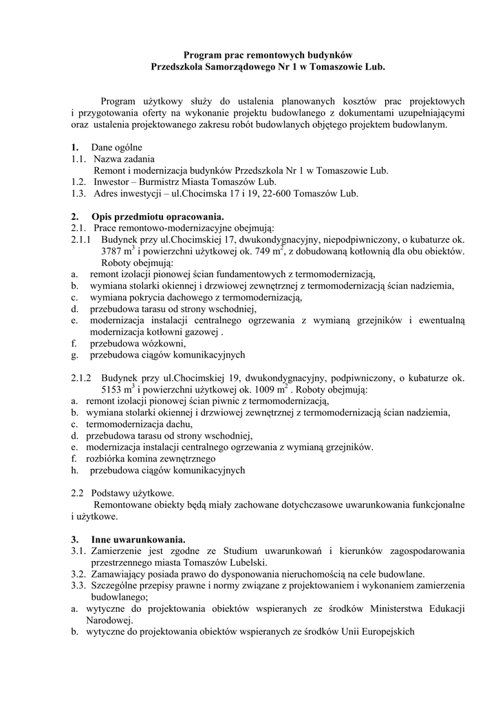 Program prac remontowych budynków Przedszkola Samorządowego Nr 1 w Tomaszowie Lub. Program uŜytkowy słuŜy do ustalenia planowanych kosztów prac projektowych i przygotowania oferty na wykonanie projektu budowlanego z dokumentami uzupełniającymi oraz ustalenia projektowanego zakresu robót budowlanych objętego projektem budowlanym. 1. Dane ogólne 1.1. Nazwa zadania Remont i modernizacja budynków Przedszkola Nr 1 w Tomaszowie Lub. 1.2. Inwestor – Burmistrz Miasta Tomaszów Lub. 1.3. Adres inwestycji – ul.Chocimska 17 i 19, 22-600 Tomaszów Lub. 2. Opis przedmiotu opracowania. 2.1. Prace remontowo-modernizacyjne obejmują: 2.1.1 Budynek przy ul.Chocimskiej 17, dwukondygnacyjny, niepodpiwniczony, o kubaturze ok. 3787 m3 i powierzchni uŜytkowej ok. 749 m2, z dobudowaną kotłownią dla obu obiektów. Roboty obejmują: a. remont izolacji pionowej ścian fundamentowych z termomodernizacją, b. wymiana stolarki okiennej i drzwiowej zewnętrznej z termomodernizacją ścian nadziemia, c. wymiana pokrycia dachowego z termomodernizacją, d. przebudowa tarasu od strony wschodniej, e. modernizacja instalacji centralnego ogrzewania z wymianą grzejników i ewentualną modernizacja kotłowni gazowej . f. przebudowa wózkowni, g. przebudowa ciągów komunikacyjnych 2.1.2 a. b. c. d. e. f. h. Budynek przy ul.Chocimskiej 19, dwukondygnacyjny, podpiwniczony, o kubaturze ok. 5153 m3 i powierzchni uŜytkowej ok. 1009 m2 . Roboty obejmują: remont izolacji pionowej ścian piwnic z termomodernizacją, wymiana stolarki okiennej i drzwiowej zewnętrznej z termomodernizacją ścian nadziemia, termomodernizacja dachu, przebudowa tarasu od strony wschodniej, modernizacja instalacji centralnego ogrzewania z wymianą grzejników. rozbiórka komina zewnętrznego przebudowa ciągów komunikacyjnych 2.2 Podstawy uŜytkowe. Remontowane obiekty będą miały zachowane dotychczasowe uwarunkowania funkcjonalne i uŜytkowe. 3. Inne uwarunkowania. 3.1. Zamierzenie jest zgodne ze Studium uwarunkowań i kierunków zagospodarowania przestrzennego miasta Tomaszów Lubelski. 3.2. Zamawiający posiada prawo do dysponowania nieruchomością na cele budowlane. 3.3. Szczególne przepisy prawne i normy związane z projektowaniem i wykonaniem zamierzenia budowlanego; a. wytyczne do projektowania obiektów wspieranych ze środków Ministerstwa Edukacji Narodowej. b. wytyczne do projektowania obiektów wspieranych ze środków Unii Europejskich 3.4. Inne posiadane informacje i dokumenty będące w dyspozycji zamawiającego niezbędne do zaprojektowania robót budowlanych, w szczególności : a. kopia mapy zasadniczej w wersji poglądowej, b. dokumentacja techniczna Przedszkola Samorządowego Nr 1 budynek przy ul Chocimskiej 17 - WyposaŜenie z preliminarzem kosztów 1976 rok Ŝłobka typowego na 75 miejsc .. - Projekt techniczny z kosztorysem wewnętrznej instalacji elektrycznej Ŝłobka . - Instalacje wod.-kan. i C.W., kotłowni ciepła technologicznego, wentylacji, gazu i elektryczne. - Projekt zieleni, wnętrza, mała architektura, technologia, wnętrza specjalne. - Modernizacja kotłowni z węglowej na gazową . c. dokumentacja techniczna Przedszkola Samorządowego Nr 1 budynek przy ul.Chocimskiej 19 - Instalacja gazowa w budynku Przedszkola nr 3 przy ulicy Chocimskiej , - Dokumentacja techniczna i kosztorys linii kablowej NN dł. 57, zasilającą przedszkole 4 oddziałowe przy ulicy Chocimskiej. - Zastosowanie gazu ziemnego do celów kom.-byt. dla potrzeb Przedszkola nr 3 ul Chocimska. - Dokumentacja techniczna badań podłoŜa gruntowego dla budowy Przedszkola przy ul Chocimskiej. - Przyłącze kanalizacji sanitarnej. Przedszkole typowe 4 oddziałowe ul Chocimska. - Dokumentacja techniczna i kosztorys przyłącze wodociągowe. Przedszkole 4 oddziałowe ul Chocimska. - Przyłącze kanalizacyjne do Przedszkola nr 3 ul Chocimska — wycinek - Realizacyjny plan zagospodarowania przestrzennego terenu Przedszkola ul Chocimska . - Koncepcja na rozbudowę. Sieć zewnętrzna wodno - kanalizacyjna. Przedszkole ul Chocimska . - Instalacje wod.- kan. i C.C.W. z kotłownią i z hydroelewatorem, C.O., wentylacja kuchni i pralni, inst. gazu i elektryczne. 4. Wykonawca w ramach zamówienia zobowiązany jest: a. uzyskać mapę do celów projektowych z inwentaryzacją zieleni, b. wykonać inwentaryzacje istniejących obiektów w niezbędnym zakresie, c. opracować auduty energetyczne dla obu obiektów z analizą konieczności zmian parametrów istniejącej kotłowni d. opracować projekty budowlane planowanych robót objętych zamówieniem, zgodnie z ustawą prawo budowlane, e. opracować projekty wykonawcze, przedmiar robót i specyfikacje techniczne wykonania i odbioru robót zgodnie z Rozporządzenia Ministra Infrastruktury z dnia 2 września 2004r. (Dz.U. Nr 202, poz. 2072 z 16.09.2004r.) w sprawie szczegółowego zakresu i formy dokumentacji projektowej, specyfikacji technicznych wykonania i odbioru robót oraz programu funkcjonalno-uŜytkowego, w tym w szczególności rozwiązań projektowych zawartych w projektach budowlanych, f. opracować kosztorys inwestorski zgodnie z Rozporządzeniem Ministra Infrastruktury z dnia 18 maja 2004r. W sprawie określenia metod i podstaw sporządzania kosztorysu inwestorskiego, obliczania planowanych kosztów prac projektowych oraz planowanych kosztów robót budowlanych określonych w programie funkcjonalno-uŜytkowym. (Dz.U. Nr.130, poz. 1389 z 2004r.) g. dokonać niezbędnych uzgodnień i sprawdzeń.