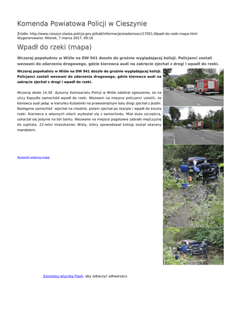 Komenda Powiatowa Policji w Cieszynie Źródło: http://www.cieszyn.slaska.policja.gov.pl/ka6/informacje/wiadomosci/17051,Wpadl-do-rzeki-mapa.html Wygenerowano: Wtorek, 7 marca 2017, 09:16 Wpadł do rzeki (mapa) Wczoraj popołudniu w Wiśle na DW 941 doszło do groźnie wyglądającej kolizji. Policjanci zostali wezwani do zdarzenia drogowego, gdzie kierowca audi na zakręcie zjechał z drogi i wpadł do rzeki. Wczoraj popołudniu w Wiśle na DW 941 doszło do groźnie wyglądającej kolizji. Policjanci zostali wezwani do zdarzenia drogowego, gdzie kierowca audi na zakręcie zjechał z drogi i wpadł do rzeki. Wczoraj około 14.30 dyżurny Komisariatu Policji w Wiśle odebrał zgłoszenie, że na ulicy Kopydło samochód wpadł do rzeki. Wezwani na miejsce policjanci ustalili, że kierowca audi jadąc w kierunku Kubalonki na prawoskrętnym łuku drogi zjechał z jezdni. Następnie samochód wjechał na chodnik, potem zjechał po skarpie i wpadł do koryta rzeki. Kierowca o własnych siłach wydostał się z samochodu. Miał dużo szczęścia, uskarżał się jedynie na ból barku. Wezwane na miejsce pogotowie zabrało mężczyznę do szpitala. 22-letni mieszkaniec Wisły, który spowodował kolizję został ukarany mandatem. Wyświetl większą mapę Zainstaluj wtyczkę Flash, aby zobaczyć odtwarzacz. pobierz film - 2.17 MB Ocena: 0/5 (0) Tweetnij