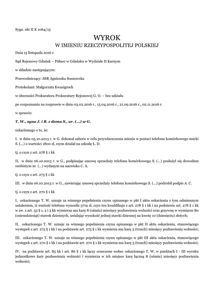 Sygn. akt II K 1064/15 WYROK W IMIENIU RZECZYPOSPOLITEJ POLSKIEJ Dnia 15 listopada 2016 r. Sąd Rejonowy Gdańsk – Północ w Gdańsku w Wydziale II Karnym w składzie następującym: Przewodniczący: SSR Agnieszka Sosnowska Protokolant: Małgorzata Kwasigroch w obecności Prokuratora Prokuratury Rejonowej G. O. – bez udziału po rozpoznaniu na rozprawie w dniu 03.02.2016 r., 15.04.2016 r., 21.09.2016 r., 02.11.2016 r. w sprawie: T. W., syna J. i B. z domu S., ur. (...) w G. oskarżonego o to, że: I. w dniu 05.10.2013 r. w G. dokonał zaboru w celu przywłaszczenia mienia w postaci telefonu komórkowego marki S. (...) o wartości 1800 zł, czym działał na szkodę Ł. D. tj. o czyn z art. 278 § 1 kk II. w dniu 06.10.2013 r. w G., podpisując umowę sprzedaży telefonu komórkowego S. (...) posłużył się dowodem osobistym nr (...) wydanym na nazwisko C. A. tj. o czyn z art. 275 § 1 kk III. w dniu 06.10.2013 r. w G., zawierając umowę sprzedaży telefonu komórkowego S. (...) podrobił podpis A. C. tj. o czyn z art. 270 § 1 kk I. oskarżonego T. W. uznaje za winnego popełnienia czynu opisanego w pkt I aktu oskarżenia z tym odmiennym ustaleniem, iż wartość telefonu wynosiła 3719 zł, czyn ten kwalifikuje z art. 278 § 1 kk i na podstawie art. 278 § 1 kk w zw. z art. 33 § 1, 2 i 3 kk wymierza mu karę 8 (ośmiu) miesięcy pozbawienia wolności oraz grzywnę w wymiarze 80 (osiemdziesiąt) stawek dziennych, ustalając wysokość jednej stawki dziennej na kwotę 10 (dziesięciu) złotych; II. oskarżonego T. W. uznaje za winnego popełnienia czynu opisanego w pkt II aktu oskarżenia, stanowiącego występek z art. 275 § 1 kk i na podstawie art. 275 § 1 kk wymierza mu karę 3 (trzech) miesięcy pozbawienia wolności; III. oskarżonego T. W. uznaje za winnego popełnienia czynu opisanego w pkt III aktu oskarżenia, stanowiącego występek z art. 270 § 1 kk i na podstawie art. 270 § 1 kk wymierza mu karę 3 (trzech) miesięcy pozbawienia wolności; IV. na podstawie art. 85 kk i art. 86 § 1 kk łączy orzeczone wobec oskarżonego T. W. w punktach I - III wyroku jednostkowe kary pozbawienia wolności i wymierza w ich miejsce karę łączną 8 (ośmiu) miesięcy pozbawienia wolności; V. na podstawie art. 63 § 1 kk na poczet orzeczonej wobec oskarżonego T. W. kary pozbawienia wolności zalicza okres zatrzymania w dniu 24.10.2013 r.; przyjmując, iż jeden dzień rzeczywistego pozbawienia wolności równa się jednemu dniowi kary pozbawienia wolności; VI. na podstawie art. 626 § 1 kpk, art. 624 § 1 kpk zwalnia oskarżonego T. W. od zapłaty na rzecz Skarbu Państwa kosztów sądowych w całości, w tym od uiszczenia opłaty. Sygn. akt II K 1064/15 UZASADNIENIE Sąd w oparciu o zgromadzony w sprawie i ujawniony w toku przewodu sądowego materiał dowodowy ustalił następujący stan faktyczny: W dniu 5 października 2013 r. ok. godz. 17.00-18.00 Ł. D. spotkał się ze znajomymi, w tym z oskarżonym T. W.. Następnie wyżej wymienieni jeździli po G. samochodem kierowanym przez W. P., w którym Ł. D. zajmował miejsce środkowe na tylnej kanapie, zaś oskarżony siedział obok niego po stronie lewej. W pewnym momencie pokrzywdzony skorzystał ze swojego telefonu komórkowego marki S. (...), zaś po wykonaniu połączenia schował telefon do lewej kieszeni swojej kurtki. Już po wykonaniu przez pokrzywdzonego połączenia telefonicznego w samochodzie, w nieustalonym momencie, oskarżony T. W. dokonał kradzieży telefonu należącego do Ł. D.. W pewnym momencie do samochodu dosiadł się P. T.. Następnie w/wym. udali się na ul. (...) w G., gdzie pojazd opuścili Ł. D., T. W. i P. T.. W. P. odjechał, zaś T. W. oddalił się w kierunku swojego miejsca zamieszkania twierdząc, że musi coś zabrać z domu, po czym wrócił. W pewnym momencie pokrzywdzony zorientował się, że w kieszeni kurtki nie ma telefonu, więc zadzwonił do W. P., aby zapytać czy nie zostawił go w samochodzie. W związku z powyższym W. P. przyjechał z powrotem, a następnie wspólnie dokonali przeszukania samochodu, jednak telefon się nie odnalazł. W międzyczasie Ł. D. dzwonił też na numer swojego telefonu, jednak połączenia – pomimo iż telefon był nadal włączony – nie zostały odebrane. (Dowód: częściowo wyjaśnienia oskarżonego k. 34-35, 50-51, 144, zeznania świadka Ł. D. k. 8-9, 177-178, protokół oględzin k. 59, protokół okazania k. 62-63) Skradziony telefon Ł. D. nabył około miesiąc wcześniej, wartość katalogowa telefonu wynosiła 3719 zł. Telefon w chwili kradzieży nie posiadał żadnych uszkodzeń. (Dowód: zeznania świadka Ł. D. k. 8-9, 177-178, pismo (...) SA k. 180) Następnego dnia oskarżony udał się do Serwisu (...) mieszczącego się w G. w Centrum Handlowym (...). Tam oskarżony dokonał sprzedaży za kwotę 600 zł telefonu uprzednio skradzionego Ł. D.. Telefon nie posiadał ładowarki, sprzedawca nie miał również dokumentów dotyczących przedmiotowego telefonu. M. S., pracownik serwisu, sporządził umowę sprzedaży, na której oskarżony podpisał się jako A. C., okazując jednocześnie dowód osobisty seria i nr (...) wystawiony na te dane. (Dowód: częściowo wyjaśnienia oskarżonego k. 34-35, 50-51, 144, zeznania świadka M. S. k. 15-16, 145, zeznania świadka A. C. k. 41-42, 145, protokół zatrzymania rzeczy k. 11-13, 21-23, umowa sprzedaży k. 14, nagranie z monitoringu k. 24, protokół okazania k. 17-19) Oskarżony T. W. posiada wykształcenie podstawowe, nie ma wyuczonego zawodu. Oskarżony utrzymuje się z prac dorywczych, osiąga miesięczny dochód w wysokości 1.500 złotych. T. W. jest bezdzietnym kawalerem. Oskarżony nie posiada majątku. (Dowód: dane o osobie oskarżonego k. 70) Oskarżony T. W. był uprzednio karany za czyny z art. 62 ust. 1 ustawy o przeciwdziałaniu narkomanii oraz art. 217 § 1 kk. (Dowód: dane o karalności k. 154-155) Oskarżony T. W. przesłuchiwany po raz pierwszy w toku postępowani