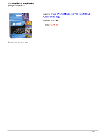 Tytuł główny nagłówka podtytuł nagłówka nazwa: Tusz INCORE do Hp 703 (CD888AE) Color 16ml reg. producent: INCORE cena: 42.48 zł Incore, tusz alternatywny 1/2 Tytuł główny nagłówka podtytuł nagłówka Nazwa typu Opis ogólny nazwa Technologia druku Rodzaj materiału eksploatacyjnego Kompatybilny z modelami Pojemność (ml) Rodzaj produktu Kolor: Producent OEM Symbol OEM Chip Okres rękojmi w miesiącach wartość Materiały eksploatacyjne Kartridż z tuszem INCORE do zastosowania w drukarkach Hewlett Packard atramentowa Kartridż z tuszem HP DeskJet D730, HP DeskJet F735, HP DeskJet Ink Advantage F735 all-in-one, HP DeskJet Ink Advantage K209a, HP DeskJet Ink Advantage New K209g, HP DeskJet K209, HP PhotoSmart Ink Advantage K510a 16.0 ml refabrykowany cyan, magenta, yellow (niebieski, purpurowy, żółty) Hewlett Packard 703 (CD888AE) Tak 24 2/2