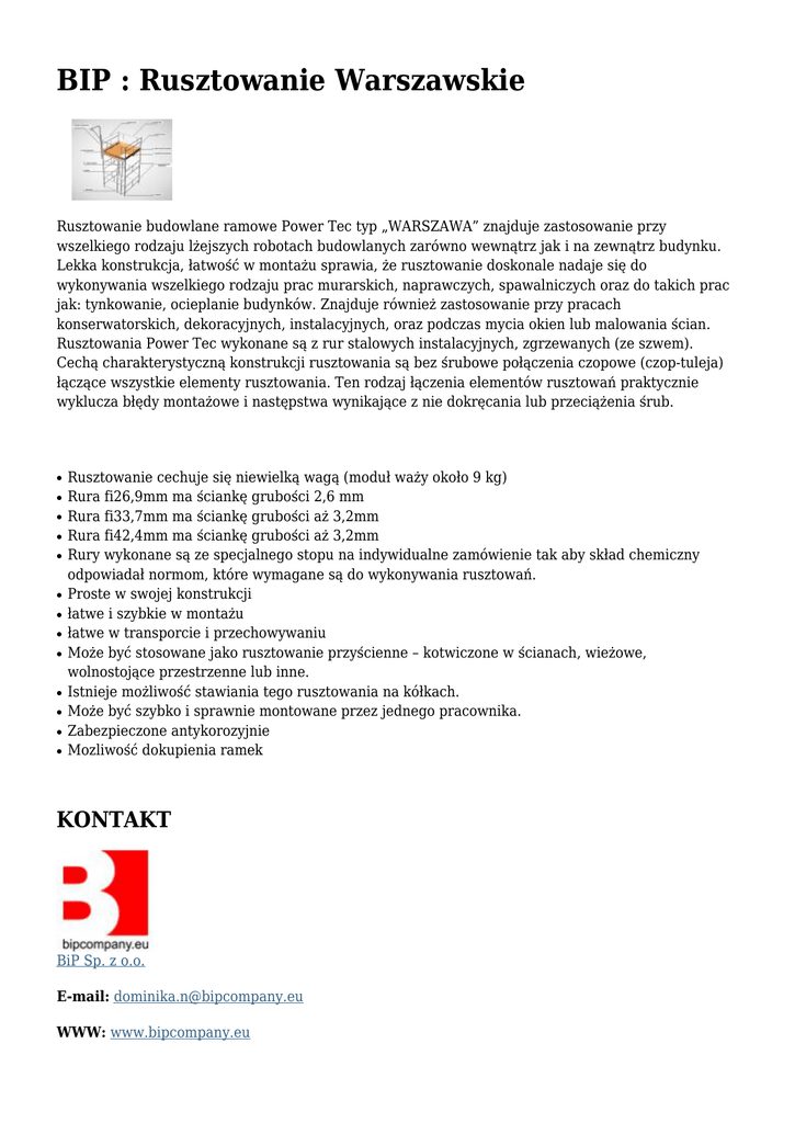 BIP : Rusztowanie Warszawskie Rusztowanie budowlane ramowe Power Tec typ „WARSZAWA” znajduje zastosowanie przy wszelkiego rodzaju lżejszych robotach budowlanych zarówno wewnątrz jak i na zewnątrz budynku. Lekka konstrukcja, łatwość w montażu sprawia, że rusztowanie doskonale nadaje się do wykonywania wszelkiego rodzaju prac murarskich, naprawczych, spawalniczych oraz do takich prac jak: tynkowanie, ocieplanie budynków. Znajduje również zastosowanie przy pracach konserwatorskich, dekoracyjnych, instalacyjnych, oraz podczas mycia okien lub malowania ścian. Rusztowania Power Tec wykonane są z rur stalowych instalacyjnych, zgrzewanych (ze szwem). Cechą charakterystyczną konstrukcji rusztowania są bez śrubowe połączenia czopowe (czop-tuleja) łączące wszystkie elementy rusztowania. Ten rodzaj łączenia elementów rusztowań praktycznie wyklucza błędy montażowe i następstwa wynikające z nie dokręcania lub przeciążenia śrub. ● ● ● ● ● ● ● ● ● ● ● ● ● Rusztowanie cechuje się niewielką wagą (moduł waży około 9 kg) Rura fi26,9mm ma ściankę grubości 2,6 mm Rura fi33,7mm ma ściankę grubości aż 3,2mm Rura fi42,4mm ma ściankę grubości aż 3,2mm Rury wykonane są ze specjalnego stopu na indywidualne zamówienie tak aby skład chemiczny odpowiadał normom, które wymagane są do wykonywania rusztowań. Proste w swojej konstrukcji łatwe i szybkie w montażu łatwe w transporcie i przechowywaniu Może być stosowane jako rusztowanie przyścienne – kotwiczone w ścianach, wieżowe, wolnostojące przestrzenne lub inne. Istnieje możliwość stawiania tego rusztowania na kółkach. Może być szybko i sprawnie montowane przez jednego pracownika. Zabezpieczone antykorozyjnie Mozliwość dokupienia ramek KONTAKT BiP Sp. z o.o. E-mail: [email protected] WWW: www.bipcompany.eu Tel: + 48 723 400 900 Adres: Piaskowo 11a 64-500 Szamotuły