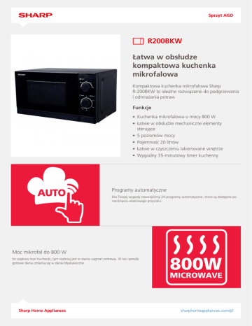 Sprzęt AGD R200BKW Łatwa w obsłudze kompaktowa kuchenka mikrofalowa Kompaktowa kuchenka mikrofalowa Sharp R-200BKW to idealne rozwiązanie do podgrzewania i odmrażania potraw Funkcje Kuchenka mikrofalowa o mocy 800 W Łatwe w obsłudze mechaniczne elementy sterujące 5 poziomów mocy Pojemność 20 litrów Łatwe w czyszczeniu lakierowane wnętrze Wygodny 35-minutowy timer kuchenny Programy automatyczne Dla Twojej wygody stworzyliśmy 24 programy automatyczne, które są dostępne po naciśnięciu właściwego przycisku. Moc mikrofal do 800 W Im większa moc kuchenki, tym szybciej jest w stanie zagrzać potrawę. W ten sposób gotowe dania zmienią się w dania błyskawiczne. Sharp Home Appliances sharphomeappliances.com/pl Sprzęt AGD Kluczowe cechy Automatyczne programy pieczenia ciasta Nie Zegar Nie Przycisk "Info" Nie Przycisk "Język" Nie Funkcja plus 1 minuta / +30s No / No Kolor kuchenki Black Automatyczne programy gotowania i rozmrażania 5 Korekcja ustawień (WIĘCEJ/MNIEJ) Nie Materiał, z którego wykonane jest wnętrze kuchenki Grey paint Tryb pracy połączonej: grill (kwarcowy i w podczerwieni) Nie Automatyczne programy przygotowania pizzy Nie Tryb pracy połączonej: termoobieg + mikrofale No Funkcja podgrzewania Nie Timer (maks. podawanie minut i sekund) 35/00 Średnica talerza obrotowego w cm / materiał 25 Pojemność komory (w litrach) 20 Zakres regulacji temperatury termoobiegu (°C) – Tryb pracy połączonej: grill (kwarcowy lub w podczerwieni) + mikrofale Nie Tryb oszczędzania energii Nie Menu FUN lub automatyczne programy do zakąsek – Moc wyjściowa Moc wyjściowa (W) 800 Poziomy mocy mikrofal 5 Termoobieg (W) – Grill kwarcowy (W) – Grill w podczerwieni (W) – Waga (kg) 10.9 kg Mocy, zużycia i napięcia Bezpiecznik źródła zasilania/wyłącznik obwodu (A) 10 Wymiary i waga Wymiary wewnętrzne (szer.) x (wys.) x (gł.) mm 306 x 208.2 x 306.6 Wymiary zewnętrzne (szer.) x (wys.) x (gł.) mm 439.5 x 256.2 x 338.2 Sharp Home Appliances sharphomeappliances.com/pl Sprzęt AGD Wyposażenie Wysoki ruszt Nie Kwadratowa półka Nie Niski ruszt Nie Kwadratowy pojemnik Nie European article number Kod EAN Sharp Home Appliances Powered by TCPDF (www.tcpdf.org) 4974019755991 sharphomeappliances.com/pl