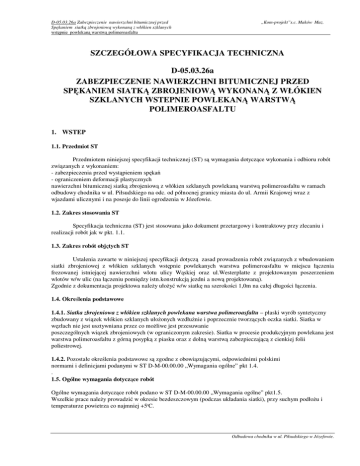 D-05.03.26a Zabezpieczenie nawierzchni bitumicznej przed Spękaniem siatką zbrojeniową wykonaną z włókien szklanych wstępnie powlekaną warstwą polimeroasfaltu „Kom-projekt”s.c. Maków Maz. SZCZEGÓŁOWA SPECYFIKACJA TECHNICZNA D-05.03.26a ZABEZPIECZENIE NAWIERZCHNI BITUMICZNEJ PRZED SPĘKANIEM SIATKĄ ZBROJENIOWĄ WYKONANĄ Z WŁÓKIEN SZKLANYCH WSTEPNIE POWLEKANĄ WARSTWĄ POLIMEROASFALTU 1. WSTEP 1.1. Przedmiot ST Przedmiotem niniejszej specyfikacji technicznej (ST) są wymagania dotyczące wykonania i odbioru robót związanych z wykonaniem: - zabezpieczenia przed wystąpieniem spękań - ograniczeniem deformacji plastycznych nawierzchni bitumicznej siatką zbrojeniową z włókien szklanych powlekaną warstwą polimeroasfaltu w ramach odbudowy chodnika w ul. Piłsudskiego na odc. od północnej granicy miasta do ul. Armii Krajowej wraz z wjazdami ulicznymi i na posesje do linii ogrodzenia w Józefowie. 1.2. Zakres stosowania ST Specyfikacja techniczna (ST) jest stosowana jako dokument przetargowy i kontraktowy przy zlecaniu i realizacji robót jak w pkt. 1.1. 1.3. Zakres robót objętych ST Ustalenia zawarte w niniejszej specyfikacji dotyczą zasad prowadzenia robót związanych z wbudowaniem siatki zbrojeniowej z włókien szklanych wstępnie powlekanych warstwa polimeroasfaltu w miejscu łączenia frezowanej istniejącej nawierzchni wlotu ulicy Wąskiej oraz ul.Westerplatte z projektowanym poszerzeniem wlotów w/w ulic (na łączeniu pomiędzy istn.konstrukcją jezdni a nową projektowaną). Zgodnie z dokumentacja projektowa należy ułożyć w/w siatkę na szerokości 1,0m na całej długości łączenia. 1.4. Określenia podstawowe 1.4.1. Siatka zbrojeniowa z włókien szklanych powlekana warstwa polimeroasfaltu – płaski wyrób syntetyczny zbudowany z wiązek włókien szklanych ułożonych wzdłużnie i poprzecznie tworzących oczka siatki. Siatka w węzłach nie jest usztywniana przez co możliwe jest przesuwanie poszczególnych wiązek zbrojeniowych (w ograniczonym zakresie). Siatka w procesie produkcyjnym powlekana jest warstwa polimeroasfaltu z górną posypką z piasku oraz z dolną warstwą zabezpieczającą z cienkiej folii poliestrowej. 1.4.2. Pozostałe określenia podstawowe są zgodne z obowiązującymi, odpowiednimi polskimi normami i definicjami podanymi w ST D-M-00.00.00 „Wymagania ogólne” pkt 1.4. . 1.5. Ogólne wymagania dotyczące robót Ogólne wymagania dotyczące robót podano w ST D-M-00.00.00 „Wymagania ogólne” pkt1.5. Wszelkie prace należy prowadzić w okresie bezdeszczowym (podczas układania siatki), przy suchym podłożu i temperaturze powietrza co najmniej +50C. Odbudowa chodnika w ul. Piłsudskiego w Józefowie. „Kom-projekt” s.c. Maków Maz. D-05.03.26a Zabezpieczenie nawierzchni bitumicznej przed spękaniem siatką zbrojeniową wykonaną z włókien szklanych wstępnie powlekaną warstwą polimeroasfaltu 2. MATERIAŁY Do wykonania powyższych robót należy stosować następujące materiały: · emulsje asfaltowa kationowa szybko rozpadowa o zawartości asfaltu 60% - 70%, · siatkę z włókien szklanych wstępnie powlekana polimeroasfaltem. 2.1. Emulsja asfaltowa Do wykonania warstwy sczepnej na powierzchni, na której ma być ułożona siatka nalezy stosować emulsje asfaltowa szybko rozpadowa o zawartości asfaltu od 60% do 70%, o właściwościach zgodnych z określonymi w Warunkach Technicznych IBDiM nr 47, “ Drogowe kationowe emulsje asfaltowe” dla emulsji K1-60, K1-65 lub K1-70. 2.2. Siatka zbrojeniowa Do wykonania robót należy zastosować wyrób złożony z siatki szklanej wstępnie powlekanej warstwa polimeroasfaltu.(np. S&P Glasphalt G lub innej spełniającej poniższe warunki i wymagania) Szczegółowe wymagania dotyczące siatki podano w tablicy1. Tablica 1 Wymagania dla siatki Parametr Wartość Materiał Włókno szklane Wydłużenie graniczne przy zerwaniu [%] Max. 3,0 Ilość wiązek włókna na 1mb: - wszerz -wzdłuż Wytrzymałość na rozciąganie [kN/m] -wszerz -wzdłuż 51+/-2 48+/-2 min. 120 min. 120 Siatka powinna być produkowana zgodnie z wymaganiami określonymi w normie jakościowej ISO 9002 (EN 29002). Siatka powinna posiadać aprobatę techniczna IBDiM. 3. SPRZET Ogólne wymagania dotyczące sprzętu podano w ST D-M.00.00.00. "Wymagania Ogólne" pkt. 3. Do wykonania robót powinien być stosowany sprzęt zaakceptowany przez Kierownika Projektu. Należy stosować: · skrapiarkę do wykonania skropienia emulsja asfaltowa, · urządzenie do maszynowego rozkładania siatki (w przypadku znacznej powierzchni robót) · ręczne palniki gazowe 4. TRANSPORT Ogólne warunki dotyczące transportu podano w ST D-M.00.00.00. "Wymagania Ogólne" pkt 4. Siatkę należy transportować w rolkach opakowanych fabrycznie, ułożonych poziomo na równym podłożu i w sposób zabezpieczający przed mechanicznymi uszkodzeniami. Odbudowa chodnika w ul. Piłsudskiego w Józefowie. D-05.03.26a Zabezpieczenie nawierzchni bitumicznej przed Spękaniem siatką zbrojeniową wykonaną z włókien szklanych wstępnie powlekaną warstwą polimeroasfaltu „Kom-projekt”s.c. Maków Maz. 5. WYKONANIE ROBÓT Ogólne zasady wykonania robót podano w ST D-M.00.00.00."Wymagania Ogólne"pkt. 5. 5.1 Wbudowanie siatki Podłoże: stabilne (nośne) nawierzchnie bitumiczne zarówno nowo wykonane jak i sfrezowane lub stare. Powierzchnie podłoża należy oczyścić i usunąć wszelkie luźne czesci. Lokalne ubytki lub szczeliny w podłożu o szerokości powyżej 4 mm musza być wypełnione lub naprawione odpowiednimi masami naprawczymi. Tak przygotowane podłoże należy skropić emulsje asfaltowa szybko rozpadowa w ilości od około 0,33 kg/m2 (emulsja 60%) do 0,28 kg/m2 (emulsja 70%). Przy skropieniu lepiszczem asfaltowym na gorąco – ilość 0,2 kg/m2 , dla podłoży frezowanych skropienie powinno być intensywniejsze o ok.50%. Należy przestrzegać ogólnych zasad wykonania skropienia, obowiązujących przy wykonywaniu poł