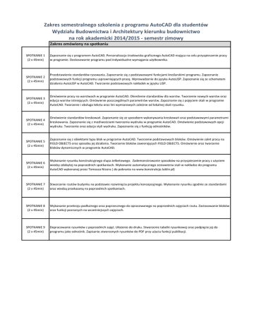 Zakres semestralnego szkolenia z programu AutoCAD dla studentów Wydziału Budownictwa i Architektury kierunku budownictwo na rok akademicki 2014/2015 - semestr zimowy Zakres omówiony na spotkaniu SPOTKANIE 1 (2 x 45min) Zapoznanie się z programem AutoCAD. Personalizacja środowiska graficznego AutoCAD mająca na celu przyspieszenie pracy w programie. Dostosowanie programu pod indywidualne wymagania użytkownika. SPOTKANIE 2 (2 x 45min) Przedstawienie standardów rysowania. Zapoznanie się z podstawowymi funkcjami kreślarskimi programu. Zapoznanie podstawowych funkcji programu usprawniających pracę. Wprowadzenie do języka AutoLISP. Zapoznanie się ze schematem działania AutoLISP w AutoCAD. Tworzenie podstawowych nakładek w języku LISP. SPOTKANIE 3 (2 x 45min) Omówienie pracy na warstwach w programie AutoCAD. Określenie standardów dla warstw. Tworzenie nowych warstw oraz edycja warstw istniejących. Omówienie poszczególnych parametrów warstw. Zapoznanie się z pojęciem skali w programie AutoCAD. Tworzenie i obsługa tekstu oraz lini wymiarowych zależnie od lokalnej skali rysunku. SPOTKANIE 4 (2 x 45min) Omówienie standardów kreskowań. Zapoznanie się ze sposobem wykonywania kreskowań oraz podstawowymi parametrami kreskowania. Zapoznanie się z możliwościami tworzenia wydruku w programie AutoCAD. Omówienie podstawowych opcji wydruku. Tworzenie oraz edycja styli wydruku. Zapoznanie się z funkcją odnośników. SPOTKANIE 5 (2 x 45min) Zapoznanie się z obiektami typu blok w programie AutoCAD. Tworzenie podstawowych bloków. Omówienie zalet pracy na FIELD OBJECTS oraz sposobu jej działania. Tworzenie bloków zawierających FIELD OBJECTS. Omówienie oraz tworzenie bloków dynamicznych w programie AutoCAD. SPOTKANIE 6 (2 x 45min) Wykonanie rysunku konstrukcyjnego słupa żelbetowego. Zademonstrowanie sposobów na przyspieszenie pracy z użyciem wiedzy zdobytej na poprzednich spotkaniach. Wykonanie automatycznego zestawienia stali w nakładce do programu AutoCAD wykonanej przez Tomasza Nicera ( do pobrania na www.konstrukcje.lublin.pl) SPOTKANIE 7 (2 x 45min) Stworzenie rzutów budynku na podstawie rozwinięcia projektu koncepcyjnego. Wykonanie rysunku zgodnie ze standardami oraz wiedzą przekazaną na poprzednich spotkaniach. SPOTKANIE 8 (2 x 45min) Wykonanie przekroju podłużnego oraz poprzecznego do opracowanego na poprzednich zajęciach rzutu. Zastosowanie bloków oraz funkcji poznanych na wcześniejszych zajęciach. SPOTKANIE 9 (2 x 45min) Dopracowanie rysunków z poprzednich zajęć. Ułożenie do druku. Stworzenie tabelki rysunkowej oraz podpięcie jej do programu jako odnośnik. Zapisanie stworzonych rysunków do PDF przy użyciu funkcji publikacji.