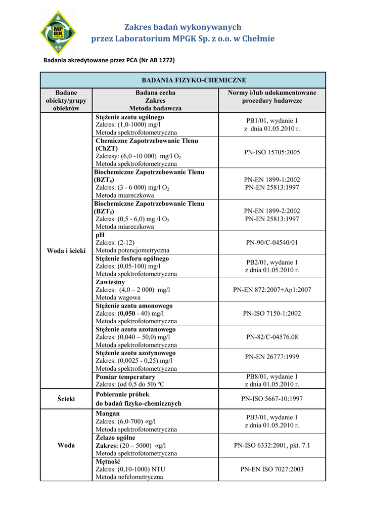 Zakres badań wykonywanych przez Laboratorium MPGK Sp. z o.o. w Chełmie Badania akredytowane przez PCA (Nr AB 1272) BADANIA FIZYKO-CHEMICZNE Badane obiekty/grupy obiektów Woda i ścieki Ścieki Woda Badana cecha Zakres Metoda badawcza Stężenie azotu ogólnego Zakres: (1,0-1000) mg/l Metoda spektrofotometryczna Chemiczne Zapotrzebowanie Tlenu (ChZT) Zakresy: (6,0 -10 000) mg/l O2 Metoda spektrofotometryczna Biochemiczne Zapotrzebowanie Tlenu (BZT5) Zakres: (3 - 6 000) mg/l O2 Metoda miareczkowa Biochemiczne Zapotrzebowanie Tlenu (BZT5) Zakres: (0,5 - 6,0) mg /l O2 Metoda miareczkowa pH Zakres: (2-12) Metoda potencjometryczna Stężenie fosforu ogólnego Zakres: (0,05-100) mg/l Metoda spektrofotometryczna Zawiesiny Zakres: (4,0 – 2 000) mg/l Metoda wagowa Stężenie azotu amonowego Zakres: (0,050 - 40) mg/l Metoda spektrofotometryczna Stężenie azotu azotanowego Zakres: (0,040 – 50,0) mg/l Metoda spektrofotometryczna Stężenie azotu azotynowego Zakres: (0,0025 - 0,25) mg/l Metoda spektrofotometryczna Pomiar temperatury Zakres: (od 0,5 do 50) ºC Pobieranie próbek do badań fizyko-chemicznych Mangan Zakres: (6,0-700) µg/l Metoda spektrofotometryczna Żelazo ogólne Zakres: (20 – 5000) µg/l Metoda spektrofotometryczna Mętność Zakres: (0,10-1000) NTU Metoda nefelometryczna Normy i/lub udokumentowane procedury badawcze PB1/01, wydanie 1 z dnia 01.05.2010 r. PN-ISO 15705:2005 PN-EN 1899-1:2002 PN-EN 25813:1997 PN-EN 1899-2:2002 PN-EN 25813:1997 PN-90/C-04540/01 PB2/01, wydanie 1 z dnia 01.05.2010 r. PN-EN 872:2007+Ap1:2007 PN-ISO 7150-1:2002 PN-82/C-04576.08 PN-EN 26777:1999 PB8/01, wydanie 1 z dnia 01.05.2010 r. PN-ISO 5667-10:1997 PB3/01, wydanie 1 z dnia 01.05.2010 r. PN-ISO 6332:2001, pkt. 7.1 PN-EN ISO 7027:2003 Zakres badań wykonywanych przez Laboratorium MPGK Sp. z o.o. w Chełmie BADANIA FIZYKO-CHEMICZNE Badane obiekty/grupy obiektów Badana cecha Zakres Metoda badawcza Przewodność elektryczna właściwa (temp. odniesienia 25ºC) Zakres: (15-1413) µS/cm Metoda konduktometryczna Pobieranie próbek do badań fizyko-chemicznych Normy i/lub udokumentowane procedury badawcze PN-EN 27888:1999 PN- ISO 5667-5:2003 PN-ISO 5667-11:2004 BADANIA MIKROBIOLOGICZNE Badane obiekty/grupy obiektów Woda Badana cecha Zakres Metoda badawcza Liczba bakterii grupy Coli granica wykrywalności < 1 jtk w 100 ml Metoda filtracji membranowej Liczba bakterii Escherichia Coli granica wykrywalności < 1 jtk w 100 ml Metoda filtracji membranowej Liczba mikroorganizmów w (22±2)º C po 68±4h jtk w 1 ml Metoda posiewu wgłębnego Normy i/lub udokumentowane procedury badawcze PB4/02, wydanie 2 z dnia 29.10.2010 r. PB4/02, wydanie 2 z dnia 29.10.2010 r. PN-EN ISO 6222:2004 Pobieranie próbek do badań mikrobiologicznych PN-EN ISO 19458:2007 Pozostałe badania laboratoryjne wykonywane w Laboratorium MPGK Sp. z o.o. w Chełmie BADANIA FIZYKO-CHEMICZNE Badane obiekty/grupy obiektów Woda i ścieki Badana cecha Zakres Metoda badawcza Azot amonowy Zakres: (10 – 500) mg /l Metoda destylacyjna z miareczkowaniem Ortofosforany Zakres: (0,04 -100) mg/l PO43Metoda spektrofotometryczna Chlorki Zakres: (5 -250) mg/l Cl Metoda miareczkowa Normy i/lub udokumentowane procedury badawcze PN-ISO 5664:2002 PN-EN ISO 6878:2006 +Ap1:2010+Ap2:2010, p.4 PN-ISO 9297:1994 Zakres badań wykonywanych przez Laboratorium MPGK Sp. z o.o. w Chełmie BADANIA FIZYKO-CHEMICZNE Badane obiekty/grupy obiektów Ścieki Woda Osady Badana cecha Zakres Metoda badawcza Chlor wolny Zakres: 0-2,0 mg/l Cl2 Metoda: Test firmy Merck Tlen rozpuszczony Zakres: (0,2-20) mg /l O2 Metoda miareczkowa Siarczany Zakres: 2 – 70 mg/l SO42Metoda spektrofotometryczna Opadalność osadu czynnego Zakres: 0-1 000 ml po ½ godziny; po 1 godzinie Metoda objętościowa Indeks osadu czynnego Metoda obliczeniowa Stężenie osadu czynnego Zakres: do 7000 mg/l Metoda wagowa Żelazo ogólne Zakres: (20 – 5000) µg/l Metoda spektrofotometryczna Pobieranie próbek do badań fizyko-chemicznych Barwa Zakres: 5,0-70 mg/l Pt Metoda wizualna Zapach Zakres: 1-5 Metoda organoleptyczna Sumaryczna zawartość wapnia i magnezu (Twardość ogólna) Zakres: (5- 500) mg/l CaCO3 Metoda miareczkowa Pobieranie próbek do badań fizyko-chemicznych Stężenie azotu azotanowego Zakres: (0,040 – 50) mg/l Metoda spektrofotometryczna Normy i/lub udokumentowane procedury badawcze PB7/01, wydanie 1 z dnia 01.05.2010 r. PN-EN 25813:1997 PB11/01, wyd.1 z dnia 10.05.2011 PN-EN 14702-1:2008 PN-ISO 6332:2001, pkt. 7.1 PN-EN ISO 5667-1:2008 PN-ISO 5667-14:2004 PN-EN ISO 5667-3:2005 PN-EN ISO 7887:2002 PB9/01, wydanie 1 z dnia 01.05.2010 r. PN-ISO 6059:1999 PN-EN ISO 5667-1:2008 PN-EN ISO 5667-3:2005 PN-ISO 5667-6:2003 PN-ISO 5667-14:2004 PN-82/C-04576.08 Zakres badań wykonywanych przez Laboratorium MPGK Sp. z o.o. w Chełmie BADANIA FIZYKO-CHEMICZNE Badane obiekty/grupy obiektów Badana cecha Zakres Metoda badawcza Pomiar temperatury Zakres: (od 0 do + 50) ºC pH Zakres: (1-12) Metoda potencjometryczna Pozostałość po prażeniu (substancje mineralne) Zakres: (1-99)% sm Metoda wagowa % sm Straty po prażeniu (substancje organiczne) Zakres: (1-99) % sm Metoda wagowa % sm Stopień przefermentowania Zakres: (1-99) % sm Metoda obliczeniowa % sm Zawartość wody w osadzie Metoda wagowa % Sucha masa Metoda wagowa % Badania fizyko-chemiczne Zakres: Pobieranie próbek do badań Normy i/lub udokumentowane procedury badawcze PB8/01, wydanie 1 z dnia 01.05.2010 r. PN-90/C-04540/01 PN-EN 12879:2004 PN-EN 12880:2004 PN-EN ISO 5667-1:2008 PN-ISO 5667-14:2004 BADANIA MIKROBIOLOGICZNE Badane obiekty/grupy obiektów Woda Badana cecha Zakres Metoda badawcza Liczba Enterkoków kałowych granica wykrywalności < 1 jtk w 100 ml Metoda filtracji membranowej Liczba bakterii Clostridium perfringens (łącznie z przetrwalnikami) granica wykrywalności < 1 jtk w 100 ml Metoda filtracji membranowej Normy i/lub udokumentowane procedury badawcze PN-EN ISO 7899-2:2004 PB10/01, wydanie 1 z dnia 03.12.2012 r.
