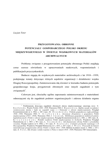 Lucjan Teter PRZYGOTOWANIA OBRONNE POTENCJAŁU GOSPODARCZEGO POLSKI OKRESU MIĘDZYWOJENNEGO W ŚWIETLE WOJSKOWYCH MATERIAŁÓW ARCHIWALNYCH Problemy związane z przygotowaniem potencjału obronnego Polski znajdują coraz szersze oświetlenie w opracowaniach naukowych, wspomnieniach i publikacjach przyczynkarskich. Badacze sięgają do wojskowych materiałów archiwalnych z lat 1918—1939, podejmując tematy dotyczące różnych aspektów organizacji i działalności wojska Drugiej Rzeczypospolitej. Zainteresowania idą również w kierunku badania potencjału gospodarczego kraju, przygotowań obronnych oraz innych zagadnień z tym związanych1. Celowym jest, chociażby ogólne zapoznanie zainteresowanych z materiałami odnoszącymi się do zagadnień podstaw organizacyjnych i zakresu działania organu 1 Problematykę dotyczącą zagadnień obronnych okresu międzywojennego omawiają m.in.: E. K o z ł o w s k i, Wojsko Polskie 1836—1939, Warszawa 1964; I. B u j n i e w i c z, Ogólne zasady wycofania i rozmieszczenia mienia i ludzi na wypadek wojny z i Niemcami w okresie międzywojennym, Przegląd Kwatermistrzowski nr 2, 1962, s. 105 i nast.; M. D r o z d o w s k i, Polityka gospodarcza rządu polskiego 1936—1938, Warszawa 1963; T. G r a b o w s k i, Inwestycje zbrojeniowe w gospodarce Polski międzywojennej (1922—1939), Warszawa 1963; J. I w a n i a k, Mobilizacja gospodarcza niektórych państw kapitalistycznych i Polski w okresie międzywojennym, Przegląd Kwatermistrzowski nr 2, 1961, s. 108 i nast.; K. K r z y ż a n o w s k i, Wydatki wojskowe Polski międzywojennej (w liczbach), Wojskowy Przegląd Ekonomiczny nr 1, 1967, s. 90 i nast.; L. S z y m a ń s k i, Jak finansowano obronę Polski w przededniu września, Wojsko Ludowe nr 9, 1960, s. 34 i nast.; P. S t a w e c k i, Z dziejów przemysłu wojennego w II Rzeczypospolitej, Wojskowy Przegląd Historyczny nr 1, 1071, s, 267 i nast.; J. W i a t r, Przyczynki do historii materiałowego przygotowania obrony Polski w latach 1921—1939, Bellona (Londyn) zeszyt 3, 1868, s. 235 i nast.; S. F e r e t, Siły zbrojne i sztuka wojenna w Polsce w latach 1918—1939, Warszawa 1967 (maszynopis). wojskowego, koordynującego przygotowania obronne w resortach cywilnych, funkcjonowanie wydziałów wojskowych w tych resortach oraz prace mobilizacyjne ha odcinku potencjału gospodarczego kraju. W zasobie Centralnego Archiwum Wojskowego znajdują się interesujące przekazy źródłowe, które pozwalają badaczowi prześledzić działalność odpowiednich resortów państwowych okresu międzywojennego w zakresie przygotowań obronnych. Organem koordynującym całokształt prac przygotowawczych było początkowo Biuro II zastępcy szefa Sztabu Głównego, a następnie Sekretariat Komitetu Obrony Rzeczypospolitej (SeKOR). * Aktem prawnym dającym podstawę organizacyjną, zakres i kierunek działania na odcinku przygotowania obrony państwa, było rozporządzenie prezydenta RP z dnia 25 października 1926 roku o utworzeniu Komitetu Obrony Państwa2. Do zakresu jego działania należało rozpatrywanie zagadnień dotyczących obrony kraju i opracowanie wytycznych dla mobilizacyjnego zorganizowania sił państwa. W tym zakresie Komitet opracowywał dla rządu odpowiednie wnioski. Istotne znaczenie dla funkcjonowania władz wojskowych w zakresie organizacji przygotowań obronnych miało powołanie w roku 1926 generalnego inspektora sił zbrojnych3. Jemu to właśnie został podporządkowany Sztab Główny (do roku 1928 — Generalny), zajmujący się całokształtem zagadnień dotyczących obrony kraju. W celu bezpośredniego odciążenia szefa Sztabu Głównego w zakresie prac koordynacyjnych i podejmowanych przedsięwzięć na odcinku obrony, utworzono w roku 1928 stanowisko II zastępcy szefa Sztabu Głównego, a równocześnie dotychczasowy zastępca przemianowany został na I zastępcę4. Do zakresu czynności II zastępcy szefa Sztabu Głównego należały m.in. sprawy mobilizacji gospodarczej państwa, koordynacji prac prowadzonych w poszczególnych ministerstwach cywilnych oraz w wojsku w tym 2 Dziennik Ustaw RP (Dz. URP) nr 108, poz. 633 — 30.10.1926 roku. Dz. URP nr 79, poz. 445 — 6.08.1926 roku. 4 Rozkaz szefa Sztabu Głównego nr 1025/og.org. z dnia 6.10.1926 roku. CAW, GISZ, sygn. 302.4.210. 3 przedmiocie, jak też wszelkie inne wchodzące w ramy funkcjonowania poszczególnych ministerstw, a dotyczące obrony państwa. Zagadnienia obrony państwa związane z zakresem prac ministerstw: Komunikacji, Poczt i Telegrafów, Robót Publicznych, lecz nie dotyczące zaopatrzenia materiałowego opracowywane były przez Oddział IV Sztabu. Współpraca z Ministerstwem Spraw Zagranicznych należała do Oddziału II Sztabu Głównego5. W latach 1930—1936 zachodziły zmiany zmierzające do uściślenia form organizacyjnych komórek Sztabu Głównego, rozgraniczenia kompetencji i czynności oraz tworzenia nowych stanowisk. W tym taż okresie zlikwidowane zostało stanowisko II zastępcy szefa Sztabu Głównego i jego organ pracy6. Dekretem prezydenta RP z dnia 9 maja 1936 roku ustanowiono Komitet Obrony Rzeczypospolitej. Jego komórką wykonawczą był Sekretariat powołany przy generalnym inspektorze sił zbrojnych7. SeKOR wszedł w skład Sztabu Głównego. Kierownikiem jego został zastępca szefa Sztabu Głównego, gen. bryg. Tadeusz Malinowski. Tymczasowa organizacja i składy osobowe Sztabu Głównego z roku 1936 określały, iż Sztab Główny jest organem pracy generalnego inspektora w zakresie przygotowania sił zbrojnych do obrony państwa. Szef Sztabu Głównego w swej działalności kierował się wytycznymi generalnego inspektora sił zbrojnych. W sprawach związanych z przygotowaniem obrony kraju był on zastępcą generalnego inspektora. W ramach kompetencji i potrzeb Sztabu Głównego, współpracował z ministrem spraw wojskowych i ministrami resortów cywilnych. Zastępca szefa Sztabu Głównego, 5 a równocześnie kierownik S