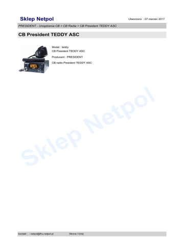 Sklep Netpol Utworzono : 07 marzec 2017 PRESIDENT - Urządzenia CB > CB Radia > CB President TEDDY ASC CB President TEDDY ASC Model : teddy CB President TEDDY ASC Producent : PRESIDENT CB radio President TEDDY ASC S N p e l k kontakt : - [email protected] p t e Strona 1/{nb} l o Sklep Netpol Utworzono : 07 marzec 2017 PRESIDENT - Urządzenia CB > CB Radia > CB President TEDDY ASC CB President TEDDY ASC S N p e l k kontakt : - [email protected] p t e Strona 2/{nb} l o Sklep Netpol Utworzono : 07 marzec 2017 PRESIDENT - Urządzenia CB > CB Radia > CB President TEDDY ASC CB President TEDDY ASC Kompaktowe radio CB z podstawowymi 40 kanałami pracujące w pasmie 27 MHZ z modulacją AM i FM. Radio posiada ciekłokrystaliczny wyświetlacz LCD. Parametry techniczne: Ilość kanałów 40 Modulaca AM i FM Częstotliwość 26,960-27,405 MHz Impedancja anteny 50om Zasilanie 13,2 V DC czułość przy 20 dB SINAD: 0,5uV-113 dBm Selektywność 60dB ASC Wymiary radia: szer 125 mm wysokość 45 mm głębokość 170 mm Masa radia 0,6 kg p t e N p Radio jest nowe z 24 mieisięczną gwarancją Cena : 350.00 zł Brutto ( 284.55 zł Netto) e l k Dostępność: Produkt dostępny w naszym sklepie od 28 kwiecień 2015 S kontakt : - [email protected] Strona 3/{nb} l o