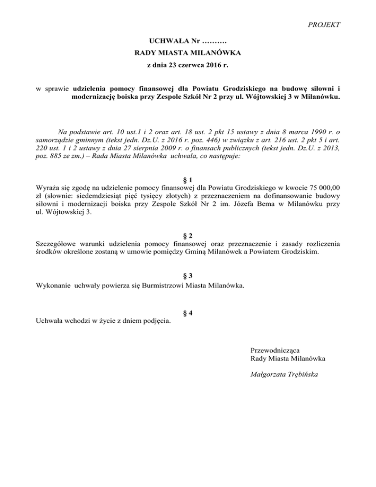 PROJEKT UCHWAŁA Nr ………. RADY MIASTA MILANÓWKA z dnia 23 czerwca 2016 r. w sprawie udzielenia pomocy finansowej dla Powiatu Grodziskiego na budowę siłowni i modernizację boiska przy Zespole Szkół Nr 2 przy ul. Wójtowskiej 3 w Milanówku. Na podstawie art. 10 ust.1 i 2 oraz art. 18 ust. 2 pkt 15 ustawy z dnia 8 marca 1990 r. o samorządzie gminnym (tekst jedn. Dz.U. z 2016 r. poz. 446) w związku z art. 216 ust. 2 pkt 5 i art. 220 ust. 1 i 2 ustawy z dnia 27 sierpnia 2009 r. o finansach publicznych (tekst jedn. Dz.U. z 2013, poz. 885 ze zm.) – Rada Miasta Milanówka uchwala, co następuje: §1 Wyraża się zgodę na udzielenie pomocy finansowej dla Powiatu Grodziskiego w kwocie 75 000,00 zł (słownie: siedemdziesiąt pięć tysięcy złotych) z przeznaczeniem na dofinansowanie budowy siłowni i modernizacji boiska przy Zespole Szkół Nr 2 im. Józefa Bema w Milanówku przy ul. Wójtowskiej 3. §2 Szczegółowe warunki udzielenia pomocy finansowej oraz przeznaczenie i zasady rozliczenia środków określone zostaną w umowie pomiędzy Gminą Milanówek a Powiatem Grodziskim. §3 Wykonanie uchwały powierza się Burmistrzowi Miasta Milanówka. §4 Uchwała wchodzi w życie z dniem podjęcia. Przewodnicząca Rady Miasta Milanówka Małgorzata Trębińska UZASADNIENIE Zadanie polegające na budowie siłowni oraz modernizacji boiska szkolnego realizowane będzie przez Powiat Grodziski – przewiduje się, że prace obejmą budowę siłowni napowietrznej orz modernizację boiska sportowego w zakresie budowy toru wrotkarskiego. Zgodnie z zapisami uchwały budżetowej Miasta Milanówka na rok 2016 na wsparcie realizacji tego zadania przeznacza się 75.000,00 zł (926/92601/6300). Zabezpieczone środki zostaną przekazane powiatowi po zawarciu stosownej umowy. Przygotował: Adam Adamczyk