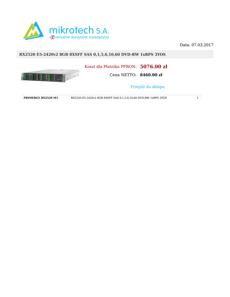 Data: 07.03.2017 RX2520 E5-2420v2 8GB 8XSFF SAS 0,1,5,6,10,60 DVD-RW 1xRPS 3YOS Koszt dla Płatnika PFRON: 5076.00 zł Cena NETTO: 8460.00 zł Przejdź do sklepu PRIMERGY RX2520 M1 RX2520 E5-2420v2 8GB 8XSFF SAS 0,1,5,6,10,60 DVD-RW 1xRPS 3YOS 1 Niniejsze zestawienie nie stanowi oferty w rozumieniu Kodeksu Cywilnego i nie może stanowić podstaw do jakichkolwiek roszczeń względem Mikrotech S.A. Dział handlowy Wiktor Mosoń Dyrektor ds. sprzedaży tel.: 13 43 76 312 kom.: 609 807 897 e-mail: [email protected] Andrzej Pelczar tel.: 13 43 76 350 kom.: 609 807 930 e-mail: [email protected] Paweł Urba tel.: 13 43 76 440 kom.: 609 807 163 e-mail: [email protected] Teresa Przybylska Zastępca dyrektora ds. sprzedaży tel.: 13 43 76 313 kom.: 609 807 931 e-mail: [email protected]