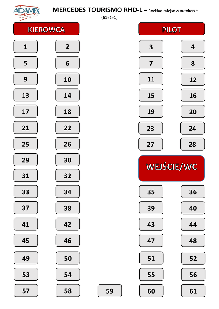 MERCEDES TOURISMO RHD-L – Rozkład miejsc w autokarze (61+1+1) 1 2 3 4 5 6 7 8 9 10 11 12 13 14 15 16 17 18 19 20 21 22 23 24 25 26 27 28 29 30 31 32 33 34 35 36 37 38 39 40 41 42 43 44 45 46 47 48 49 50 51 52 53 54 55 56 57 58 60 61 59