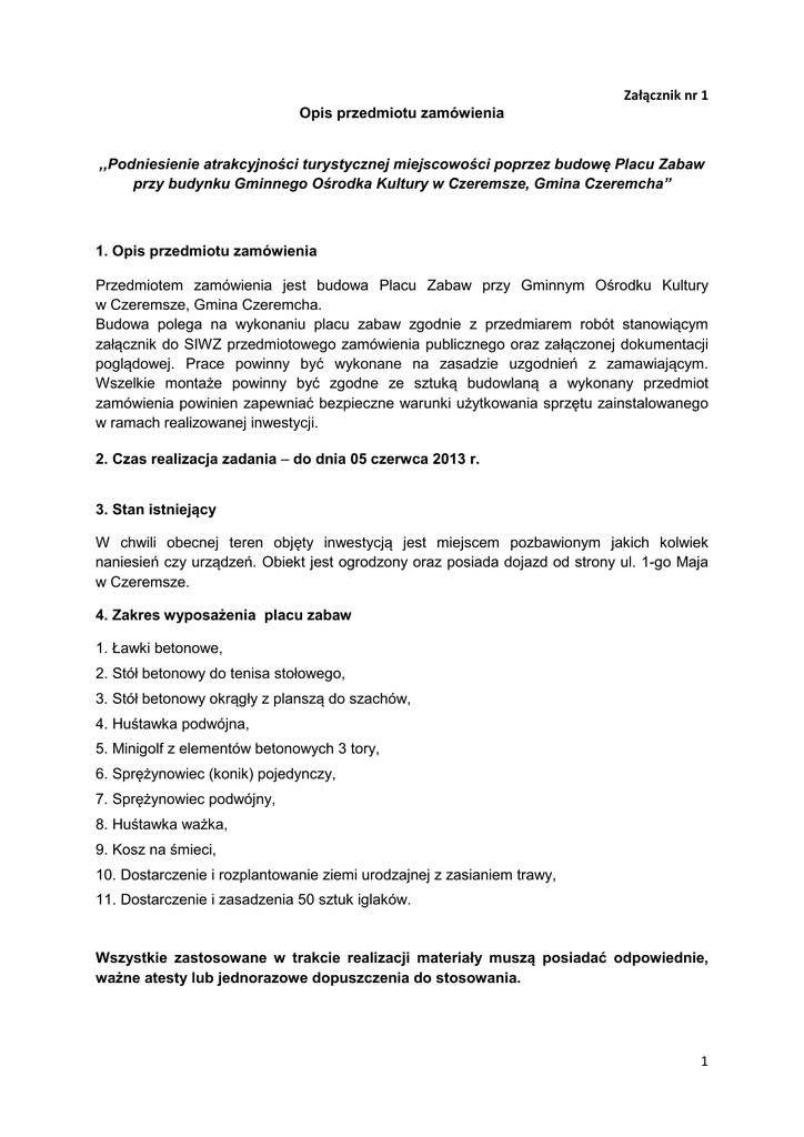 Załącznik nr 1 Opis przedmiotu zamówienia ,,Podniesienie atrakcyjności turystycznej miejscowości poprzez budowę Placu Zabaw przy budynku Gminnego Ośrodka Kultury w Czeremsze, Gmina Czeremcha” 1. Opis przedmiotu zamówienia Przedmiotem zamówienia jest budowa Placu Zabaw przy Gminnym Ośrodku Kultury w Czeremsze, Gmina Czeremcha. Budowa polega na wykonaniu placu zabaw zgodnie z przedmiarem robót stanowiącym załącznik do SIWZ przedmiotowego zamówienia publicznego oraz załączonej dokumentacji poglądowej. Prace powinny być wykonane na zasadzie uzgodnień z zamawiającym. Wszelkie montaże powinny być zgodne ze sztuką budowlaną a wykonany przedmiot zamówienia powinien zapewniać bezpieczne warunki użytkowania sprzętu zainstalowanego w ramach realizowanej inwestycji. 2. Czas realizacja zadania – do dnia 05 czerwca 2013 r. 3. Stan istniejący W chwili obecnej teren objęty inwestycją jest miejscem pozbawionym jakich kolwiek naniesień czy urządzeń. Obiekt jest ogrodzony oraz posiada dojazd od strony ul. 1-go Maja w Czeremsze. 4. Zakres wyposażenia placu zabaw 1. Ławki betonowe, 2. Stół betonowy do tenisa stołowego, 3. Stół betonowy okrągły z planszą do szachów, 4. Huśtawka podwójna, 5. Minigolf z elementów betonowych 3 tory, 6. Sprężynowiec (konik) pojedynczy, 7. Sprężynowiec podwójny, 8. Huśtawka ważka, 9. Kosz na śmieci, 10. Dostarczenie i rozplantowanie ziemi urodzajnej z zasianiem trawy, 11. Dostarczenie i zasadzenia 50 sztuk iglaków. Wszystkie zastosowane w trakcie realizacji materiały muszą posiadać odpowiednie, ważne atesty lub jednorazowe dopuszczenia do stosowania. 1 Załącznik graficzny 2