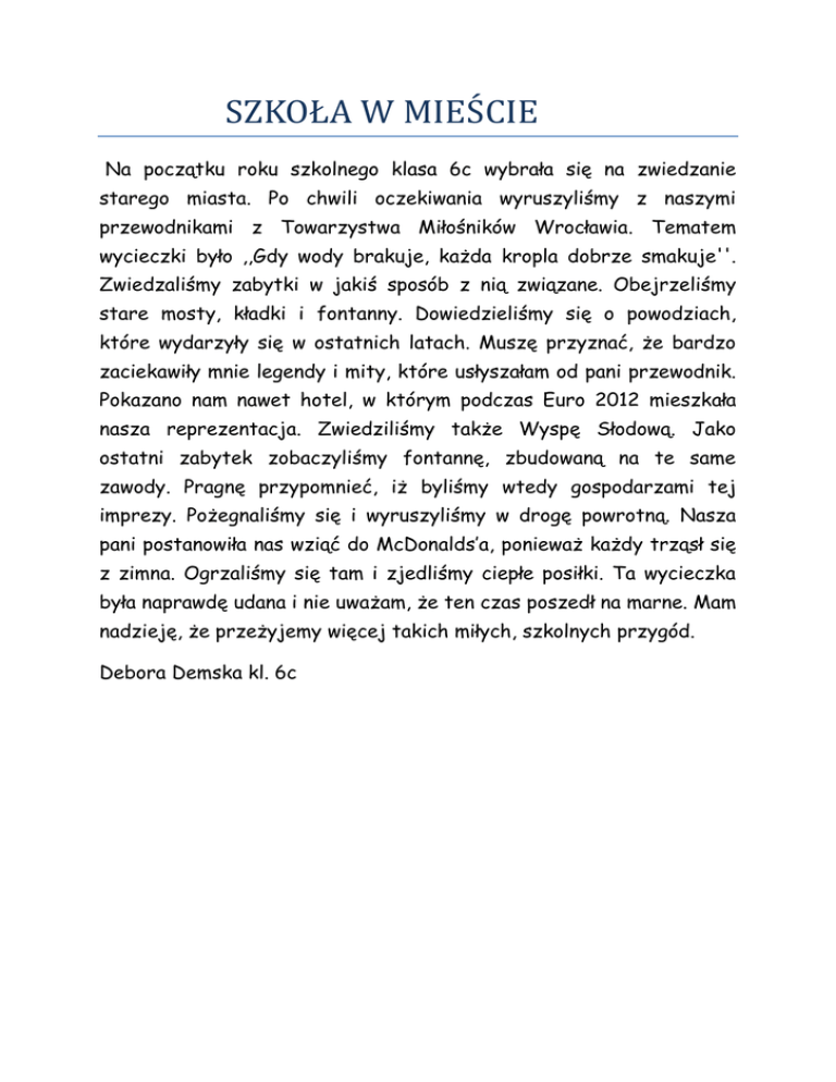 SZKOŁA W MIEŚCIE Na początku roku szkolnego klasa 6c wybrała się na zwiedzanie starego miasta. Po chwili oczekiwania wyruszyliśmy z naszymi przewodnikami z Towarzystwa Miłośników Wrocławia. Tematem wycieczki było ,,Gdy wody brakuje, każda kropla dobrze smakuje''. Zwiedzaliśmy zabytki w jakiś sposób z nią związane. Obejrzeliśmy stare mosty, kładki i fontanny. Dowiedzieliśmy się o powodziach, które wydarzyły się w ostatnich latach. Muszę przyznać, że bardzo zaciekawiły mnie legendy i mity, które usłyszałam od pani przewodnik. Pokazano nam nawet hotel, w którym podczas Euro 2012 mieszkała nasza reprezentacja. Zwiedziliśmy także Wyspę Słodową. Jako ostatni zabytek zobaczyliśmy fontannę, zbudowaną na te same zawody. Pragnę przypomnieć, iż byliśmy wtedy gospodarzami tej imprezy. Pożegnaliśmy się i wyruszyliśmy w drogę powrotną. Nasza pani postanowiła nas wziąć do McDonalds’a, ponieważ każdy trząsł się z zimna. Ogrzaliśmy się tam i zjedliśmy ciepłe posiłki. Ta wycieczka była naprawdę udana i nie uważam, że ten czas poszedł na marne. Mam nadzieję, że przeżyjemy więcej takich miłych, szkolnych przygód. Debora Demska kl. 6c