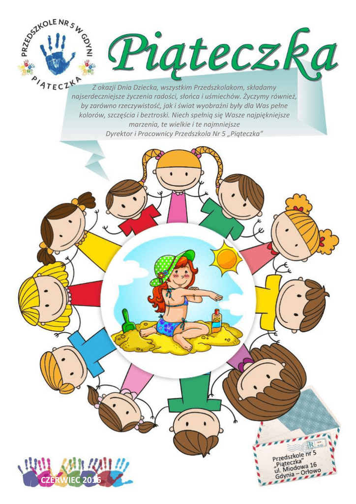 Z okazji Dnia Dziecka, wszystkim Przedszkolakom, składamy najserdeczniejsze życzenia radości, słońca i uśmiechów. Życzymy również, by zarówno rzeczywistość, jak i świat wyobraźni były dla Was pełne kolorów, szczęścia i beztroski. Niech spełnią się Wasze najpiękniejsze marzenia, te wielkie i te najmniejsze Dyrektor i Pracownicy Przedszkola Nr 5 „Piąteczka” CZERWIEC 2016 WAKACJE!!! Z okazji zbliżających się wakacji życzymy wszystkim przedszkolakom i ich Rodzicom wesołych, słonecznych i bezpiecznych wakacji, miłego wypoczynku i uśmiechów na co dzień. Niech te wakacje będą spokojne, ale za razem pełne wakacyjnych wrażeń, do których będziecie powracać latami. HARMONOGRAM OBCHODÓW DNIA DZIECKA 01.06 (środa) Teatrzyk kukiełkowy z cyklu Nauczyciele-Dzieciom pt. „Jaś i Małgosia” 02.06 (czwartek) Spartakiada sportowa dla grupy Marynarzy i Foczek Spartakiada matematyczna dla grupy Rybek i Muszelek 03.06 (piątek) Warsztaty kulinarne z rodzicami 08.06 (środa) o godz. 09:00 Zabawy w ogrodzie z teatrem Qufer „Na tęczowo” 13.06 (poniedziałek) o godz. 08:50 Koncert grupy Bajnutek pt. „Bajki i bajeczki na pięciolinii. Muzyka filmowa” 14.06 (wtorek) o godz. 09:00 Zajęcia edukacyjne prowadzone przez EduFun pt. „Odkrywamy Kosmos” 15.06 (środa) o godz. 09:30 Bajka z cyklu Rodzice-Dzieciom pt. „Calineczka” 17.06 (piątek) o godz. 15:00 Festyn rodzinny pt. „Na wesoło” prowadzony przez Clowna Olafa „WAKACYJNE RADY” Głowa nie jest od parady służyć musi dalej. Dbaj więc o nią i osłaniaj, kiedy słońce pali. Płynie w rzece woda chłodna, bystra, czysta, tylko przy dorosłych z kąpieli korzystaj. Jagody nieznane, gdy zobaczysz w borze: Nie zrywaj! Nie zjadaj! – bo zatruć się możesz. Urządzamy grzybobranie, jaka rada stąd wynika: Gdy jakiegoś grzyba nie znasz, nie wkładaj go do koszyka. Biegać boso jest przyjemnie, ale ważna rada: - idąc na wycieczkę pieszą dobre buty wkładaj! Gdy w polu, w lesie, czy za domem wykopiesz przedmiot zardzewiały - nie dotykaj go! Daj znać dorosłym! Niebezpieczeństwo niosą groźne przedmioty! Pokoloruj obrazek.