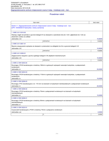 "DOM-BUD" w Suwałkach 16-400 Suwałki ul. Korczaka 2 tel. (87) 566-37-67 Identyfikator: ZS Data utworzenia: 2013-03-26 Zagospodarowanie centrum miejscowości Liszno II etap - Instalacje wod. - kan. Przedmiar robót Opis robót Ilość robót Dział nr 1. Zagospodarowanie centrum miejscowości Liszno II etap - Instalacje wod. - kan. [CPV: 45330000-9 Hydraulika i roboty sanitarne] 1. KNR 2-01 0310-02 Wykopy ciągłe lub jamiste w gruncie kategorii III ze skarpami o szerokości dna do 1,5m i głębokości do 1,5m ze złożeniem urobku na odkład Jednostka: m3 10,8000 30*0.6*0.6 10,8000 2. KNR 2-01 0501-01 Ręczne zasypywanie wykopów ze skarpami z przerzutem na odległość do 3m w gruncie kategorii I-III Jednostka: m3 10,8000 30*0.6*0.6 10,8000 3. KNR 2-01 0236-01 Zagęszczenie nasypów z gruntu sypkiego kategorii I-III ubijakami mechanicznymi Jednostka: m3 10,8000 30*0.6*0.6 10,8000 4. KNR 2-15W 0203-04 Rurociągi z PCW kanalizacyjne o średnicy 160mm w gotowych wykopach wewnątrz budynków, o połączeniach wciskowych Jednostka: m 25,0000 5. KNR 2-15W 0203-03 Rurociągi z PCW kanalizacyjne o średnicy 110mm w gotowych wykopach wewnątrz budynków, o połączeniach wciskowych Jednostka: m 10,0000 6. KNR 2-15W 0208-03 Rurociągi z PVC kanalizacyjne o śr. 110 mm na ścianach w budynkach niemieszkalnych o połączeniach wciskowych Jednostka: m 25,0000 7. KNR 2-15W 0208-02 Rurociągi z PCW kanalizacyjne o średnicy 75mm o połączeniach wciskowych na ścianach w budynkach niemieszkalnych Jednostka: m 15,0000 8. KNR 2-15W 0208-01 Rurociągi z PCW kanalizacyjne o średnicy 50mm o połączeniach wciskowych na ścianach w budynkach niemieszkalnych Jednostka: m 15,0000 9. KNR 2-15W 0222-01 Czyszczaki kanalizacyjne z PCW o średnicy 75mm o połączeniu wciskowym Jednostka: szt 2,0000 2 2,0000 -1- Opis robót Ilość robót 10. KNR 2-15W 0222-02 Czyszczaki kanalizacyjne z PCW o średnicy 110mm o połączeniu wciskowym Jednostka: szt 3,0000 11. KNR 2-20 0202-01 Rurociągi w kanałach z rur stalowych o średnicy nominalnej 200mm i grubości ścianki 7mmTULEJE OCHRONNE Jednostka: m 3,0000 12. KNR 2-15W 0213-04 Rury wywiewne z PCW o połączeniu wciskowym, o średnicy 75mm Jednostka: szt 1,0000 13. KNR 2-15W 0213-05 Rury wywiewne z PCW o połączeniu wciskowym, o średnicy 110 Jednostka: szt 3,0000 14. KNR 2-15u1 000200-02 Zawory napowietrzające pływakowe o średnicy nominalnej 80mm Jednostka: szt 1,0000 15. KNR 2-15W 0216-02 Wpusty żeliwne piwniczne o średnicy 100mm z zamknięciem przed nieprzyjemnymi zapachami Jednostka: szt 4,0000 16. KNR 2-15W 0218-01 Wpust ściekowy z tworzywa sztucznego o średnicy 50mmz zamknięciem przed nieprzyjemnymi zapachami Jednostka: szt 2,0000 17. KNR 2-15W 0233-03 Ustępy z płuczką ustępową typu "kompakt" DLA NIEPEŁNOSPRAWNYCH GAT. I FIRMY KOŁO LUB RÓWNWAŻNEJ+KOMPLET PORĘCZY NA STELAŻU GEBERIT Jednostka: kpl. 2,0000 18. KNR 2-15W 0233-03 Ustępy z płuczką ustępową typu "kompakt" P.Z. NA STELAŻU GEBERIT Jednostka: kpl 3,0000 19. KNR 2-15W 0230-02 Umywalki pojedyncze porcelanowe z syfonem gruszkowym GAT. I FIRMY KOŁO LUB RÓWNWAŻNEJ Jednostka: kpl. 7,0000 20. KNR 2-15W 0230-02 Umywalki pojedyncze porcelanowe z syfonem gruszkowym DLA NIEPEŁNOSPRAWNYCH +KOMPLET PORĘCZY Jednostka: kpl. 2,0000 21. KNR 2-15W 0229-01 Zlew żeliwny w pom. KOTŁOWNI Jednostka: szt 1,0000 22. KNR 2-15W 0230-05 Postument porcelanowy do umywalek Jednostka: kpl. 9,0000 23. KNR 2-15W 0211-03 Dodatki za wykonanie podejść odpływowych z PVC o śr. 110 mm o połączeniach wciskowych Jednostka: podej. 10,0000 -2- Opis robót Ilość robót 24. KNR 2-15W 0211-01 Dodatki za wykonanie podejść odpływowych z PVC o śr. 50 mm o połączeniach wciskowych Jednostka: podej. 12,0000 12 12,0000 25. KNR 2-15W 0112-01 Rurociągi z tworzyw sztucznych (PP, PE, PB) o śr. zewnętrznej 20 mm o połączeniach zgrzewanych, na ścianach w budynkach niemieszkalnych PEX-c SYSTEMU KAN-therm 18x2,5 W OTULINIE TERMOIZOLACYJNEJ Jednostka: m 70,0000 26. KNR 2-15W 0112-02 Rurociągi z tworzyw sztucznych (PP, PE, PB) o śr. zewnętrznej 25 mm o połączeniach zgrzewanych, na ścianach w budynkach niemieszkalnych PEX-c SYSTEMU KAN-therm 25x3,5 W OTULINIE TERMOIZOLACYJNEJ Jednostka: m 20,0000 27. KNR 2-15W 0112-03 Rurociągi z tworzyw sztucznych (PP, PE, PB) o śr. zewnętrznej 32 mm o połączeniach zgrzewanych, na ścianach w budynkach niemieszkalnych PEX-c SYSTEMU KAN-therm 32x4,4 W OTULINIE TERMOIZOLACYJNEJ Jednostka: m 10,0000 28. KNR 2-15W 0106-03 Rurociągi stalowe ocynkowane o śr.nominalnej 25 mm o połączeniach gwintowanych, na ścianach w budynkach niemieszkalnych Jednostka: m 5,0000 29. KNR 2-15W 0106-04 Rurociągi stalowe ocynkowane o śr.nominalnej 32 mm o połączeniach gwintowanych, na ścianach w budynkach niemieszkalnych Jednostka: m 30,0000 30. KNR 2-15W 0106-07 Rurociągi stalowe ocynkowane o średnicy nominalnej 65mm o połączeniach gwintowanych, na ścianach w budynkach niemieszkalnych Jednostka: m 20,0000 31. KNR 2-15W 0127-03 Próba szczelności instalacji wodociągowych z rur z tworzyw sztucznych w budynkach niemieszkalnych (rurociąg o śr. do 63 mm) Jednostka: m 100,0000 70+20+10 100,0000 32. KNR 2-15W 0126-04 Próba szczelności instalacji wodociągowych z rur żeliwnych i stalowych w budynkach niemieszkalnych, rurociąg o średnicy do 65mm Jednostka: m 55,0000 20+30+5 55,0000 33. KNR 2-15W 0128-02 Płukanie instalacji wodociągowej w budynkach niemieszkalnych Jednostka: m 155,0000 100+55 155,0000 34. KNR 2-15W 0132-01 Zawory przelotowe i zwrotne, instalacji wodociągowych z rur z tworzyw sztucznych o średnicy nominalnej 15mmdo płuczek ustępowych Jednostka: szt 5,0000 -3- Opis robót Ilość robót 35. KNR 2-15W 0132-01 Zawory przelotowe i zwrotne instalacji wodociągowych z rur z tworzyw sztucznych o śr. nominalnej 15 mm Jednostka: szt. 20,0000 36. KNR 2-15W 0130-03 Zawory przelotowe i zwrotne instalacji wodociągowych z rur stalowych o śr. nominalnej 25 mm Jednostka: szt