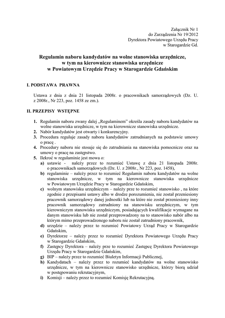Załącznik Nr 1 do Zarządzenia Nr 19/2012 Dyrektora Powiatowego Urzędu Pracy w Starogardzie Gd. Regulamin naboru kandydatów na wolne stanowiska urzędnicze, w tym na kierownicze stanowiska urzędnicze w Powiatowym Urzędzie Pracy w Starogardzie Gdańskim I. PODSTAWA PRAWNA Ustawa z dnia z dnia 21 listopada 2008r. o pracownikach samorządowych (Dz. U. z 2008r., Nr 223, poz. 1458 ze zm.). II. PRZEPISY WSTĘPNE 1. Regulamin naboru zwany dalej „Regulaminem” określa zasady naboru kandydatów na wolne stanowiska urzędnicze, w tym na kierownicze stanowiska urzędnicze. 2. Nabór kandydatów jest otwarty i konkurencyjny. 3. Procedura reguluje zasady naboru kandydatów zatrudnianych na podstawie umowy o pracę . 4. Procedury naboru nie stosuje się do zatrudniania na stanowiska pomocnicze oraz na umowy o pracę na zastępstwo. 5. Ilekroć w regulaminie jest mowa o: a) ustawie - należy przez to rozumieć Ustawę z dnia 21 listopada 2008r. o pracownikach samorządowych (Dz. U. z 2008r., Nr 223, poz. 1458), b) regulaminie – należy przez to rozumieć Regulamin naboru kandydatów na wolne stanowiska urzędnicze, w tym na kierownicze stanowiska urzędnicze w Powiatowym Urzędzie Pracy w Starogardzie Gdańskim, c) wolnym stanowisku urzędniczym – należy prze to rozumieć stanowisko , na które zgodnie z przepisami ustawy albo w drodze porozumienia, nie został przeniesiony pracownik samorządowy danej jednostki lub na które nie został przeniesiony inny pracownik samorządowy zatrudniony na stanowisku urzędniczym, w tym kierowniczym stanowisku urzędniczym, posiadających kwalifikacje wymagane na danym stanowisku lub nie został przeprowadzony na to stanowisko nabór albo na którym mimo przeprowadzonego naboru nie został zatrudniony pracownik, d) urzędzie – należy przez to rozumieć Powiatowy Urząd Pracy w Starogardzie Gdańskim, e) Dyrektorze – należy przez to rozumieć Dyrektora Powiatowego Urzędu Pracy w Starogardzie Gdańskim, f) Zastępcy Dyrektora – należy prze to rozumieć Zastępcę Dyrektora Powiatowego Urzędu Pracy w Starogardzie Gdańskim, g) BIP – należy przez to rozumieć Biuletyn Informacji Publicznej, h) Kandydatach – należy przez to rozumieć kandydatów na wolne stanowisko urzędnicze, w tym na kierownicze stanowisko urzędnicze, którzy biorą udział w postępowaniu rekrutacyjnym, i) Komisji – należy przez to rozumieć Komisję Rekrutacyjną. III. WSZCZĘCIE PROCEDURY 1. Decyzję o rozpoczęciu naboru na wolne stanowisko urzędnicze podejmuje Dyrektor samodzielnie lub na podstawie informacji otrzymanej od Kierownika Działu. 2. Informacja o której mowa w punkcie 1 następuje w formie pisemnej i zawiera opis danego stanowiska, w tym: a) nazwę stanowiska, b) miejsce w strukturze organizacyjnej, c) opis zadań dla tego stanowiska, d) określenie wymiaru czasu pracy, e) określenie wymagań w zakresie kwalifikacji i umiejętności związanych ze stanowiskiem, 3. Zgoda Dyrektora na ogłoszenie wolnego stanowiska urzędniczego powoduje rozpoczęcie procedury naboru. IV. POWOŁANIE KOMISJI REKRUTACYJNEJ. 1. Postępowanie rekrutacyjne przygotowuje i prowadzi w etapie I Komisja Rekrutacyjna. 2. Komisję powołuje Dyrektor zarządzeniem. 3. Komisja składa się z minimum 3 członków. 4. Dla skuteczności podejmowanych czynności przez komisję wymagana jest obecność co najmniej dwóch członków Komisji. 5. W skład komisji rekrutacyjnej nie może być powołana osoba, która jest małżonkiem lub krewnym albo powinowatym do drugiego stopnia włącznie, osoby której dotyczy postępowanie konkursowe, albo pozostaje wobec niej w takim stosunku prawnym lub faktycznym, że może budzić uzasadnienie wątpliwości co do jej bezstronności. 6. Jeżeli okoliczności, o których mowa w punkcie 5 zostaną ujawnienie w trakcie postępowania rekrutacyjnego, Dyrektor dokonuje odpowiedniej zmiany w składzie Komisji. 7. Obsługę administracyjną Komisji zapewnia stanowisko ds. obsługi kadr w zakresie: a) przygotowania i prowadzenia dokumentacji postępowania rekrutacyjnego, w tym ogłoszenia o naborze, b) przyjmowania dokumentów aplikacyjnych (ofert do naboru), c) sporządzania protokołów, d) przekazania administratorowi sieci informatycznej urzędu do umieszczenia w BIP informacji o naborze, e) upowszechniania informacji na tablicy ogłoszeń. V. ETAPY NABORU I. Ogłoszenie o naborze. 1. Stanowisko ds. obsługi kadr przygotowuje ogłoszenie o naborze kandydatów na wolne stanowisko. 2. Ogłoszenie o naborze kandydatów na to stanowisko umieszcza się w BIP oraz na tablicy informacyjnej w Urzędzie. 3. Ogłoszenie powinno zawierać: a) nazwę i adres jednostki, b) określenie stanowiska, c) określenie wymagań związanych ze stanowiskiem urzędniczym zgodnie z opisem danego stanowiska, ze wskazaniem, które z nich są niezbędne, a które dodatkowe, d) wskazanie zakresu zadań wykonywanych na stanowisku, e) informację o warunkach pracy na danym stanowisku, f) informację, czy w miesiącu poprzedzającym datę upublicznienia ogłoszenia wskaźnik zatrudnienia osób niepełnosprawnych w jednostce, w rozumieniu przepisów o rehabilitacji zawodowej i społecznej oraz zatrudnianiu osób niepełnosprawnych, wynosi co najmniej 6 %, g) wskazanie wymaganych dokumentów, które ma złożyć kandydat, h) określenie miejsca i terminu składania dokumentów, który nie może być krótszy niż 10 dni od dnia opublikowania tego ogłoszenia w BIP. 4. Stanowisko ds. obsługi kadr przekazuje zgłoszenie wolnego miejsca zatrudnienia do Działu Usług Rynku Pracy tut. Urzędu. II. Przyjmowanie dokumentów. 1. Po ogłoszeniu naboru następuje przyjmowanie dokumentów od kandydatów zainteresowanych podjęciem zatrudnienia na wolnym stanowisku urzędniczym lub wolnym kierowniczym stanowisku urzędniczym. 2. Dokumenty aplikacyjne składane przez kandydatów mogą być przyjmowane wyłącznie po ukazaniu się ogłoszenia o naborze. 3. Nie przyjmuje się dokumentów przed uk