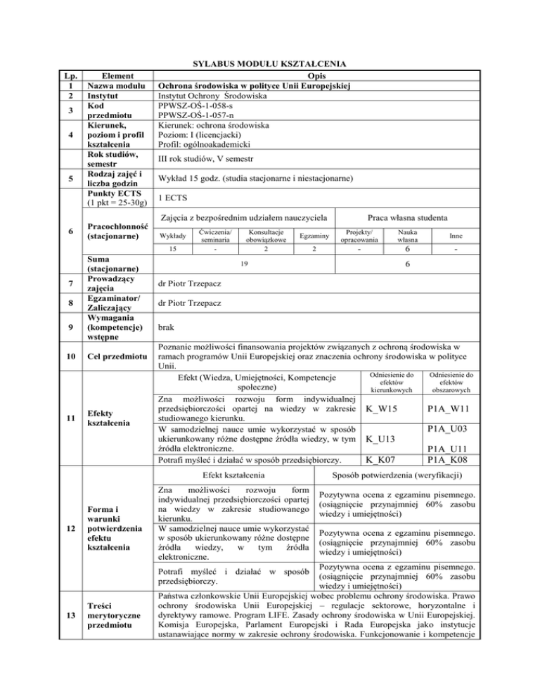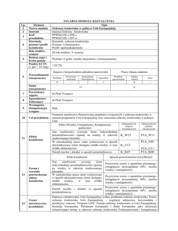 Lp. 1 2 3 4 5 6 Element Nazwa modułu Instytut Kod przedmiotu Kierunek, poziom i profil kształcenia Rok studiów, semestr Rodzaj zajęć i liczba godzin Punkty ECTS (1 pkt = 25-30g) Pracochłonność (stacjonarne) SYLABUS MODUŁU KSZTAŁCENIA Opis Ochrona środowiska w polityce Unii Europejskiej Instytut Ochrony Środowiska PPWSZ-OŚ-1-058-s PPWSZ-OŚ-1-057-n Kierunek: ochrona środowiska Poziom: I (licencjacki) Profil: ogólnoakademicki III rok studiów, V semestr Wykład 15 godz. (studia stacjonarne i niestacjonarne) 1 ECTS Zajęcia z bezpośrednim udziałem nauczyciela Wykłady 15 7 8 9 Suma (stacjonarne) Prowadzący zajęcia Egzaminator/ Zaliczający Wymagania (kompetencje) wstępne 10 Cel przedmiotu 11 Efekty kształcenia Ćwiczenia/ seminaria - Konsultacje obowiązkowe 2 Egzaminy Projekty/ opracowania Nauka własna Inne 2 - 6 - 19 12 dr Piotr Trzepacz brak Poznanie możliwości finansowania projektów związanych z ochroną środowiska w ramach programów Unii Europejskiej oraz znaczenia ochrony środowiska w polityce Unii. Odniesienie do Odniesienie do Efekt (Wiedza, Umiejętności, Kompetencje efektów efektów społeczne) kierunkowych obszarowych Zna możliwości rozwoju form indywidualnej przedsiębiorczości opartej na wiedzy w zakresie K_W15 P1A_W11 studiowanego kierunku. P1A_U03 W samodzielnej nauce umie wykorzystać w sposób ukierunkowany różne dostępne źródła wiedzy, w tym K_U13 źródła elektroniczne. P1A_U11 Potrafi myśleć i działać w sposób przedsiębiorczy. K_K07 P1A_K08 Zna możliwości rozwoju form indywidualnej przedsiębiorczości opartej na wiedzy w zakresie studiowanego kierunku. W samodzielnej nauce umie wykorzystać w sposób ukierunkowany różne dostępne źródła wiedzy, w tym źródła elektroniczne. Treści merytoryczne przedmiotu Sposób potwierdzenia (weryfikacji) Pozytywna ocena z egzaminu pisemnego. (osiągnięcie przynajmniej 60% zasobu wiedzy i umiejętności) Pozytywna ocena z egzaminu pisemnego. (osiągnięcie przynajmniej 60% zasobu wiedzy i umiejętności) Pozytywna ocena z egzaminu pisemnego. (osiągnięcie przynajmniej 60% zasobu wiedzy i umiejętności) Państwa członkowskie Unii Europejskiej wobec problemu ochrony środowiska. Prawo ochrony środowiska Unii Europejskiej – regulacje sektorowe, horyzontalne i dyrektywy ramowe. Program LIFE. Zasady ochrony środowiska w Unii Europejskiej. Komisja Europejska, Parlament Europejski i Rada Europejska jako instytucje ustanawiające normy w zakresie ochrony środowiska. Funkcjonowanie i kompetencje Potrafi myśleć i działać w sposób przedsiębiorczy. 13 6 dr Piotr Trzepacz Efekt kształcenia Forma i warunki potwierdzenia efektu kształcenia Praca własna studenta Europejskiej Agencji ds. Środowiska. Instytucje Unii Europejskiej odpowiedzialne za kształtowanie polityki w zakresie ochrony środowiska. Polityka energetyczna UE i środowisko. Wspólna polityka rolna UE i środowisko. Polityka spójności UE i środowisko. Polityka konkurencji UE i środowisko. Programy UE finansujące inwestycje w zakresie ochrony środowiska. Inwestycje w zakresie ochrony środowiska finansowane przez Unię Europejską. Beneficjenci środków unijnych przeznaczanych na ochronę środowiska. 14 15 Wykaz literatury podstawowej Wykaz literatury uzupełniającej (pomocniczej) Dyrektywy Unii Europejskiej w zakresie ochrony środowiska – np. Dyrektywa Ptasia Dokumenty konkursowe programów UE w zakresie ochrony środowiska Dokumenty programowe dla źródeł finansowania projektów odnoszących się do ochrony środowiska – np. Program Operacyjny Infrastruktura i Środowisko