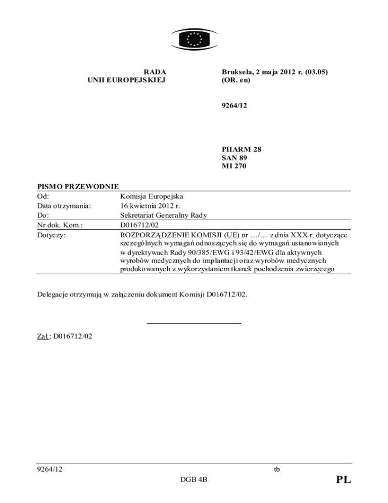 RADA UNII EUROPEJSKIEJ Bruksela, 2 maja 2012 r. (03.05) (OR. en) 9264/12 PHARM 28 SAN 89 MI 270 PISMO PRZEWODNIE Od: Komisja Europejska Data otrzymania: 16 kwietnia 2012 r. Do: Sekretariat Generalny Rady Nr dok. Kom.: D016712/02 Dotyczy: ROZPORZĄDZENIE KOMISJI (UE) nr …/… z dnia XXX r. dotyczące szczególnych wymagań odnoszących się do wymagań ustanowionych w dyrektywach Rady 90/385/EWG i 93/42/EWG dla aktywnych wyrobów medycznych do implantacji oraz wyrobów medycznych produkowanych z wykorzystaniem tkanek pochodzenia zwierzęcego Delegacje otrzymują w załączeniu dokument Komisji D016712/02. Zał.: D016712/02 9264/12 tb DGB 4B PL ROZPORZĄDZENIE KOMISJI (UE) nr …/… z dnia XXX r. dotyczące szczególnych wymagań odnos zących się do wymagań ustanowionych w dyrektywach Rady 90/385/EWG i 93/42/EWG dla aktywnych wyrobów me dycznych do implantacji oraz wyrobów medycznych produkowanych z wykorzystaniem tkanek pochodzenia zwie rzęcego (Tekst mający znaczenie dla EOG) KOMISJA EUROPEJSKA, uwzględniając Traktat o funkcjonowaniu Unii Europejskiej, uwzględniając dyrektywę Rady 90/385/EWG z dnia 20 czerwca 1990 r. w sprawie zbliżenia ustawodawstw państw członkowskich odnoszących się do wyrobów medycznych aktywnego osadzania 1 , w szczególności jej art. 10c, uwzględniając dyrektywę Rady 93/42/EWG z dnia 14 czerwca 1993 r. dotyczącą wyrobów medycznych 2 , w szczególności jej art. 14b, a także mając na uwadze, co następuje: (1) Szczególne przepisy dotyczące wyrobów medycznych produkowanych z wykorzystaniem tkanek pochodzenia zwierzęcego zostały początkowo przyjęte dyrektywą Komisji 2003/32/WE z dnia 23 kwietnia 2003 r. wprowadzającą szczegółowe specyfikacje w zakresie wymagań ustanowionych w dyrektywie Rady 93/42/EWG, odnoszących się do wyrobów medycznych produkowanych z tkanek pochodzenia zwierzęcego 3 . Wspomniana dyrektywa miała zastosowanie jedynie do wyrobów medycznych objętych zakresem dyrektywy 93/42/EWG. (2) W celu utrzymania wysokiego poziomu bezpieczeństwa i ochrony zdrowia przed ryzykiem przenoszenia zwierzęcych encefalopatii gąbczastych na pacjentów lub inne osoby za pośrednictwem wyrobów medycznych produkowanych z wykorzystaniem tkanek zwierzęcych niezdolnych do życia lub pochodnych pozbawionych zdolności do życia, w tym wyrobów wykonanych na zamówienie oraz wyrobów przeznaczonych do badań klinicznych, należy zaktualizować przepisy ustanowione w dyrektywie 2003/32/WE, na podstawie doświadczeń zdobytych podczas stosowania tej dyrektywy, oraz stosować te przepisy także do objętych zakresem dyrektywy 1 Dz.U. L 189 z 20.7.1990, s. 17. Dz.U. L 169 z 12.7.1993, s. 1. Dz.U. L 105 z 24.4.2003, s. 18. 2 3 PL 1 PL 90/385/EWG aktywnych wyrobów medycznych do implantacji produkowanych z wykorzystaniem tkanek pochodzenia zwierzęcego. (3) Przy uwzględnieniu, że niniejszy środek ustanawia jasne i szczegółowe przepisy, które nie dają państwom członkowskim możliwości ich rozbieżnej transpozycji, rozporządzenie jest odpowiednim instrumentem prawnym, który zastępuje dyrektywę 2003/32/WE. (4) Przed wprowadzeniem do obrotu lub do używania aktywne wyroby medyczne do implantacji oraz wyroby medyczne zaklasyfikowane do klasy III zgodnie z regułami klasyfikacji przedstawionymi w załączniku IX do dyrektywy 93/42/EWG, bez względu na to, czy pochodzą z Unii Europejskiej, czy są przywożone z państw trzecich, podlegają procedurom oceny zgodności ustanowionym w, odpowiednio, art. 9 ust. 1 dyrektywy 90/385/EWG oraz art. 11 ust. 1 dyrektywy 93/42/EWG. Załącznik 1 do dyrektywy 90/385/EWG oraz załącznik I do dyrektywy 93/42/EWG określają zasadnicze wymagania, jakie muszą spełniać w tym względzie, odpowiednio, aktywne wyroby medyczne do implantacji oraz inne wyroby medyczne. (5) W odniesieniu do aktywnych wyrobów medycznych do implantacji oraz innych wyrobów medycznych produkowanych z wykorzystaniem tkanek pochodzenia zwierzęcego konieczne jest przyjęcie bardziej szczegółowych specyfikacji w stosunku do wymagań zawartych w pkt 6 załącznika 1 do dyrektywy 90/385/EWG oraz pkt 8.1 i 8.2 załącznika I do dyrektywy 93/42/EWG. Ponadto właściwym jest określenie niektórych aspektów związanych z analizą ryzyka i zarządzaniem ryzykiem w ramach procedur oceny zgodności określonych w, odpowiednio, art. 9 dyrektywy 90/385/EWG i art. 11 dyrektywy 93/42/EWG. (6) Rozporządzenie Parlamentu Europejskiego i Rady (WE) nr 1069/2009 z dnia 21 października 2009 r. określające przepisy sanitarne dotyczące produktów ubocznych pochodzenia zwierzęcego, nieprzeznaczonych do spożycia przez ludzi 4 ustanawia przepisy dotyczące pozyskiwania materiałów używanych w wyrobach medycznych. Właściwym jest ustanowienie dodatkowych przepisów dotyczących wykorzystywania tego rodzaju materiałów jako tkanki wyjściowej do produkcji wyrobów medycznych. (7) Europejskie i międzynarodowe instytucje naukowe, takie jak Europejska Agencja Leków 5 , Europejski Urząd ds. Bezpieczeństwa Żywności 6 , dawny Naukowy Komitet Sterujący 7 oraz dawny Komitet Naukowy ds. Produktów Leczniczych i Wyrobów Medycznych8 , przyjęły szereg opinii w sprawie określonych materiałów niebezpiecznych oraz w sprawie zmniejszania ryzyka przenoszenia czynników zwierzęcej encefalopatii gąbczastej, które to opinie są istotne z punktu widzenia bezpieczeństwa wyrobów medycznych. 4 Dz.U. L 300 z 14.11.2009, s. 1. Wytyczne dotyczące zmn iejszan ia ryzy ka przenoszenia czynników encefalopatii gąbczastej zwierząt przez produkty leczn icze stosowane u ludzi oraz weterynaryjne produkty lecznicze (EMA/410/01 rev. 3), Dz.U. C 73 z 5.3.2011, s. 1. http://www.efsa.europa.eu/en/topics/topic/bse.htm. http://ec.europa.eu/food/fs/bse/scientific_advice08_en.print.ht ml. Zob. http://ec.europa.eu/health/scientific_committees/emerging/opinions/scmpmd/ index_en.ht m. 5 6 7 8 PL 2 PL (8) Państwa członkowskie powinny kontrolować, czy 