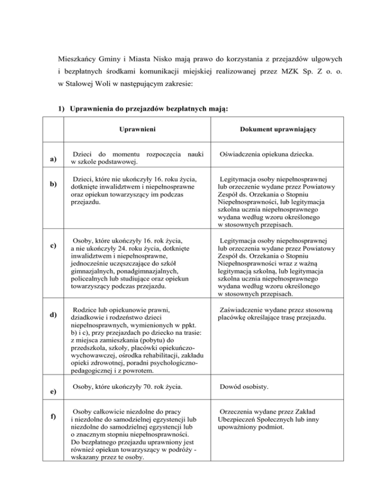 Mieszkańcy Gminy i Miasta Nisko mają prawo do korzystania z przejazdów ulgowych i bezpłatnych środkami komunikacji miejskiej realizowanej przez MZK Sp. Z o. o. w Stalowej Woli w następującym zakresie: 1) Uprawnienia do przejazdów bezpłatnych mają: Uprawnieni a) b) c) d) e) f) Dokument uprawniający Dzieci do momentu rozpoczęcia nauki w szkole podstawowej. Oświadczenia opiekuna dziecka. Dzieci, które nie ukończyły 16. roku życia, dotknięte inwalidztwem i niepełnosprawne oraz opiekun towarzyszący im podczas przejazdu. Legitymacja osoby niepełnosprawnej lub orzeczenie wydane przez Powiatowy Zespół ds. Orzekania o Stopniu Niepełnosprawności, lub legitymacja szkolna ucznia niepełnosprawnego wydana według wzoru określonego w stosownych przepisach. Osoby, które ukończyły 16. rok życia, a nie ukończyły 24. roku życia, dotknięte inwalidztwem i niepełnosprawne, jednocześnie uczęszczające do szkół gimnazjalnych, ponadgimnazjalnych, policealnych lub studiujące oraz opiekun towarzyszący podczas przejazdu. Legitymacja osoby niepełnosprawnej lub orzeczenia wydane przez Powiatowy Zespół ds. Orzekania o Stopniu Niepełnosprawności wraz z ważną legitymacją szkolną, lub legitymacja szkolna ucznia niepełnosprawnego wydana według wzoru określonego w stosownych przepisach. Rodzice lub opiekunowie prawni, dziadkowie i rodzeństwo dzieci niepełnosprawnych, wymienionych w ppkt. b) i c), przy przejazdach po dziecko na trasie: z miejsca zamieszkania (pobytu) do przedszkola, szkoły, placówki opiekuńczowychowawczej, ośrodka rehabilitacji, zakładu opieki zdrowotnej, poradni psychologicznopedagogicznej i z powrotem. Zaświadczenie wydane przez stosowną placówkę określające trasę przejazdu. Osoby, które ukończyły 70. rok życia. Dowód osobisty. Osoby całkowicie niezdolne do pracy i niezdolne do samodzielnej egzystencji lub niezdolne do samodzielnej egzystencji lub o znacznym stopniu niepełnosprawności. Do bezpłatnego przejazdu uprawniony jest również opiekun towarzyszący w podróży wskazany przez te osoby. Orzeczenia wydane przez Zakład Ubezpieczeń Społecznych lub inny upoważniony podmiot. g) h) i) j) k) l) ł) Osoby stale lub długotrwale niezdolne do pracy w gospodarstwie rolnym, z prawem do zasiłku pielęgnacyjnego. Do bezpłatnego przejazdu uprawniony jest również opiekun towarzyszący w podróży – wskazany przez te osoby. Orzeczenia wydane przez Kasę Rolniczego Ubezpieczenia Społecznego lub inny upoważniony podmiot. Osoby całkowicie niezdolne do służby i niezdolne do pracy, niezdolne do samodzielnej egzystencji (dot. służb mundurowych). Do bezpłatnego przejazdu uprawniony jest również opiekun towarzyszący w podróży – wskazany przez te osoby. Stosowne dokumenty (decyzja wydana przez MSWiA lub MON - Wojskowe Biuro Emerytalne). Ociemniali o znacznym i umiarkowanym stopniu niepełnosprawności i ich przewodnicy towarzyszący im podczas przejazdu. Legitymacja Polskiego Związku Niewidomych lub legitymacja osoby niepełnosprawnej lub orzeczenie wydane przez Powiatowy Zespół ds. Orzekania o Stopniu niepełnosprawności (kod niepełnosprawności 04-O). Inwalidzi wojenni i wojskowi oraz przewodnicy towarzyszący inwalidzie zaliczonemu do I grupy inwalidzkiej oraz opiekun towarzyszący w podróży. Książeczka inwalidy wojennego lub wojskowego. Honorowi dawcy krwi, którzy oddali, co najmniej 12 litrów krwi – kobiety lub 18 litrów krwi – mężczyźni lub odpowiadającą tej objętości ilość innych jej składników. Bilet wolnej jazdy wydany przez MZK Sp. z o.o. w Stalowej Woli. Zasłużeni dawcy przeszczepu. Bilet wolnej jazdy wydany przez MZK Sp. z o.o. w Stalowej Woli. Umundurowani funkcjonariusze Policji w trakcie pełnienia obowiązków służbowych. Legitymacja służbowa. _ m) n) Pasażerowie w Europejskim Dniu bez Samochodu (tj. 22.09). Posłowie i senatorowie Legitymacja posła/senatora. 2) Uprawnienia do przejazdów ulgowych (50% ceny biletu normalnego) mają: Uprawnieni a) b) c) d) e) f) g) Uczniowie szkół podstawowych, gimnazjalnych, ponadgimnazjalnych i policealnych, nie dłużej niż do dnia ukończenia 24. roku życia. Dokument uprawniający Ważna legitymacja szkolna. Emeryci i renciści. Legitymacja emeryta/rencisty wydana przez organ emerytalno-rentowy. Studenci studiów doktoranckich. Legitymacja studenta studiów doktoranckich. Studenci szkół wyższych (osoby kształcące się na studiach I lub II stopnia albo jedno-litych studiach magisterskich). Ważna legitymacja studencka. Inwalidzi słuchu o umiarkowanym stopniu niepełnosprawności. Legitymacja osoby niepełnosprawnej lub orzeczenie wydane przez Powiatowy Zespół ds. Orzekania o Stopniu niepełnosprawności (kod niepełnosprawności 03-L). Kombatanci i osoby represjonowane, nie będące inwalidami. Dowód uprawnień kombatanckich wydany zgodnie z ustawą z dnia 24.01.1991 o kombatantach oraz niektórych osobach będących ofiarami represji wojennych i okresu powojennego. Weterani poszkodowani pobierający rentę inwalidzką z tytułu urazów lub chorób powstałych w związku z udziałem w działaniach poza granicami państwa. Legitymacja weterana poszkodowanego wraz z legitymacją emeryta-rencisty wg wzoru określonego w stosownym rozporządzeniu .