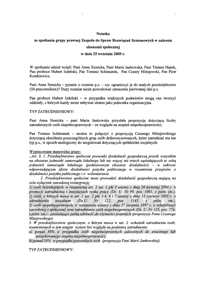 Notatka ze spotkania grupy prawnej Zespolu do Spraw Rozwi~zan Systemowych w zakresie ekonomii spolecznej w dniu 25 wrzesnia 2009 r. W spotkaniu udzial wzi~li: Pani Anna Sienicka, Pani Maria lankowska, Pani Tatiana Hapek, Pan profesor Hubert Izdebski, Pan Tomasz Schimanek, Pan Cezary Mizejewski, Pan Piotr Kontkiewicz. Pani Anna Sienicka - pytanie 0 rozmiar p.s. - czy ograniczy6 je do malych przedsi~biorstw (50 pracownik6w)? Duzy rozmiar moze powodowa6 zatracenie pierwotnej idei p.s. Pan profesor Hubert Izdebski - w przypadku wi~kszych podmiot6w mog'l one tworzy6 oddzialy, z kt6rych kai:dy moze nabywa6 stratus jako jednostka organizacyjna. TYP ZATRUDNIENIOWY: Pani Anna Sienicka - pani Maria lankowska przyslala propozycj~ dotycz'lc'l liczby zatrudnionych os6b niepelnosprawnych - ze wzgl~du na stopien niepelnosprawnosci; Pan Tomasz Schimanek - mozna to pol'lczy6 z propozycj'l Cezarego Mizejewskiego dotycz'lc'l okreslenia poszczeg61nych grup os6b defaworyzowanych, kt6re zatrudnia6 rna ten typ p.s., w spos6b analogiczny do uregulowan dotycz'lcych sp6ldzielni socjalnych: Wypracowane stanowisko grupy: "Art. 8. 1. Przedsiebiorstwo spoleezne prowadzi dzialalnose gospodarezq przede wszystkim na obszarze jednostki samorzqdu lokalnego lub nie wieeej nit trzeeh sqsiadujqeyeh ze sobq jednostek samorzqdu lokalnego (podstawowym obszarze dzialalnosei) - w zakresie odpowiadajqeym sJerze dzialalnosci potytku publieznego w rozumieniu przepis6w 0 dzialalnosei potytku publieznego i 0 wolontariaeie. 2. Przedsiebiorstwo spoleezne mote prowadzie dzialalnose gospodarezq majqeq na Mitejewskiego) 3. W przedsiebiorstwie spoleeznym, TYP ZATRUDNIENIOWY: 0 kt6rym mowa w ust. 2. wskainik zatrudnienia os6b, bez zatrudnienia: Pani Anna Sienieka - typ zdefiniowany poprzez usrugi okreslone w dyrektywie + dodatkowy katalog, zawierajaey m.in. ekologi~, kultur~ Pan profesor Hubert Izdebski - ten katalog powinien bye zdefiniowany preeyzyjnie, poprzez PKD, nie rna tam wprawdzie ekologii jako takiej, ale S'l.np. odpady, smieei. Pan Cezary Mizejewski - To rozwi'l.zanie b~dzie preeyzyjne i nie b~dzie rodzie potrzeby tworzenia nowych definieji. PODZIAL ZYSKU: Pani Anna Sienieka - zgoda, co do tego, ze zakaz - z wyj'l.tkiem przekazywania na cele spoleezne. Pytanie, czy eele spoleezne powinny bye realizowane samodzielnie przez p.s., ezy tez posrednio (poprzez przekazywanie srodkow). Jesli to b~dzie przekazywanie, to czy to b~dzie wykorzystanie zysku, czy koszt? Pan profesor Hubert Izdebski - Jesli przed podzialem zysku, to koszt, jesli w ramaeh podzialu zysku, to juzjako podzial zysku - zalezy od momentu wykorzystania tyeh srodkow. Pan Cezary Mizejewski - zalezy na ktory rok ksi~gowane. Pan profesor Hubert Izdebski - poza tym rna to bye mozliwose, a nie obowi'l.zek. Pan Tomasz Schimanek - to powinien bye obowiqzek. Pan Piotr Kontkiewicz - nadwyzka przekazywana na eel spoleczny nie jest przekazywana na podstawow'l. dzialalnose, jak'l. jest dzialalnose gospodarcza. Czy dzialalnose spoleczna moze bye finansowana tylko z nadwyzki, czy tez z innych irode!? P.s. powinny same decydowae, ezy realizowae eel spoleezny samodzielnie, ezy tez przekazywae srodki na ten eel na zewn'l.trz. Pan profesor Hubert Izdebski - a moze 10 % obligatoryjnie? Wyznaezye gom'l. granie~ - nie moze to bye 100%, poniewaZ to zaprzeezenie przedsi~biorezosei. Pani Maria Jankowska - A czemu nie 100%? Nie zadekretujemy, czy b~d'l.przedsi~biorezy. Pan Cezary Mizejewski - mozna kierunkowo okreslie, ze 10% Pani Maria Jankowska - przekazywanie na eel spoleczny tez moze bye okazj'l. do omijania zakazu podziaru zyskow mi~dzy interesariuszy - dzieci prezesa. Pan profesor Hubert Izdebski - mozna przeniese do ustawy zabezpieczenie z ustawy pozytku. Pan Tomasz Schimanek - tak, to b~dzie wzmaeniae zaufanie. DEMOKRATYCZNE ZARZl\DZANIE Pan Cezary Mizejewski - statut okresli, kto jest interesariuszem. 0 Pan profesor interesariuszy Hubert Izdebski - statut moze tez okreslae, ze b~d'l to przedstawiciele (interesariuszy b~dzie z pewnosci'l wi~cej niz pracownik6w). Pani Anna Sienicka - co z zadaniami og6lnego zebrania? Pan Piotr Kontkiewicz - samorz'ld zalogi uprawnienia niz zgromadzenie ogolne p.s. przedsi~biorstwa panstwowego rna wi~ksze Pan profesor Hubert Izdebski - zatwierdzenie nie wywoluje zadnych dalszych skutkow. Ma charakter opinii. Nie rna potrzeby dalszego ograniczania uprawnien zebrania ogolnego. UPRA WNIENIA Pani Anna Sienicka - 1% z CIT? Pani Maria Jankowska - Nie. Pani Anna Sienicka - Jesli chodzi dla obu typow. 0 zwolnienia z podatku od nieruchomosci, to powinny bye Pan profesor Hubert Izdebski - to podatek lokalny, jelki gmina na tym straci, to odpije sobie na innych oplatach. Pan Cezary Mizejewski - To musi zaakceptowae Komisja Wspolna. PFRON refunduje gminom zwolnienia z podatku lokalnego. Uiga w podatku lokalnym to pomoc de minimis! Pan profesor Hubert Izdebski - ale juz np. zwolnienie z oplat za uZytkowanie wieczyste to kwestia umowy cywilnoprawnej. To nie pomoc publiczna. Pani Maria Jankowska - a dzierzawa? Pan profesor Hubert Izdebski - tez nie. Co do przywilej6w 0 charakterze lokalnym mozna je uzasadnie lokalnym charakterem p.s. i rozwi£lZywaniem przez nie problem6w 0 charakterze lokalnym. Jest to de facto pomoc w realizacji zadan gminy. Pani Maria Jankowska - to moze bye argument zainteresowana akurat tak'l form'lpomocy. niewystarczaj'lcy, gmina moze nie bye Pan Tomasz Schimanek - zapisae zwolnienie z podatku od nieruchomosci jako mozliwose a nie obowi£lZek gminy. Pan Cezary Mizejewski - preferencje w zam6wieniach publicznych przewiduje nowelizacja pzp (klauzula spoleczna). Mozna wprowadzie szczeg6lne uprawnienia dla p.s. Wypracowane stanowisko grupy: Przywilej Zwolnienie z CIT Zwolnienie/ulga z VAT Podatki i oplaty lokalne Zwolnienie/ulga z PCC Zwolnienia z oplat s~dowych, skarbowych Preferencje w korzystaniu z nieruchomosci publicznych Wolontariat Wsparcie okreslone w ustawie 0 zatrudnieniu socjalnym Prace spolecznie uZyteczne Roboty publiczne Typ uslugowy w za