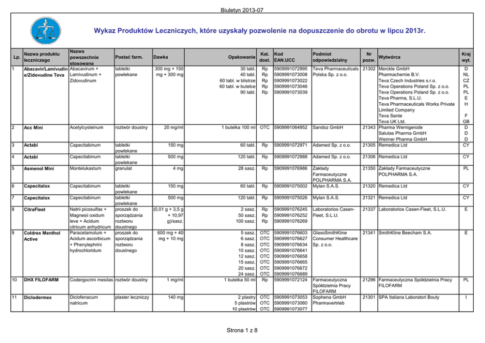 Biuletyn 2013-07 YCH URZĄ D RE JE 1 Wykaz Produktów Leczniczych, które uzyskały pozwolenie na dopuszczenie do obrotu w lipcu 2013r. CZ ÓJ OB Lp. I PRODUKT CH ÓW NY BI CZ PRODUKTÓW CJI LE RA C ST YROBÓ W CH W ME ZY IC DY ZN Nazwa powszechnie stosowana Abacavir/Lamivudin Abacavirum + e/Zidovudine Teva Lamivudinum + Zidovudinum Nazwa produktu leczniczego Postać farm. tabletki powlekane Dawka Opakowanie 300 mg + 150 mg + 300 mg Rp 5909991072971 500 mg 120 tabl. Rp 5909991072988 Adamed Sp. z o.o. 21306 Remedica Ltd CY 4 mg 28 sasz. Rp 5909991076986 21350 Zakłady Farmaceutyczne POLPHARMA S.A. PL 150 mg 60 tabl. Rp 5909991075002 Zakłady Farmaceutyczne POLPHARMA S.A. Mylan S.A.S. 21320 Remedica Ltd CY 500 mg 120 tabl. Rp 5909991075026 Mylan S.A.S. 21321 Remedica Ltd CY (0,01 g + 3,5 g + 10,97 g)/sasz. 2 sasz. 50 sasz. 100 sasz. Rp Rp Rp 5909991076245 5909991076252 5909991076269 Laboratorios CasenFleet, S.L.U. 21337 Laboratorios Casen-Fleet, S.L.U. E 600 mg + 40 mg + 10 mg 5 sasz. 6 sasz. 8 sasz. 10 sasz. 12 sasz. 15 sasz. 20 sasz. 24 sasz. 1 butelka 50 ml OTC OTC OTC OTC OTC OTC OTC OTC Rp 5909991076603 5909991076627 5909991076634 5909991076641 5909991076658 5909991076665 5909991076672 5909991076689 5909991072124 GlaxoSmithKline Consumer Healthcare Sp. z o.o. 21341 SmithKline Beecham S.A. E Farmaceutyczna Spółdzielnia Pracy FILOFARM Sophena GmbH Pharmavertrieb 21296 Farmaceutyczna Spółdzielnia Pracy FILOFARM PL roztwór doustny 3 Actabi Capecitabinum 4 Actabi Capecitabinum 5 Asmenol Mini Montelukastum tabletki powlekane tabletki powlekane granulat 6 Capecitalox Capecitabinum 7 Capecitalox 8 CitraFleet 9 Coldrex Menthol Active 10 DHX FILOFARM Codergocrini mesilas roztwór doustny 1 mg/ml 11 Diclodermex Diclofenacum natricum 140 mg tabletki powlekane Capecitabinum tabletki powlekane Natrii picosulfas + proszek do Magnesii oxidum sporządzania leve + Acidum roztworu citricum anhydricum doustnego Paracetamolum + proszek do Acidum ascorbicum sporządzania + Phenylephrini roztworu hydrochloridum doustnego plaster leczniczy Kraj wyt. 60 tabl. Acetylcysteinum 20 mg/ml 5909991072995 5909991073008 5909991073022 5909991073046 5909991073039 Nr Wytwórca pozw. 150 mg Acc Mini Rp Rp Rp Rp Rp Podmiot odpowiedzialny Teva Pharmaceuticals 21302 Merckle GmbH Polska Sp. z o.o. Pharmachemie B.V. Teva Czech Industries s.r.o. Teva Operations Poland Sp. z o.o. Teva Operations Poland Sp. z o.o. Teva Pharma, S.L.U. Teva Pharmaceuticals Works Private Limited Company Teva Sante Teva UK Ltd. Sandoz GmbH 21343 Pharma Wernigerode Salutas Pharma GmbH Weimer Pharma GmbH Adamed Sp. z o.o. 21305 Remedica Ltd 2 30 tabl. 40 tabl. 60 tabl. w blistrze 60 tabl. w butelce 90 tabl. Kat. Kod dost. EAN.UCC 1 butelka 100 ml OTC 5909991064952 2 plastry OTC 5909991073053 5 plastrów OTC 5909991073060 10 plastrów OTC 5909991073077 Strona 1 z 8 21301 SPA Italiana Laboratori Bouty D NL CZ PL PL E H F GB D D D CY I Biuletyn 2013-07 Nazwa produktu Lp. leczniczego Nazwa powszechnie stosowana Digoxinum Postać farm. 12 Digoxin Sopharma roztwór do wstrzykiwań lub infuzji Diosminum tabletki powlekane Toxinum botulinicum proszek do typum A ad sporządzania iniectabile; toksyna roztworu do botulinowa typu A do wstrzykiwań wstrzykiwań 13 Diosminex Max 14 Dysport 15 Eztom Mometasoni fuoras krem 16 Fayton Acidum zoledronicum roztwór do infuzji 17 Fludarabine Kabi Fludarabini phosphas 18 Funtrol Amorolfinum proszek do sporządzania roztworu do wstrzykiwań i infuzji lakier do paznokci leczniczy 19 Hascosept Forte Benzydamini hydrochloridum 20 Imatinib Zentiva Imatinibum 21 Imatinib Zentiva Imatinibum 22 Implanon NXT Etonogestrelum aerozol do stosowania w jamie ustnej, roztwór tabletki powlekane tabletki powlekane implant 23 Ivoxel Mometasoni fuoras krem Dawka Opakowanie 0,25 mg/ ml 1000 mg 300 jednostek kompleksu neurotoksyny Clostridium botulinum typu A/fiolkę 10 amp. 2 ml 100 amp. 2 ml Kat. Kod dost. EAN.UCC Rp Rp 5909991056292 5909991056308 30 tabl. OTC 5909991076740 60 tabl. OTC 5909991076757 1 fiol. proszku Rp 5909991072094 2 fiol. proszku Rp 5909991072100 Podmiot odpowiedzialny Nr Wytwórca pozw. Kraj wyt. Sopharma Warszawa Sp. z o.o. 21318 Sopharma PLC BG PharmaSwiss Ceska Republika s.r.o. Ipsen Limited 21365 Przedsiębiorstwo Farmaceutyczne LEK-AM Sp. z o.o. 21303 Ipsen Biopharm Ltd. PL GB 1 mg/g 1 tuba 15 g 1 tuba 30 g Rp Rp 5909991078508 5909991078522 Glenmark 21363 Accord Healthcare Ltd Pharmaceuticals s.r.o. Glenmark Generics (Europe) Ltd GB GB 4 mg/100 ml 1 fiol. 100 ml Rpz 5909991078577 Glenmark 21358 Agila Specialties Polska Sp. z o.o. Pharmaceuticals s.r.o. Sanochemia Pharmazeutika AG PL A 50 mg 1 fiol. proszku Lz 5909991075125 Fresenius Kabi Oncology Plc. 21335 Fresenius Kabi Oncology Plc. GB 5909991067434 5909991067441 5909991067458 5909991067465 5909991067472 5909991073244 Chanelle Medical 21364 Chanelle Medical IRL 21297 Przedsiębiorstwo Produkcji Farmaceutycznej HASCO-LEK S.A. PL 21311 Remedica Ltd CY 50 mg/ml 3 mg/ml 1 butelka 2,5 ml Rp 1 butelka 3 ml Rp 1 butelka 5 ml Rp 1 butelka 7,5 ml Rp 1 butelka 10 ml Rp 1 butelka 30 ml OTC 100 mg 60 tabl. Rp 5909991074005 Przedsiębiorstwo Produkcji Farmaceutycznej HASCO-LEK S.A. Zentiva, k.s. 400 mg 30 tabl. Rp 5909991074029 Zentiva, k.s. 21312 Remedica Ltd CY 68 mg 1 implant Rp 5909991069292 N.V. Organon 21319 N.V. Organon NL 1 mg/g 1 tuba 10 g 1 tuba 15 g 1 tuba 20 g 1 tuba 25 g 1 tuba 30 g 1 tuba 50 g 1 tuba 60 g 1 tuba 100 g Rp Rp Rp Rp Rp Rp Rp Rp 5909991076764 5909991076771 5909991076788 5909991076795 5909991076801 5909991076849 5909991076856 5909991076863 Almirall Hermal GmbH 21345 Almirall Hermal GmbH Strona 2 z 8 D Biuletyn 2013-07 Nazwa produktu Lp. leczniczego 24 Ivoxel 25 Lercan 26 Nazwa powszechnie stosowana Mometasoni fuoras Postać farm. Dawka Opakowanie maść 1 mg/g Lercanidipini hydrochloridum tabletki powlekane 10 mg Lercan Lercanidipini hydrochloridum tabletki powlekane 20 mg 27 Levofloxacin Kabi Levofloxacinum roztwór do infuzji 28 Levosert Levonor