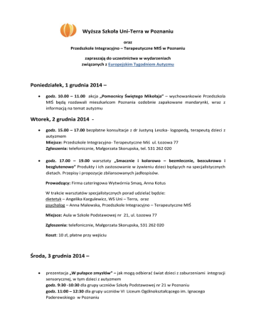 Wyższa Szkoła Uni-Terra w Poznaniu oraz Przedszkole Integracyjno – Terapeutyczne MIŚ w Poznaniu zapraszają do uczestnictwa w wydarzeniach związanych z Europejskim Tygodniem Autyzmu Poniedziałek, 1 grudnia 2014 – godz. 10.00 – 11.00 akcja „Pomocnicy Świętego Mikołaja” – wychowankowie Przedszkola MIŚ będą rozdawali mieszkańcom Poznania ozdobnie zapakowane mandarynki, wraz z informacją na temat autyzmu Wtorek, 2 grudnia 2014 godz. 15.00 – 17.00 bezpłatne konsultacje z dr Justyną Leszka- logopedą, terapeutą dzieci z autyzmem Miejsce: Przedszkole Integracyjno- Terapeutyczne Miś ul. Łozowa 77 Zgłoszenia: telefonicznie, Małgorzata Skorupska, tel. 531 262 020 godz. 17.00 – 19.00 warsztaty „Smacznie i kolorowo – bezmlecznie, bezcukrowo i bezglutenowo” Produkty i ich zastosowanie w żywieniu dzieci będących na specjalistycznych dietach. Przepisy i propozycje zbilansowanych jadłospisów. Prowadzący: Firma cateringowa Wytwórnia Smaq, Anna Kotus W trakcie warsztatów specjalistycznych porad udzielać będzie: dietetyk – Angelika Kargulewicz, WS Uni – Terra, oraz psycholog – Anna Malewska, Przedszkole Integracyjno – Terapeutyczne MIŚ Miejsce: Aula w Szkole Podstawowej nr 21, ul. Łozowa 77 Zgłoszenia: telefonicznie, Małgorzata Skorupska, 531 262 020 Koszt: 10 zł, płatne przy wejściu Środa, 3 grudnia 2014 – prezentacja „W pułapce zmysłów” – jak mogą odbierać świat dzieci z zaburzeniami integracji sensorycznej, w tym dzieci z autyzmem godz. 9:30 -10:30 dla grupy uczniów Szkoły Podstawowej nr 21 w Poznaniu godz. 11:00 – 12:30 dla grupy uczniów VI Liceum Ogólnokształcącego im. Ignacego Paderewskiego w Poznaniu Prowadzący: kadra Przedszkola MIŚ Miejsce: Aula w Szkole Podstawowej nr 21, ul. Łozowa 77 warsztaty z bajką terapeutyczną na temat autyzmu i wykonanie pracy „Korale wyzwalają emocje” godz. 8:55 – 9:45 spotkanie dla grupy uczniów Szkoły Podstawowej nr 26 w Poznaniu Prowadzący: kadra Przedszkola MIŚ Miejsce: Przedszkole Integracyjno- Terapeutyczne Miś ul. Berwińskiego 2/4 godz. 12.00 – 15.00 szkolenie „Wczesna diagnoza zaburzeń ze spektrum autyzmu” – szkolenie dla pielęgniarek i położnych zorganizowane we współpracy z Okręgową Izbą Pielęgniarek i Położnych w Poznaniu; Prowadząca: dr Justyna Leszka, WS Uni- Terra Miejsce: Siedziba OIPIP, Poznań ul. Grunwaldzka 65 Zgłoszenia: telefonicznie, sekretariat OIPIP 061 8620 952, 061 8620 969 Szkolenie jest bezpłatne Czwartek, 4 grudnia 2014 – godz. 10.00 z wizytą w Szpitalu przy ul. Polnej w ramach akcji „ Pluszaki dla dzieci z poznańskich szpitali” - delegacja dzieci z Przedszkola (oddział Berwińskiego i Łozowa) do szpitala i wręczenie maskotek małym pacjentom. godz. 12.00 – 15.00 szkolenie „Wczesna diagnoza zaburzeń ze spektrum autyzmu” – szkolenie dla pielęgniarek i położnych zorganizowane we współpracy z Okręgową Izbą Pielęgniarek i Położnych w Poznaniu; Prowadząca: dr Justyna Leszka, WS Uni- Terra Miejsce: Siedziba OIPIP, Poznań ul. Grunwaldzka 65 Zgłoszenia: telefonicznie, sekretariat OIPIP 061 8620 952, 061 8620 969 Szkolenie jest bezpłatne Piątek, 5 grudnia 2014 – Drzwi otwarte – zapraszamy wszystkich zainteresowanych do naszych placówek przedszkolnych przy ul. Berwińskiego 2/4 oraz ul. Łozowej 77 Godz. 11.00 – 12.00 „Pobaw się razem z Nami” – zajęcia muzyczno- ruchowe dla dzieci z całego Poznania – wstęp wolny! Prowadzący: kadra Przedszkola MIŚ Miejsce: Przedszkole Integracyjno- Terapeutyczne Miś ul. Berwińskiego 2/4 Poznań Przedszkole Integracyjno- Terapeutyczne Miś ul. Łozowa 77 Poznań Sobota, 6 grudnia 2014 – godz. 11.00 – 13.00 akcja „Pomocnicy Świętego Mikołaja” – studenci WS Uni-Terra będą rozdawali mieszkańcom Poznania ozdobnie zapakowane mandarynki, wraz z informacją na temat autyzmu godz. 10.00 z wizytą do Szpitali Poznańskich w ramach akcji „ Pluszaki dla dzieci z poznańskich szpitali” – delegacja kadry Przedszkola Miś
