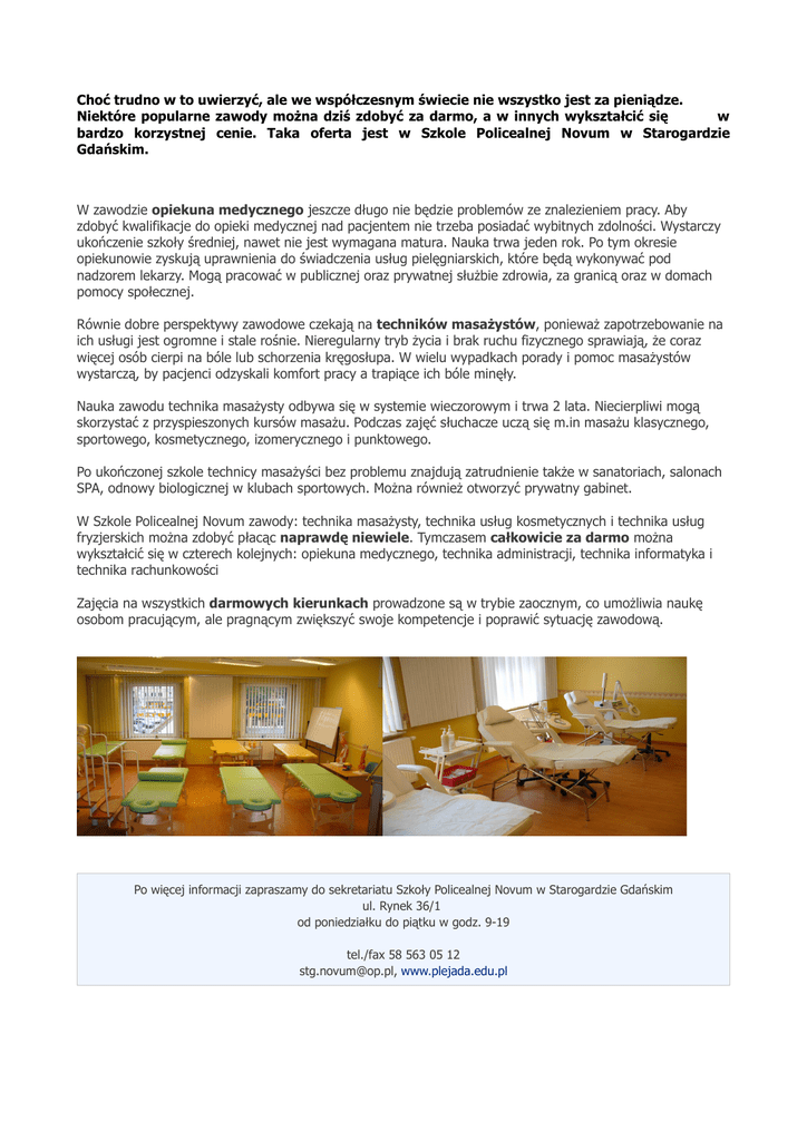 Choć trudno w to uwierzyć, ale we współczesnym świecie nie wszystko jest za pieniądze. Niektóre popularne zawody można dziś zdobyć za darmo, a w innych wykształcić się w bardzo korzystnej cenie. Taka oferta jest w Szkole Policealnej Novum w Starogardzie Gdańskim. W zawodzie opiekuna medycznego jeszcze długo nie będzie problemów ze znalezieniem pracy. Aby zdobyć kwalifikacje do opieki medycznej nad pacjentem nie trzeba posiadać wybitnych zdolności. Wystarczy ukończenie szkoły średniej, nawet nie jest wymagana matura. Nauka trwa jeden rok. Po tym okresie opiekunowie zyskują uprawnienia do świadczenia usług pielęgniarskich, które będą wykonywać pod nadzorem lekarzy. Mogą pracować w publicznej oraz prywatnej służbie zdrowia, za granicą oraz w domach pomocy społecznej. Równie dobre perspektywy zawodowe czekają na techników masażystów, ponieważ zapotrzebowanie na ich usługi jest ogromne i stale rośnie. Nieregularny tryb życia i brak ruchu fizycznego sprawiają, że coraz więcej osób cierpi na bóle lub schorzenia kręgosłupa. W wielu wypadkach porady i pomoc masażystów wystarczą, by pacjenci odzyskali komfort pracy a trapiące ich bóle minęły. Nauka zawodu technika masażysty odbywa się w systemie wieczorowym i trwa 2 lata. Niecierpliwi mogą skorzystać z przyspieszonych kursów masażu. Podczas zajęć słuchacze uczą się m.in masażu klasycznego, sportowego, kosmetycznego, izomerycznego i punktowego. Po ukończonej szkole technicy masażyści bez problemu znajdują zatrudnienie także w sanatoriach, salonach SPA, odnowy biologicznej w klubach sportowych. Można również otworzyć prywatny gabinet. W Szkole Policealnej Novum zawody: technika masażysty, technika usług kosmetycznych i technika usług fryzjerskich można zdobyć płacąc naprawdę niewiele. Tymczasem całkowicie za darmo można wykształcić się w czterech kolejnych: opiekuna medycznego, technika administracji, technika informatyka i technika rachunkowości Zajęcia na wszystkich darmowych kierunkach prowadzone są w trybie zaocznym, co umożliwia naukę osobom pracującym, ale pragnącym zwiększyć swoje kompetencje i poprawić sytuację zawodową. Po więcej informacji zapraszamy do sekretariatu Szkoły Policealnej Novum w Starogardzie Gdańskim ul. Rynek 36/1 od poniedziałku do piątku w godz. 9-19 tel./fax 58 563 05 12 [email protected], www.plejada.edu.pl