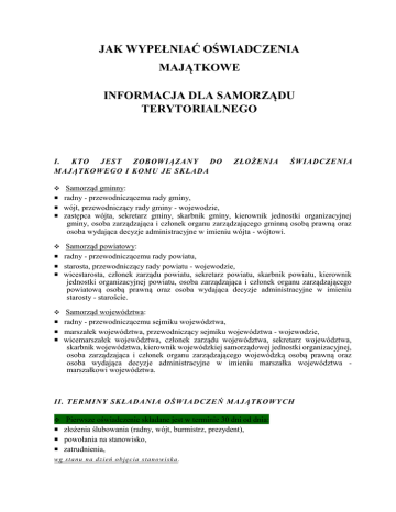 JAK WYPEŁNIAĆ OŚWIADCZENIA MAJĄTKOWE INFORMACJA DLA SAMORZĄDU TERYTORIALNEGO I. KTO JEST ZOBOWI ĄZANY DO MAJĄTKOWEGO I KOMU JE SKŁADA ZŁOŻENIA ŚWIADCZENIA ❖ Samorząd gminny: ■ radny - przewodniczącemu rady gminy, ■ wójt, przewodniczący rady gminy - wojewodzie, ■ zastępca wójta, sekretarz gminy, skarbnik gminy, kierownik jednostki organizacyjnej gminy, osoba zarządzająca i członek organu zarządzającego gminną osobą prawną oraz osoba wydająca decyzje administracyjne w imieniu wójta - wójtowi. ❖ Samorząd powiatowy: ■ radny - przewodniczącemu rady powiatu, ■ starosta, przewodniczący rady powiatu - wojewodzie, ■ wicestarosta, członek zarządu powiatu, sekretarz powiatu, skarbnik powiatu, kierownik jednostki organizacyjnej powiatu, osoba zarządzająca i członek organu zarządzającego powiatową osobą prawną oraz osoba wydająca decyzje administracyjne w imieniu starosty - staroście. ❖ Samorząd województwa: ■ radny - przewodniczącemu sejmiku województwa, ■ marszałek województwa, przewodniczący sejmiku województwa - wojewodzie, ■ wicemarszałek województwa, członek zarządu województwa, sekretarz województwa, skarbnik województwa, kierownik wojewódzkiej samorządowej jednostki organizacyjnej, osoba zarządzająca i członek organu zarządzającego wojewódzką osobą prawną oraz osoba wydająca decyzje administracyjne w imieniu marszałka województwa marszałkowi województwa. II. TERMINY SKŁADANIA O ŚWIADCZEŃ MAJĄTKOWYCH ❖ Pierwsze oświadczenie składane jest w terminie 30 dni od dnia: ■ złożenia ślubowania (radny, wójt, burmistrz, prezydent), ■ powołania na stanowisko, ■ zatrudnienia, wg sta n u n a d z ień o b ję c ia s ta n o wi ska . 2 ❖ Kolejne oświadczenie składane jest: ■ do 30 kwietnia następnego roku, wg sta n u n a d z ień 3 1 g r u d n ia ro ku p o p rz ed n i eg o . ❖ Ostatnie oświadczenie składane jest: ■ na dwa miesiące przed upływem kadencji (radny, wójt, burmistrz, prezydent), ■ w dniu odwołania ze stanowiska, ■ w dniu rozwiązania umowy o pracę, wg s ta n u n a d z ie ń zd ar z en ia u za sad n iaj ące go zł o że nie o ś wi ad cz e ni a . Do pierwszego oświadczenia należy dołączyć: ■ wójt (burmistrz, prezydent miasta) - informację o zaprzestaniu prowadzenia działalności gospodarczej, jeżeli taką działalność prowadził przed dniem wyboru, ■ radny gminy/powiatu/województwa - informację o sposobie i terminie zaprzestania prowadzenia działalności gospodarczej z wykorzystaniem mienia jednostki samorządu terytorialnego, w której uzyskał mandat, jeżeli taką działalność prowadził przed dniem wyboru; radni powinni zaprzestać prowadzenia w/w działalności gospodarczej w ciągu 3 miesięcy od dnia złożenia ślubowania, ■ starosta, marszałek województwa oraz pozostałe osoby zobowiązane do złożenia oświadczenia w samorządach wszystkich szczebli - informację o sposobie i terminie zaprzestania prowadzenia działalności gospodarczej, jeżeli taką działalność prowadzili przed dniem wyboru, powołania lub zatrudnienia; osoby te powinny zaprzestać prowadzenia działalności gospodarczej w ciągu 3 miesięcy od dnia wyboru, powołania lub zatrudnienia. W przypadku zmiany w trakcie kadencji na stanowisku przewodniczącego danej rady, nowo wybrany przewodniczący swoje kolejne oświadczenie składa wojewodzie (wraz z kopią uchwały o wyborze na stanowisko przewodniczącego oraz wcześniej złożonymi oświadczeniami majątkowymi). Sam wybór na przewodniczącego rady nie powoduje obowiązku złożenia oświadczenia majątkowego w związku z tym faktem. Obowiązujące pozostają terminy złożenia oświadczenia przewidziane dla radnych, zmienia się jedynie osoba, której składa się oświadczenie majątkowe - jest to nie przewodniczący rady, lecz wojewoda. III. PODSTAWA PRAWNA ■ art. 24h i następne ustawy z dnia 8 marca 1990 r. o samorządzie gminnym (Dz.U.2013.594 j.t. ze zm.), ■ art. 25c i następne ustawy z dnia 5 czerwca 1998 r. o samorządzie powiatowym (Dz.U.2013.595 j.t. ze zm.), ■ art. 27c i następne ustawy z dnia 5 czerwca 1998 r. o samorządzie województwa (Dz.U.2013.596 j.t. ze zm.). Wzory oświadczeń majątkowych zostały określone w aktach wykonawczych opartych na wskazanych powyżej przepisach, tj. w: ■ Rozporządzeniu Prezesa Rady Ministrów z dnia 26.02.2003 r. w sprawie określenia wzorów formularzy oświadczeń majątkowych radnego gminy, wójta, zastępcy wójta, sekretarza gminy, skarbnika gminy, kierownika jednostki organizacyjnej gminy, osoby zarządzającej i członka organu zarządzającego gminną osobą prawną oraz osoby wydającej decyzje administracyjne w imieniu wójta (Dz. U. z 2003 r. Nr 34, poz. 282), Gmina Będzino 76-037 Będzino 19 3 ■ Rozporządzeniu Prezesa Rady Ministrów z dnia 26.02.2003 r. w sprawie określenia wzorów formularzy oświadczeń majątkowych radnego powiatu, członka zarządu powiatu, sekretarza powiatu , skarbnika powiatu, kierownika jednostki organizacyjnej powiatu, osoby zarządzającej i członka organu zarządzającego powiatową osobą prawną oraz osoby wydającej decyzje administracyjne w imieniu starosty (Dz. U. z 2003 r. Nr 34, poz. 283), ■ Rozporządzeniu Prezesa Rady Ministrów z dnia 09.04.2009 r. w sprawie określenia wzorów formularzy oświadczeń majątkowych radnego województwa, członka zarządu województwa, skarbnika województwa, sekretarza województwa, kierownika wojewódzkiej samorządowej jednostki organizacyjnej, osoby zarządzającej i członka organu zarządzającego wojewódzką osobą prawną oraz osoby wydającej decyzje administracyjne w imieniu marszałka województwa (Dz. U. z 2009 r. Nr 60, poz. 490). IV. NIEZŁOŻENIE OŚWIADCZENIA MAJĄTKOWEGO Jeżeli określone w ustawach samorządowych terminy na złożenie oświadczenia majątkowego (w zależności od pełnionej funkcji - 30 dni od dnia ślubowania, powołan