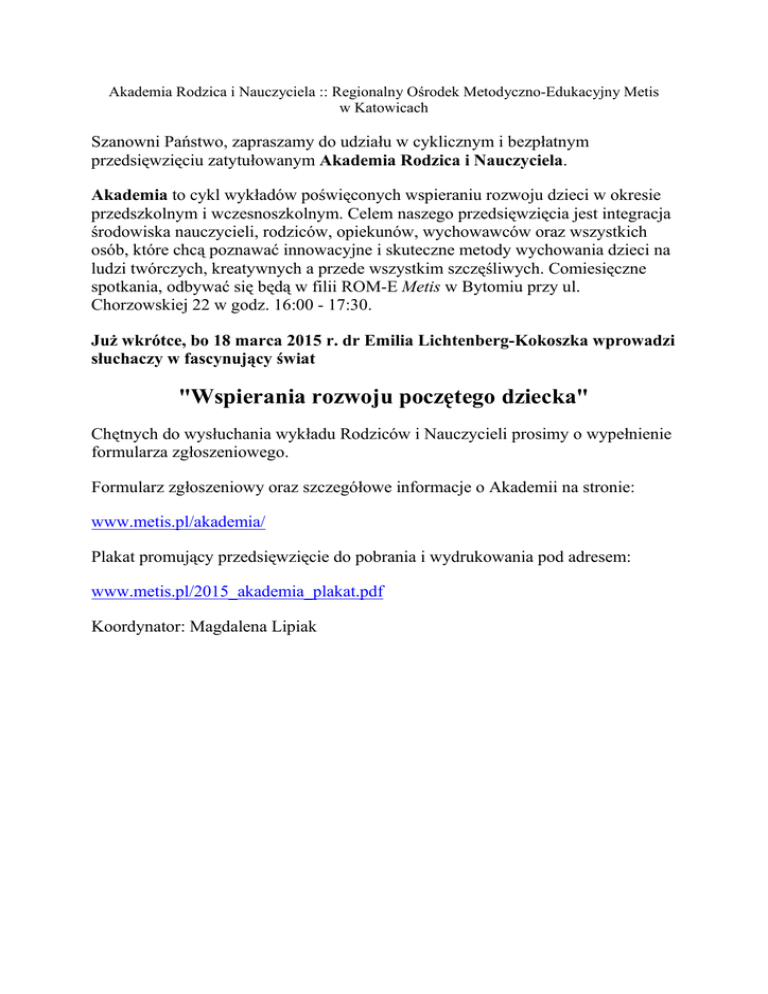Akademia Rodzica i Nauczyciela :: Regionalny Ośrodek Metodyczno-Edukacyjny Metis w Katowicach Szanowni Państwo, zapraszamy do udziału w cyklicznym i bezpłatnym przedsięwzięciu zatytułowanym Akademia Rodzica i Nauczyciela. Akademia to cykl wykładów poświęconych wspieraniu rozwoju dzieci w okresie przedszkolnym i wczesnoszkolnym. Celem naszego przedsięwzięcia jest integracja środowiska nauczycieli, rodziców, opiekunów, wychowawców oraz wszystkich osób, które chcą poznawać innowacyjne i skuteczne metody wychowania dzieci na ludzi twórczych, kreatywnych a przede wszystkim szczęśliwych. Comiesięczne spotkania, odbywać się będą w filii ROM-E Metis w Bytomiu przy ul. Chorzowskiej 22 w godz. 16:00 - 17:30. Już wkrótce, bo 18 marca 2015 r. dr Emilia Lichtenberg-Kokoszka wprowadzi słuchaczy w fascynujący świat "Wspierania rozwoju poczętego dziecka" Chętnych do wysłuchania wykładu Rodziców i Nauczycieli prosimy o wypełnienie formularza zgłoszeniowego. Formularz zgłoszeniowy oraz szczegółowe informacje o Akademii na stronie: www.metis.pl/akademia/ Plakat promujący przedsięwzięcie do pobrania i wydrukowania pod adresem: www.metis.pl/2015_akademia_plakat.pdf Koordynator: Magdalena Lipiak