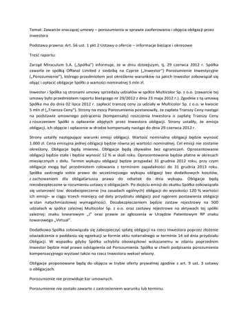 Temat: Zawarcie znaczącej umowy – porozumienia w sprawie zaoferowania i objęcia obligacji przez inwestora Podstawa prawna: Art. 56 ust. 1 pkt 2 Ustawy o ofercie – informacje bieżące i okresowe Treść raportu: Zarząd Miraculum S.A. („Spółka”) informuje, że w dniu dzisiejszym, tj. 29 czerwca 2012 r. Spółka zawarła ze spółką Offanal Limited z siedzibą na Cyprze („Inwestor”) Porozumienie Inwestycyjne („Porozumienie”), którego przedmiotem jest określenie warunków na jakich Inwestor zobowiązał się objąć i opłacić obligacje Spółki o wartości nominalnej 5 mln zł. Inwestor i Spółka są stronami umowy sprzedaży udziałów w spółce Multicolor Sp. z o.o. (zawarcie tej umowy było przedmiotem raportu bieżącego nr 29/2012 z dnia 23 maja 2012 r.). Zgodnie z tą umową Spółka ma do dnia 02 lipca 2012 r. zapłacić transzę ceny za udziały w Multicolor Sp. z o.o. w kwocie 5 mln zł („Transza Ceny”). Strony na mocy Porozumienia postanowiły, że zapłata Transzy Ceny nastąpi na podstawie umownego potrącenia (kompensaty) roszczenia Inwestora o zapłatę Transzy Ceny z roszczeniem Spółki o opłacenie objętych przez Inwestora obligacji. Strony ustaliły, że emisja obligacji, ich objęcie i opłacenie w drodze kompensaty nastąpi do dnia 29 czerwca 2012 r. Strony ustaliły następujące warunki emisji obligacji. Wartość nominalna obligacji będzie wynosić 1.000 zł. Cena emisyjna jednej obligacji będzie równa jej wartości nominalnej. Cel emisji nie zostanie określony. Obligacje będą imienne. Obligacje będą zbywalne bez ograniczeń. Oprocentowanie obligacji będzie stałe i będzie wynosić 12 % w skali roku. Oprocentowanie będzie płatne w okresach miesięcznych z dołu. Termin wykupu obligacji będzie przypadać 31 grudnia 2012 roku, przy czym obligacje mogą być przedmiotem rolowania z terminem zapadalności do 31 grudnia 2013 roku. Spółka zastrzegła sobie prawo do wcześniejszego wykupu obligacji bez dodatkowych kosztów, z zachowaniem dla obligatariusza prawa do odsetek do dnia wykupu. Obligacje będą niezabezpieczone w rozumieniu ustawy o obligacjach. Po dojściu emisji do skutku Spółka zobowiązała się ustanowić tzw. dozabezpieczenie (na zasadach ogólnych) obligacji do wysokości 120 % wartości ich emisji– w ciągu trzech miesięcy od daty przydziału obligacji pod rygorem postawienia obligacji w stan natychmiastowej wymagalności. Dozabezpieczeniem będzie zastaw rejestrowy na 500 udziałach w spółce zależnej Multicolor Sp. z o.o. oraz zastawy rejestrowe na aktywach tej spółki zależnej: znaku towarowym „J” oraz prawie ze zgłoszenia w Urzędzie Patentowym RP znaku towarowego „Virtual”. Dodatkowo Spółka zobowiązała się zabezpieczyć spłatę obligacji na rzecz Inwestora poprzez złożenie oświadczenia o poddaniu się egzekucji w formie aktu notarialnego w terminie 14 od dnia przydziału Obligacji. W wypadku gdyby Spółka uchybiła obowiązkowi wskazanemu w zdaniu poprzednim Inwestor będzie miał prawo odstąpienia od Porozumienia. Spółka w chwili podpisania porozumienia kompensacyjnego wystawi także na rzecz Inwestora weksel własny. Obligacje proponowane będą do objęcia w trybie oferty prywatnej zgodnie z art. 9 ust. 3 ustawy o obligacjach. Porozumienie nie przewiduje kar umownych. Porozumienie nie zostało zawarte z zastrzeżeniem warunku lub terminu. Porozumienie zostało uznane za znaczącą umowę z uwagi na fakt, że jej wartość przekracza 10 % kapitałów własnych Spółki.