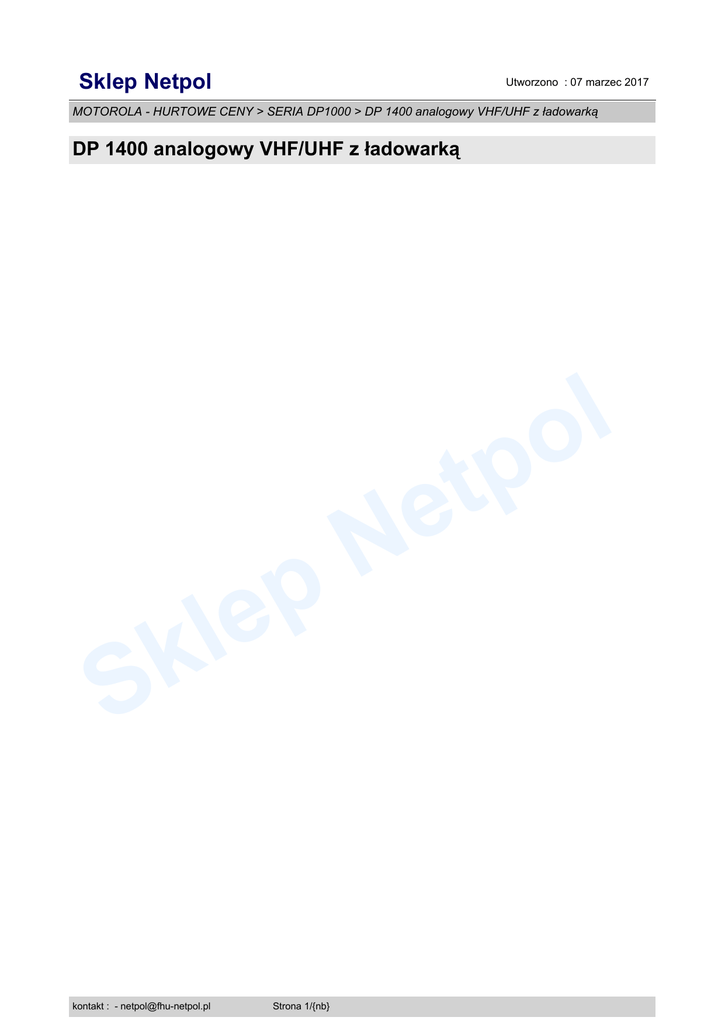 Sklep Netpol Utworzono : 07 marzec 2017 MOTOROLA - HURTOWE CENY > SERIA DP1000 > DP 1400 analogowy VHF/UHF z ładowarką DP 1400 analogowy VHF/UHF z ładowarką S N p e l k kontakt : - [email protected] p t e Strona 1/{nb} l o Sklep Netpol Utworzono : 07 marzec 2017 MOTOROLA - HURTOWE CENY > SERIA DP1000 > DP 1400 analogowy VHF/UHF z ładowarką DP 1400 analogowy VHF/UHF z ładowarką Model : dp 1400 DP 1400 analogowy VHF/UHF z ładowarką Producent : Motorola � Profesjonalna Platforma Cyfrowa MOTOTRBO � Zgodna z Cyfrowym Standardem ETSI DMR � Wykonana w technologii TDMA � Dwie szczeliny czasowe na jednym kanale radiowym RF � W każdym radiotelefonie wbudowany modem do przesyłania danych � Umożliwia przesyłanie wiadomości tekstowych i pakietów danych � Urządzenia mogą pracować w trybie cyfrowym i analogowym l o p t e Motorola DP 1400 analogowy - wersja VHF lub UHF 136-174 MHz, 403-470 MHz Standardowe ukompletowanie: N p antena 136-174 lub 403-470 MHz akumulator NiMH 1400 mAh PMNN4251 zaczep do pasa 63 mm 2,5" HLN8255 ładowarka z zasilaczem instrukcja obsługi gwarancja 24 miesiące, akumulatory 12 miesięcy S e l k kontakt : - [email protected] Strona 2/{nb} Sklep Netpol Utworzono : 07 marzec 2017 MOTOROLA - HURTOWE CENY > SERIA DP1000 > DP 1400 analogowy VHF/UHF z ładowarką DP 1400 analogowy VHF/UHF z ładowarką S N p e l k kontakt : - [email protected] p t e Strona 3/{nb} l o Sklep Netpol Utworzono : 07 marzec 2017 MOTOROLA - HURTOWE CENY > SERIA DP1000 > DP 1400 analogowy VHF/UHF z ładowarką DP 1400 analogowy VHF/UHF z ładowarką Radiotelefon DP1400 dostarczany jest w opakowaniu zawierajacym 20 sztuk urządzeń w uposażeniu fabrycznym z ładowarką Cena katalogowa podana w naszym sklepie jest wartością 20 sztuk rtf. DP1400 (VHF/UHF). Opakowanie zbiorcze 20 sztuk radiotelefonów nie zawiera opakowań indywidualnych. Więcej info na stronie producenta: http://www.motorolasolutions.com/pl_pl/products/mototrbo/dp1000-series/dp1400.html# tabproductinfo l o Cena : 17,835.00 zł Brutto ( 14,500.00 zł Netto) p t e Dostępność: Produkt dostępny w naszym sklepie od 09 listopad 2016 S N p e l k kontakt : - [email protected] Strona 4/{nb}