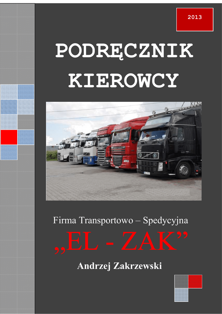 2013 PODRĘCZNIK KIEROWCY Firma Transportowo – Spedycyjna „EL - ZAK” Andrzej Zakrzewski 4|Strona TRANSPORT I SPEDYCJA MIĘDZYNARODOWA 43-150 BIERUŃ UL. SOSNOWA 13 Tel./Fax + 48 32 216 10 30, Tel. +48 601 98 78 38 NIP PL 646-10-40-911 Szanowni Kierowcy! Przeczytajcie Państwo uważnie nasz „Podręcznik Kierowcy”. Miejcie go zawsze przy sobie w kabinie samochodu i stosujcie się do zawartych w nim wytycznych. Jeżeli któreś z punktów nie są dla Państwa zrozumiałe, proszę się z nami skontaktować. SZEROKIEJ DROGI życzą Państwu pracownicy F.T.S. „EL-ZAK”. Służymy pomocą: Andrzej Zakrzewski +48 601 98 78 38 Elżbieta Zakrzewska +48 601 48 49 67 Żaneta Gładysz +48 691 556 988 Łukasz Gładysz +48 506 237 247 Sławomir Grubka +48 783 999 899 Biuro/Office Tel./Fax + 48 32 216 10 30 Adres email: [email protected] 2|Strona SPIS TREŚCI: Jesteście Państwo naszą wizytówką!.......................................................................... 5 Kontrola przed przystąpieniem do jazdy .................................................................. 5 Co sprawdzacie Państwo przed jazdą? ................................................................................................. 5 Dokumenty ........................................................................................................................................... 5 Pojazd ................................................................................................................................................... 6 Wyposażenie pojazdu ........................................................................................................................... 6 Osobiste wyposażenie ochronne .......................................................................................................... 7 Gotowy do jazdy? ................................................................................................................................. 7 Zlecenia transportowe .......................................................................................................................... 8 Jazda ............................................................................................................................. 8 Państwo ponosicie odpowiedzialność! ................................................................................................. 8 Defensywny i ekologiczny styl jazdy................................................................................................... 9 Defensywny styl jazdy ......................................................................................................................... 9 Ekologiczna jazda .............................................................................................................................. 10 Co daje defensywny i ekologiczny styl jazdy? .................................................................................. 11 Załadunek i rozładunek ............................................................................................ 11 Zgłoszenie się na załadunek/rozładunek ............................................................................................ 11 Potwierdzenie załadunku i rozładunku .............................................................................................. 12 Przepisy BHP w miejscach załadunku i wyładunku .......................................................................... 12 Bezpieczne i odpowiedzialne zachowanie ......................................................................................... 14 Zgłoszenie się na załadunek/rozładunek ............................................................................................ 15 Dokumenty ......................................................................................................................................... 15 3|Strona Dokumenty przewozowe na załadunku.............................................................................................. 15 Dokumenty przewozowe na rozładunku ............................................................................................ 16 Zabezpieczenie ładunku ..................................................................................................................... 17 Zachowanie się w przypadkach szkód i braków na załadunku i rozładunku ..................................... 18 Co kontroluję przy załadunku?........................................................................................................... 18 Co kontroluję przy rozładunku? ......................................................................................................... 18 Co robię w razie stwierdzenia uszkodzeń, braków i innych nieścisłości? ........................................ 18 Staranne obchodzenie się z towarem.................................................................................................. 19 Kontrola wagi ..................................................................................................................................... 19 Natychmiastowe zgłaszanie opóźnień/spóźnień ................................................................................ 19 W razie wypadku ....................................................................................................... 20 Uwagi szczególne ....................................................................................................... 20 Broń .................................................................................................................................................... 20 Problem z uchodźcami ....................................................................................................................... 20 Przemyt – Alkohol – Narkotyki ......................................................................................................... 21 Zachowanie tajemnicy firmy ...........