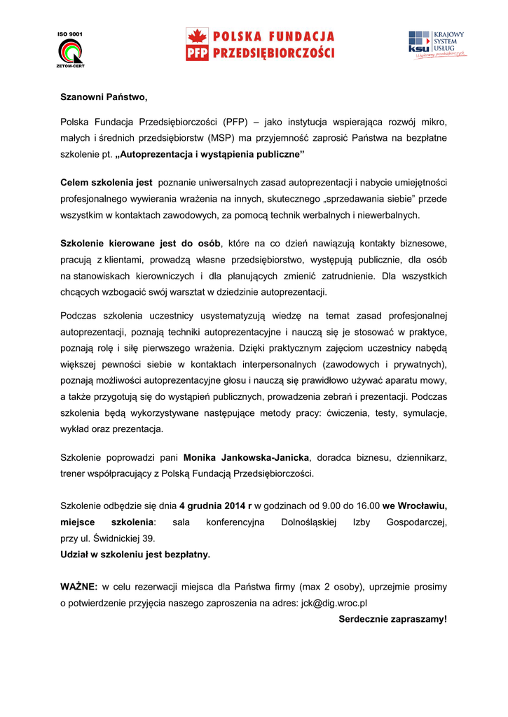 ISO 9001 ZETOM-CERT Szanowni Państwo, Polska Fundacja Przedsiębiorczości (PFP) – jako instytucja wspierająca rozwój mikro, małych i średnich przedsiębiorstw (MSP) ma przyjemność zaprosić Państwa na bezpłatne szkolenie pt. „Autoprezentacja i wystąpienia publiczne” Celem szkolenia jest poznanie uniwersalnych zasad autoprezentacji i nabycie umiejętności profesjonalnego wywierania wrażenia na innych, skutecznego „sprzedawania siebie” przede wszystkim w kontaktach zawodowych, za pomocą technik werbalnych i niewerbalnych. Szkolenie kierowane jest do osób, które na co dzień nawiązują kontakty biznesowe, pracują z klientami, prowadzą własne przedsiębiorstwo, występują publicznie, dla osób na stanowiskach kierowniczych i dla planujących zmienić zatrudnienie. Dla wszystkich chcących wzbogacić swój warsztat w dziedzinie autoprezentacji. Podczas szkolenia uczestnicy usystematyzują wiedzę na temat zasad profesjonalnej autoprezentacji, poznają techniki autoprezentacyjne i nauczą się je stosować w praktyce, poznają rolę i siłę pierwszego wrażenia. Dzięki praktycznym zajęciom uczestnicy nabędą większej pewności siebie w kontaktach interpersonalnych (zawodowych i prywatnych), poznają możliwości autoprezentacyjne głosu i nauczą się prawidłowo używać aparatu mowy, a także przygotują się do wystąpień publicznych, prowadzenia zebrań i prezentacji. Podczas szkolenia będą wykorzystywane następujące metody pracy: ćwiczenia, testy, symulacje, wykład oraz prezentacja. Szkolenie poprowadzi pani Monika Jankowska-Janicka, doradca biznesu, dziennikarz, trener współpracujący z Polską Fundacją Przedsiębiorczości. Szkolenie odbędzie się dnia 4 grudnia 2014 r w godzinach od 9.00 do 16.00 we Wrocławiu, miejsce szkolenia: sala konferencyjna Dolnośląskiej Izby Gospodarczej, przy ul. Świdnickiej 39. Udział w szkoleniu jest bezpłatny. WAŻNE: w celu rezerwacji miejsca dla Państwa firmy (max 2 osoby), uprzejmie prosimy o potwierdzenie przyjęcia naszego zaproszenia na adres: [email protected] Serdecznie zapraszamy! ISO 9001 ZETOM-CERT Program szkolenia „Autoprezentacja i wystąpienia publiczne” Temat zajęć Godzina 09.00 – 09.15 09.15 – 10.30 10.30 – 10.45 10.45 – 12.15 Powitanie uczestników i wprowadzenie Natura i rola autoprezentacji w życiu zawodowym i osobistym Definicja i motywy autoprezentacji Normy autoprezentacyjne: skromność, konsekwencja Siła pierwszego wrażenia. Drugie i trzecie wrażenie Atrakcyjność fizyczna i wygląd zewnętrzny Przerwa Taktyki autoprezentacyjne: werbalne i niewerbalne Opisywanie siebie i wyrażanie postaw – ćwiczenia Powitanie i przedstawienie się Zachowania niewerbalne: mowa ciała, gesty, mimika i uśmiech, sposób poruszania się, proksemika Głos jako narzędzie autoprezentacji: barwa, intonacja, dykcja, pewność siebie w głosie – ćwiczenia 12.15 – 12.45 Przerwa 12.45– 14.15 14.15 – 14.30 Przerwa 14.30 – 16.00 16.00 Budowanie własnego wizerunku a kontakty interpersonalne Umiejętność wzbudzania sympatii Dylemat autoprezentacyjny Kontakty społeczne: pławienie się w odbitym blasku, konformizm, uleganie Tarapaty autoprezentacyjne i sposoby na „ratowanie twarzy” Przygotowanie do wystąpień publicznych Cele wystąpień i planowanie przebiegu wystąpienia Trema i sposoby radzenia sobie ze zdenerwowaniem Postawa otwarta, panowanie nad ciałem i głosem Dynamika wystąpienia czyli jak wzbudzić i utrzymać zainteresowanie słuchaczy Określenie swoich mocnych i słabych stron, samoocena. Zakończenie szkolenia